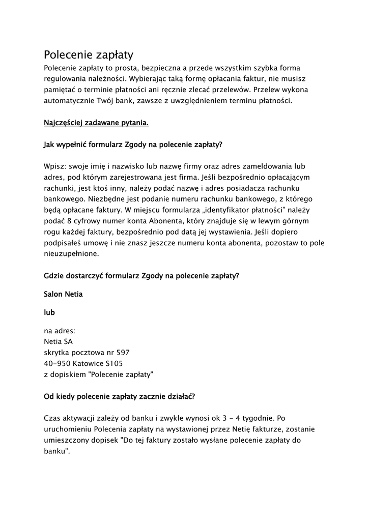 Polecenie zapłaty Polecenie zapłaty to prosta, bezpieczna a przede wszystkim szybka forma regulowania należności. Wybierając taką formę opłacania faktur, nie musisz pamiętać o terminie płatności ani ręcznie zlecać przelewów. Przelew wykona automatycznie Twój bank, zawsze z uwzględnieniem terminu płatności. Najczęściej zadawane pytania. Jak wypełnić formularz Zgody na polecenie zapłaty? Wpisz: swoje imię i nazwisko lub nazwę firmy oraz adres zameldowania lub adres, pod którym zarejestrowana jest firma. Jeśli bezpośrednio opłacającym rachunki, jest ktoś inny, należy podać nazwę i adres posiadacza rachunku bankowego. Niezbędne jest podanie numeru rachunku bankowego, z którego będą opłacane faktury. W miejscu formularza „identyfikator płatności” należy podać 8 cyfrowy numer konta Abonenta, który znajduje się w lewym górnym rogu każdej faktury, bezpośrednio pod datą jej wystawienia. Jeśli dopiero podpisałeś umowę i nie znasz jeszcze numeru konta abonenta, pozostaw to pole nieuzupełnione. Gdzie dostarczyć formularz Zgody na polecenie zapłaty? Salon Netia lub na adres: Netia SA skrytka pocztowa nr 597 40-950 Katowice S105 z dopiskiem "Polecenie zapłaty" Od kiedy polecenie zapłaty zacznie działać? Czas aktywacji zależy od banku i zwykle wynosi ok 3 - 4 tygodnie. Po uruchomieniu Polecenia zapłaty na wystawionej przez Netię fakturze, zostanie umieszczony dopisek "Do tej faktury zostało wysłane polecenie zapłaty do banku". Czym polecenie zapłaty różni się od zlecenia stałego? Polecenie zapłaty jest automatyczne więc w przeciwieństwie do zlecenia stałego, możesz mieć pewność że zadziała dokładnie w terminie płatności. Transakcję zrealizowaną przez Polecenie zapłaty, możesz również odwołać. Prowizja za polecenie zapłaty Część banków realizuje transakcje bezpłatnie, część pobiera za nie prowizję, opłata zwykle nie przekracza 1 zł. Czy polecenie zapłaty można zareklamować? Reklamacje dotyczące polecenia zapłaty należy zgłaszać w banku, ponieważ jest to usługa bankowa. Osoby prywatne w ciągu 30 dni kalendarzowych, a firmy w ciągu 5 dni roboczych mogą transakcję odwołać bez podania przyczyny. W celu odwołania transakcji należy skontaktować się z bankiem. Środki pieniężne zostaną natychmiast zwrócone jednak faktura będzie przez Netię traktowana jako nieopłacona. Co jeśli w terminie płatności, nie mam środków na rachunku? Trzykrotnie ponawiamy próby obciążenia rachunku bankowego, w 5, 15 i 25 dniu miesiąca, niezależnie od terminu płatności faktury. Jeżeli żadna z prób nie zakończy się pobraniem płatności, zaległą fakturę należy uregulować samodzielnie przelewem lub wpłatą gotówkową. Jak sprawdzić, czy faktury są opłacane poleceniem zapłaty? Na fakturach, które regulowane są przez polecenie zapłaty umieszczony jest dopisek "Do tej faktury zostało wysłane polecenie zapłaty do banku". Transakcje polecenia zapłaty widoczne są również na wyciągu bankowym. Co zrobić, gdy chcę zmienić bank? Należy wypełnić dwa formularze: formularz Cofnięcia Zgody dotyczący starego banku i Formularz Zgody dotyczący nowego banku (każdy formularz składa się z dwóch odcinków). Formularze należy wypełnić identycznie jak dotychczasowy formularz, ale w nowym formularzu Zgody trzeba podać nowy nr rachunku bankowego. Pozostałe dane pozostają bez zmian. Wszystkie formularze należy dostarczyć do Netii. Prawie każdy bank w Polsce obsługuje polecenie zapłaty. Czy można pobierać opłaty z rachunku osoby trzeciej? Tak, w formularzu „Zgody na obciążanie rachunku” proszę wypełnić nazwę i adres posiadacza rachunku. Dodatkowe informacje o Poleceniu zapłaty www.poleceniezaplaty.org.pl
