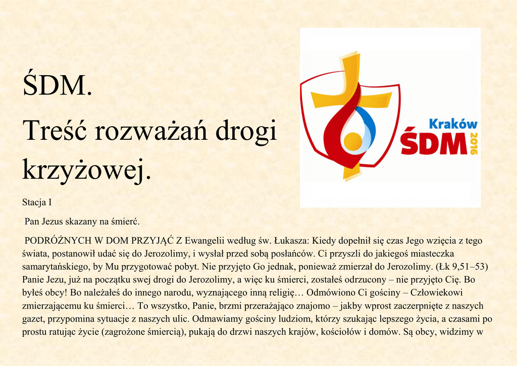 ŚDM. Treść rozważań drogi krzyżowej. Stacja I Pan Jezus skazany na śmierć. PODRÓŻNYCH W DOM PRZYJĄĆ Z Ewangelii według św. Łukasza: Kiedy dopełnił się czas Jego wzięcia z tego świata, postanowił udać się do Jerozolimy, i wysłał przed sobą posłańców. Ci przyszli do jakiegoś miasteczka samarytańskiego, by Mu przygotować pobyt. Nie przyjęto Go jednak, ponieważ zmierzał do Jerozolimy. (Łk 9,51–53) Panie Jezu, już na początku swej drogi do Jerozolimy, a więc ku śmierci, zostałeś odrzucony – nie przyjęto Cię. Bo byłeś obcy! Bo należałeś do innego narodu, wyznającego inną religię… Odmówiono Ci gościny – Człowiekowi zmierzającemu ku śmierci… To wszystko, Panie, brzmi przerażająco znajomo – jakby wprost zaczerpnięte z naszych gazet, przypomina sytuacje z naszych ulic. Odmawiamy gościny ludziom, którzy szukając lepszego życia, a czasami po prostu ratując życie (zagrożone śmiercią), pukają do drzwi naszych krajów, kościołów i domów. Są obcy, widzimy w nich wrogów, boimy się ich religii. I ich biedy! Zamiast gościny – znajdują śmierć: u wybrzeży Lampedusy, Grecji, w obozach dla uchodźców. Odmowa przyjęcia łatwo staje się prawdziwym wyrokiem śmierci. Na nich. A więc i na Ciebie! W ostatnich kilku latach zostałeś skazany na śmierć w osobach 30 tysięcy uchodźców. Skazany – przez kogo? Kto się podpisze pod tym wyrokiem? Jestem przybyszem – mówisz dzisiaj do nas – nie mam miejsca, gdzie bym głowę mógł oprzeć, urodziłem się w stajni – nieprzyjęty do gospody. Znam gorzki smak udawanej gościny – jak u faryzeusza Szymona, który nie podał Mi ani wody do nóg, ani oliwy na spieczoną upałem głowę. Przypominasz nam o uczniach z Emaus: gdy zaprosili „Nieznajomego” do stołu, otwarły się im oczy, i poznali… Ciebie! I my prosimy: otwórz nam oczy! Daj się rozpoznać! W przybyszach, którzy nagle znaleźli się obok nas. W bezdomnych, śpiących na naszych dworcach, w bramach naszych domów, w kanałach, pod mostami. Ty żyjesz – w każdym przybyszu. I królujesz – jako potrzebujący, na wieki wieków. Amen. Stacja II Jezus podejmuje krzyż GŁODNYCH NAKARMIĆ Z Ewangelii według św. Marka: Jezus ujrzał wielki tłum. Uczniowie rzekli: Odpraw ich! Niech idą do okolicznych osiedli i wsi, a kupią sobie coś do jedzenia. Lecz On im odpowiedział: Wy dajcie im jeść. Rzekli Mu: mamy za dwieście denarów kupić chleba, żeby im dać jeść? Spytał: Ile macie chlebów? Rzekli: Pięć i dwie ryby. (Mk 6,34–38) Czego najbardziej potrzebujemy, żeby zmierzyć się z krzyżem – np. z krzyżem głodu naszych sióstr i braci? Zwykle myślimy jak apostołowie: za dwieście denarów nie wystarczy chleba… Dwieście denarów! Siedmiomiesięczna pensja?! Skąd naraz wziąć taką sumę?! Ten krzyż nas przerasta… Pozornie bezradni, wynajdujemy rozwiązania przerzucające problem na innych: niech idą do okolicznych osiedli i wsi i kupią sobie. Ty jednak mówisz: Wy dajcie im jeść! I pytasz: Ile macie chlebów? Pytasz nie o to, czego nie mamy, lecz o to, co mamy! I czy potrafimy się podzielić tym, co mamy: pięcioma chlebami i dwiema rybami… Nie pytasz, czy to wystarczy dla tak wielu – pytasz, czy się tym podzielimy! I oto zaczynamy rozumieć. Skąd bierze się w świecie głód? Nie z braku chleba, lecz z braku solidarności. W naszym świecie nie brakuje chleba – 1/3 produkowanej żywności jest marnowana. Jednocześnie co 6 sekund umiera z głodu dziecko, a dzisiaj – tego wieczoru, blisko miliard ludzi na świecie nie wie, czy jutro będzie miało co jeść. Panie Jezu, chwalimy Cię za wszystkich, którzy niosą miłosierdzie głodnym siostrom i braciom. Dziękujemy za tych, którzy ślubują ubóstwo, by nieść pomoc jeszcze uboższym od siebie. Pokazują, że – aby pomagać – potrzeba nie tyle wielkich środków, co hojnego serca! Daj nam takie serce – solidarne i zdolne do podzielenia się, również ze swego niedostatku. Przywróć nam także zrozumienie dla postu – nie jako zdrowotnej diety, lecz rzeczywistej praktyki miłości. Na koniec prosimy za tych wszystkich, których krzyż pozwoliłeś nam dostrzec przy rozważaniu tej stacji – za głodujących i za umierających z głodu. Chlebie Żywy! Wspomóż ich! A nam… przebacz. Amen. Stacja III Pierwszy upadek GRZESZĄCYCH UPOMINAĆ Z Ewangelii według św. Marka: Przyszli do Jezusa z paralitykiem, którego niosło czterech. […] Jezus […] rzekł do paralityka: „Synu, odpuszczają ci się twoje grzechy”. [A następnie:] „Wstań, weź swoje łoże i idź do domu”. (Mk 2,3nn) Patrząc na Twój upadek, Jezu, myślę o swoich upadkach – o ciężkich grzechach, które zwaliły mnie z nóg. Już sama pamięć o nich mnie obezwładnia. Nie umiem o własnych siłach przyjść do Ciebie. Jestem sparaliżowany – bardziej niż tamten chory. On przynajmniej pozwolił sobie pomóc – przyjaciele przynieśli go do Ciebie. Ja uciekam z mym grzechem w samotność, upomnienie kwituję wzruszeniem ramion lub – częściej – agresją… Dziękuję, że dziś jestem tutaj i słyszę, co mówisz do tamtego sparaliżowanego grzesznika. Mówisz wpierw: synu (!), a potem dopiero: odpuszczają ci się twoje grzechy. Nie zaczynasz od grzechów. Nazywasz mnie „synem” – choć myślałem, że nie mam już do tego prawa: nie jestem już godzien nazywać się Twoim synem; uczyń mnie choćby jednym z najemników. Ty jednak mówisz: „Najemnik? – Nie! Nigdy!” – „Oto twój pierścień, sandały i szata!”. Tyle razy przeżyłem to w sakramencie pokuty. Nie upokorzenie, lecz odnalezienie własnej godności! Tyle razy podniosłeś mnie z ziemi! Panie Jezu, bądź uwielbiony w każdym konfesjonale świata. Pełen miłosierdzia. Przebaczający nie 7 i nie 77, ale 777 milionów razy. Niemęczący się przebaczeniem. Bądź takim w każdym spowiedniku! Spraw, by sakrament pokuty zawsze i dl
