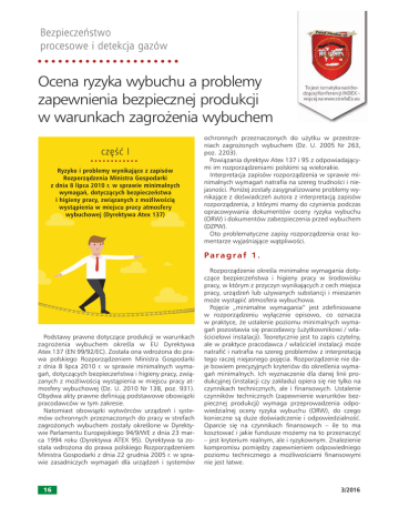 Ocena ryzyka wybuchu a problemy zapewnienia bezpiecznej produkcji w warunkach zagro˝enia wybuchem cz´Êç I Ryzyko i problemy wynikajàce z zapisów Rozporzàdzenia Ministra Gospodarki z dnia 8 lipca 2010 r. w sprawie minimalnych wymagaƒ, dotyczàcych bezpieczeƒstwa i higieny pracy, zwiàzanych z mo˝liwoÊcià wystàpienia w miejscu pracy atmosfery wybuchowej (Dyrektywa Atex 137) ochronnych przeznaczonych do u˝ytku w przestrzeniach zagro˝onych wybuchem (Dz. U. 2005 Nr 263, poz. 2203). Powiàzania dyrektyw Atex 137 i 95 z odpowiadajàcymi im rozporzàdzeniami polskimi sà wielorakie. Interpretacja zapisów rozporzàdzenia w sprawie minimalnych wymagaƒ natrafia na szereg trudnoÊci i niejasnoÊci. Poni˝ej zostały zasygnalizowane problemy wynikajàce z doÊwiadczeƒ autora z interpretacjà zapisów rozporzàdzenia, z którymi mamy do czynienia podczas opracowywania dokumentów oceny ryzyka wybuchu (ORW) i dokumentów zabezpieczenia przed wybuchem (DZPW). Oto problematyczne zapisy rozporzàdzenia oraz komentarze wyjaÊniajàce wàtpliwoÊci. Pa r a g r a f 1 . Podstawy prawne dotyczàce produkcji w warunkach zagro˝enia wybuchem okreÊla w EU Dyrektywa Atex 137 (EN 99/92/EC). Została ona wdro˝ona do prawa polskiego Rozporzàdzeniem Ministra Gospodarki z dnia 8 lipca 2010 r. w sprawie minimalnych wymagaƒ, dotyczàcych bezpieczeƒstwa i higieny pracy, zwiàzanych z mo˝liwoÊcià wystàpienia w miejscu pracy atmosfery wybuchowej (Dz. U. 2010 Nr 138, poz. 931). Obydwa akty prawne definiujà podstawowe obowiàzki pracodawców w tym zakresie. Natomiast obowiàzki wytwórców urzàdzeƒ i systemów ochronnych przeznaczonych do pracy w strefach zagro˝onych wybuchem zostały okreÊlone w Dyrektywie Parlamentu Europejskiego 94/9/WE z dnia 23 marca 1994 roku (Dyrektywa ATEX 95). Dyrektywa ta została wdro˝ona do prawa polskiego Rozporzàdzeniem Ministra Gospodarki z dnia 22 grudnia 2005 r. w sprawie zasadniczych wymagaƒ dla urzàdzeƒ i systemów 16 Rozporzàdzenie okreÊla minimalne wymagania dotyczàce bezpieczeƒstwa i higieny pracy w Êrodowisku pracy, w którym z przyczyn wynikajàcych z cech miejsca pracy, urzàdzeƒ lub u˝ywanych substancji i mieszanin mo˝e wystàpiç atmosfera wybuchowa. Poj´cie „minimalne wymagania” jest zdefiniowane w rozporzàdzeniu wyłàcznie opisowo, co oznacza w praktyce, ˝e ustalenie poziomu minimalnych wymagaƒ pozostawia si´ pracodawcy (u˝ytkownikowi / właÊcicielowi instalacji). Teoretycznie jest to zapis czytelny, ale w praktyce pracodawca / właÊciciel instalacji mo˝e natrafiç i natrafia na szereg problemów z interpretacjà tego raczej niejasnego poj´cia. Rozporzàdzenie nie daje bowiem precyzyjnych kryteriów do okreÊlenia wymagaƒ minimalnych. Ich wyznaczenie dla danej linii produkcyjnej (instalacji czy zakładu) opiera si´ nie tylko na czynnikach technicznych, ale i finansowych. Ustalenie czynników technicznych (zapewnienie warunków bezpiecznej produkcji) wymaga przeprowadzenia odpowiedzialnej oceny ryzyka wybuchu (ORW), do czego konieczne sà du˝e doÊwiadczenie i odpowiedzialnoÊç. Oparcie si´ na czynnikach finansowych – ile to ma kosztowaç i jakie fundusze mo˝emy na to przeznaczyç – jest kryterium realnym, ale i ryzykownym. Znalezienie kompromisu pomi´dzy zapewnieniem odpowiedniego poziomu technicznego a mo˝liwoÊciami finansowymi nie jest łatwe. 3/2016 dr hab. in˝ Andrzej Wolff Ekspert w dziedzinie bezpieczeƒstwa procesowego i wybuchowego, GRUPA WOLFF Spełnienie minimalnych wymagaƒ jest w praktyce realizowane w istotnym stopniu poprzez zapewnienie bezpieczeƒstwa procesowego i wybuchowego. Jednak problem polega na tym, ˝e nie przyczynia si´ ono do dodatkowej produkcji (zysków), a wymaga nakładów finansowych. Pa r a g r a f 2 . Paragraf ten definiuje podstawowe poj´cia: urzàdzenia, przestrzenie zagro˝one (i niezagro˝one) wybuchem, substancja palna, atmosfera wybuchowa, normalne działanie urzàdzenia / systemu ochronnego, osoby pracujàce, inne. Atmosfera wybuchowa jest definiowana jako mieszanina z powietrzem w warunkach atmosferycznych substancji palnych w postaci gazów, par, mgieł lub pyłów, w której po wystàpieniu zapłonu spalanie rozprzestrzenia si´ samorzutnie na całà mieszanin´. Definicja ta odnosi si´ do standardowych warunków atmosferycznych (temperatura od –25 do +60ºC, ciÊnienie od 0,8 do 1,1 bara, powietrze z normalnà zawartoÊcià tlenu, typowo 21% obj.). A co ma zrobiç pracodawca/właÊciciel instalacji, gdy warunki procesowe instalacji odbiegajà istotnie od atmosferycznych? W przemyÊle mamy przecie˝ do czynienia z wieloma procesami, które przebiegajà pod ciÊnieniem / pró˝nià, wysokà/niskà temperaturà. Nie oznacza to jednak, ˝e pracodawca jest w takich przypadkach zwolniony z obowiàzku spełnienia wymagaƒ w zakresie ochrony przed wybuchem. Pracodawca musi zapewniç bezpieczne warunki pracy w ka˝dych warunkach! Rozporzàdzenie nie daje jednak w tym zakresie ˝adnych rekomendacji, jak powinien on post´powaç. Pa r a g r a f 4 . 1 . Paragraf stwierdza, ˝e aby zapobiegaç wybuchom i zapewniç ochron´ przed ich skutkami, pracodawca powinien stosowaç, odpowiednie do rodzaju działalnoÊci, techniczne i organizacyjne Êrodki ochronne. OkreÊlajàc Êrodki ochronne, nale˝y zapewniç realizacj´ nast´pujàcych celów w podanej kolejnoÊci: – zapobieganie tworzenia si´ atmosfery wybuchowej (A), 3/2016 – zapobieganie wystàpienia zapłonu atmosfery wybuchowej (B), – ograniczenie szkodliwego efektu wybuchu, w celu zapewnienia ochrony zdrowia i bezpieczeƒstwa osób pracujàcych (C). Tak zdefiniowane cele sà jasne. Ale ich praktyczna realizacja natrafia na szereg problemów. Jak bowiem zapobiec tworzeniu si´ atmosfery wybuchowej w procesach przemysłowych, w których z natury rzeczy mamy do czynienia z obecnoÊcià tlenu zawartego w powietrzu? Dotyczy to przecie˝ zdecydowanej wi´kszoÊci procesów przemysłowych. Istniejà, co prawda, w tym zakr