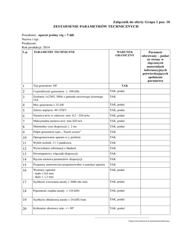 Załącznik do oferty Grupa 1 poz. 10 ZESTAWIENIE PARAMETRÓW TECHNICZNYCH Przedmiot: aparat jezdny rtg – 1 szt. Nazwa i typ: Producent: Rok produkcji: 2014 L.p. PARAMETRY TECHNICZNE WARUNEK GRANICZNY 1 Typ generatora HF 2 Częstotliwość generatora 100 kHz TAK, podać 3 Zasilanie 1x230V, 50Hz z gniazda sieciowego ściennego 16A TAK 4 Moc generatora 32 kW TAK, podać 5 Zakres napięcia: 40-125kV TAK, podać 6 Nastawa mAs w zakresie: min. 0,2 - 220 mAs TAK, podać 7 Maksymalna nastawa mA: min 420 mA TAK, podać 8 Minimalny czas ekspozycji ≤ 2 ms TAK, podać 9 Pulpit generatora typu „ Touch screen” TAK 10 Oprogramowanie aparatu w j. polskim TAK 11 Wybór technik :2 i 3 punktowa TAK 12 Wyświetlanie informacji o błędach TAK 13 Dwustopniowy włącznik ekspozycji TAK 14 Ręczna nastawa parametrów ekspozycji TAK 15 Programy anatomiczne programowalne w pamięci aparatu TAK 16 Wymiary ogniska: - małe 0,6 mm - duże 1,3 mm TAK, podać 17 Szybkość wirowania anody 3000 obr./min TAK, podać 18 Pojemność cieplna anody 110 kHU TAK, podać 19 Szybkość chłodzenia anody 24 kHU/min TAK, podać 20 Kolimator obrotowy min. +/- 900 TAK, podać Parametr oferowany – podać nr strony w złączonych materiałach informacyjnych potwierdzających spełnienie parametru TAK ................................................................ Podpisy osób uprawnionych do reprezentowania Wykonawcy. 21 Zabezpieczenie lampy przed przegrzaniem TAK 22 Waga aparatu ≤ 180 kg TAK, podać 23 Szerokość aparatu: 630 mm TAK, podać Kasety i płyty obrazowe - 3 szt. 24 Producent podać 25 Nazwa i typ podać 26 Gwarantowana trwałość płyty obrazowej - ilość cykli odczytu i kasowania min. 40 000 Tak, podać ilość cykli 27 Kaseta do badań ogólnodiagnostycznych z płytą obrazową formatu 35x43cm, skanowanie z rozdzielczością min. 10 pikseli/mm – 2 szt. Tak, podać ilość pikseli/mm 28 Kasety nie zintegrowane z płytą obrazową – możliwość niezależnej wymiany płyt obrazowych i kaset TAK Stacja 29 System operacyjny: Windows 7 Home Premium + Office TAK, opisać 2013 H&B PKC, wersja systemu operacyjnego: 64 – bity, klasa procesora: IntelCore i5, kod procesora: 4200M, częstotliwość taktowania procesora: 2,5 GHz, częstotliwość taktowania procesora ( TurboBoost ): 3,1 GHz, ilość rdzeni: 2 szt., ilość wątków: 4 szt., pamięć podręczna: 3 MB chipset: Intel HM86, pamięć operacyjna RAM: 12288 MB, typ pamięci RAM: SO-DIMM DDR3, pojemność dysku: 1000 GB, typ dysku: SSHD ( hybrydowy ), wbudowana pamięć Flash: 8 GB, przekątna ekranu: 17,3” typ ekranu: błyszczący z podświetleniem LED, typ matrycy: błyszcząca, maksymalna rozdzielczość matrycy: 1920 x 1080 px, rodzaj karty graficznej: dedykowana, producent karty graficznej: NVIDIA, seria karty graficznej: GeForce GT 745M, model karty graficznej: NVIDIA®GeForce®GT 745M, pamięć karty graficznej: 2048 MB, wbudowany napęd optyczny: DVD+/- RW DL Super Multi, złącza zewnętrzne: HDMI, czytnik kart pamięci, USB 3,0, Combo Jack 3,5 mm, USB 2,0, RJ – 45, VGA, ilość portów USB 2,0: 2 szt., ilość portów USB 3,0: 2 szt., bluetooth: tak, HDMI: tak, czytnik kart pamięci: SD, MMC, komunikacja: bezprzewodowa, bluetooth, przewodowa, komunikacja bezprzewodowa WLAN: IEEE 802,11 b/g/n, komunikacja przewodowa LAN: 10, 100, 1000 Mbps, podświetlane klawisze, wbudowana kamera, urządzenie wskazujące, klawiatura numeryczna, ilość ogniw baterii: 4 szt. ................................................................ Podpisy osób uprawnionych do reprezentowania Wykonawcy.