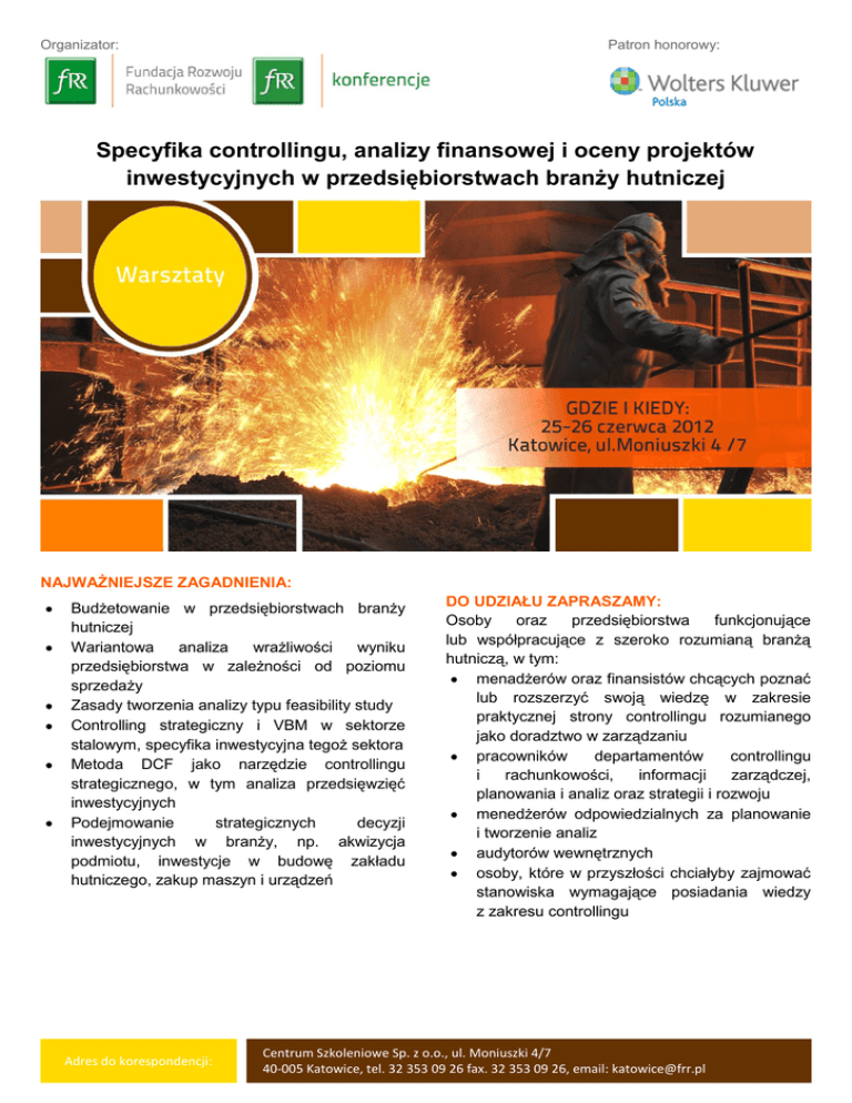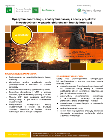 Organizator: Patron honorowy: Specyfika controllingu, analizy finansowej i oceny projektów inwestycyjnych w przedsiębiorstwach branży hutniczej NAJWAŻNIEJSZE ZAGADNIENIA: Budżetowanie w przedsiębiorstwach branży hutniczej Wariantowa analiza wrażliwości wyniku przedsiębiorstwa w zależności od poziomu sprzedaży Zasady tworzenia analizy typu feasibility study Controlling strategiczny i VBM w sektorze stalowym, specyfika inwestycyjna tegoż sektora Metoda DCF jako narzędzie controllingu strategicznego, w tym analiza przedsięwzięć inwestycyjnych Podejmowanie strategicznych decyzji inwestycyjnych w branży, np. akwizycja podmiotu, inwestycje w budowę zakładu hutniczego, zakup maszyn i urządzeń Adres do korespondencji: DO UDZIAŁU ZAPRASZAMY: Osoby oraz przedsiębiorstwa funkcjonujące lub współpracujące z szeroko rozumianą branżą hutniczą, w tym: menadżerów oraz finansistów chcących poznać lub rozszerzyć swoją wiedzę w zakresie praktycznej strony controllingu rozumianego jako doradztwo w zarządzaniu pracowników departamentów controllingu i rachunkowości, informacji zarządczej, planowania i analiz oraz strategii i rozwoju menedżerów odpowiedzialnych za planowanie i tworzenie analiz audytorów wewnętrznych osoby, które w przyszłości chciałyby zajmować stanowiska wymagające posiadania wiedzy z zakresu controllingu Centrum Szkoleniowe Sp. z o.o., ul. Moniuszki 4/7 40-005 Katowice, tel. 32 353 09 26 fax. 32 353 09 26, email: [email protected] Specyfika controllingu, analizy finansowej i oceny projektów inwestycyjnych w przedsiębiorstwach branży hutniczej Warsztaty Katowice, 25-26.06.2012 r. Szanowni Państwo, Centrum Szkoleniowe Sp. z o. o., firma z grupy Fundacji Rozwoju Rachunkowości w Polsce organizuje warsztaty pn.: „Specyfika controllingu, analizy finansowej i oceny projektów inwestycyjnych w przedsiębiorstwach branży hutniczej”. Warsztaty odbędą się w dniach 25-26.06.2012 r. w Katowicach w siedzibie Centrum Szkoleniowego przy ul. Moniuszki 4/7. Celem warsztatów jest dostarczenie Uczestnikom praktycznej wiedzy z zakresu wykorzystania metod controllingu do budowania modeli zarządzania przedsiębiorstwem oraz kontroli finansowej. W trakcie warsztatów będą mieli Państwo możliwość: wymiany doświadczeń zawodowych poznania skutecznych metod i technik umożliwiających budowę efektywnego systemu controllingu w praktyce usystematyzowania wiedzy na temat controllingu diagnozowania i przedstawiania finansowego obrazu przedsiębiorstwa, wyliczania progów rentowności, podejmowania decyzji inwestycyjnych, radzenia sobie z problemami wąskich gardeł dostępności zasobów kierowania pytań do Eksperta Udział w warsztacie zapewni Państwu uzyskanie praktycznych umiejętności wykorzystywania instrumentów controllingu w codziennej działalności biznesowej. Serdecznie zapraszam do uczestnictwa w warsztatach wierząc, iż informacje przekazane przez Eksperta i możliwość wymiany doświadczeń przyczynią się do efektywnego wykorzystania zdobytej wiedzy w praktyce. Z poważaniem, Olga Karwaczyńska Dyrektor Oddziału w Katowicach [email protected] Adres do korespondencji: Centrum Szkoleniowe Sp. z o.o., ul. Moniuszki 4/7 40-005 Katowice, tel. 32 353 09 26 fax. 32 353 09 26, email: [email protected] Specyfika controllingu, analizy finansowej i oceny projektów inwestycyjnych w przedsiębiorstwach branży hutniczej Program Katowice, 25-26.06.2012 r. I Dzień, 25.06.2012 r. 8.30-9.00 Rejestracja, powitalna kawa 9.00-10.00 Controlling operacyjny, wprowadzenie teoretyczne: Pojęcie controllingu, jego cel, funkcje i zadania Koszty stałe i koszty zmienne w przedsiębiorstwie Metody liczenia progu rentowności ilościowego i wartościowego Specyfika controllingu w przedsiębiorstwach branży hutniczej Budżetowanie w przedsiębiorstwach branży hutniczej 10.00 – 11.30 Część praktyczna: Decyzje produktowe Próg rentowności ilościowy Próg rentowności wartościowy Badanie zmienności kosztów i budowa rachunku controllingowego Wariantowa analiza wrażliwości wyniku przedsiębiorstwa w zależności od poziomu sprzedaży Decyzje w warunkach istnienia wąskich gardeł dostępności zasobów 11.30-11.45 Przerwa kawowa 11.45-12.30 Analiza finansowa, wprowadzenie teoretyczne: Wskaźniki rentowności operacyjnej Wskaźniki rentowności majątku i kapitału Wskaźniki płynności Srebrna zasada finansowania Cykle obrotu i zapotrzebowanie na kapitał obrotowy Wskaźniki rozwoju Wskaźniki zadłużenia 13.00-14.00 Lunch 14.00-15.45 Część praktyczna (zadania MS Excel): 15.45 Wykonanie analizy wskaźnikowej przedsiębiorstwa branży hutniczej funkcjonującego na Giełdzie Papierów Wartościowych w Warszawie, ew. publikującego swoje dane finansowe z własnej inicjatywy Obraz graficzny analizy Przełożenia analizy na rating i klasyfikację do grupy ryzyka Wykorzystanie modelu do oceny: Własnego przedsiębiorstwa Obecnych Klientów Potencjalnych Klientów Spółek grupy kapitałowej Zakończenie pierwszego dnia warsztatów Adres do korespondencji: Centrum Szkoleniowe Sp. z o.o., ul. Moniuszki 4/7 40-005 Katowice, tel. 32 353 09 26 fax. 32 353 09 26, email: [email protected] Specyfika controllingu, analizy finansowej i oceny projektów inwestycyjnych w przedsiębiorstwach branży hutniczej Program Katowice, 25-26.06.2012 r. II Dzień, 26.06.2012 r. 8.30-9.00 Rejestracja, powitalna kawa 9.00-11.30 Controlling strategiczny, wprowadzenie teoretyczne: Controlling strategiczny i VBM w sektorze hutniczym, specyfika inwestycyjna tegoż sektora Wskaźniki istotne z punktu widzenia controllingu strategicznego (ROE, ROA, ROI, EVA) Metoda DCF jako narzędzie controllingu strategicznego, w tym analiza przedsięwzięć inwestycyjnych Wskaźniki istotne dla metody DCF (NPV, IRR, DPP) Zasady tworzenia analizy typu feasibility study Strategiczna karta wyników w przedsiębiorstwach branży hutniczej 11.30-11.45 Przerwa kawowa 11.45-13.00 Część prakty