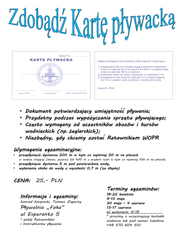 Seria P nr ….................... KARTA PŁYWACKA Osoba posiadająca karto pływacką zdała egzamin obejmujący: 1) przepłyniecie 200 m w wodzie stojącej dowolnym sposobem, w tym co najmniej 50 m na plecach lub 400 m z prądem wody, w tym co najmniej 100 m na plecach; 2) wykonanie skoku do wody z wysokości co najmniej 0.7 m; 3) przepłyniecie pod wodą co najmniej 5 m w wodzie stojącej lub 15 m z prądem wody po starcie z powierzchni wody. …...................................................................... Imię i nazwisko pieczęć WOPR ● ● ● data wystawienia …....................... Cena 25,- PLN podpis i pieczęć egzaminatora ~ ˛ umiejetnosc Dokument potwierdzajacy ˛ plywania; . ˛ plywajacego; ˛ ~ Przydatny podczas wypozyczania sprzetu ˛ Czesto wymagany od uczestników obozów i kursów . wodniackich (np. zeglarskich); ˛ Niezbedny, gdy chcemy zostac Ratownikiem WOPR ' ● …....................... '' …....................... Wymagania egzaminacyjne: ● ~ ˛ przeplyniecie dystansu 200 m w tym co najmniej 50 m na plecach ˛ w wodzie stojacej ˛ (basen, jezioro) lub 400 m z pradem rzeki w tym co najmniej 100 m na plecach, ● ~ ˛ przeplyniecie dystansu 5 m pod powierzchnia˛ wody, ~ wykonanie skoku do wody z wysokosci 0,7 m (ze slupka) ' ● CENA: 25,- PLN Informacja i egzaminy: Konrad Karpinski, Tomasz Zaparty Plywalnia „Foka” ~ ul Esperanto 5 * pokój Ratowników ~ i Instruktorów plywania Terminy egzaminów: 18-22 kwietnia 9-13 maja 30 maja – 4 czerwca 13-17 czerwca W godzinach: 6-18 * prosimy o wczesniejszy kontakt osobiscie lub pod numer telefonu +48 570 604 510
