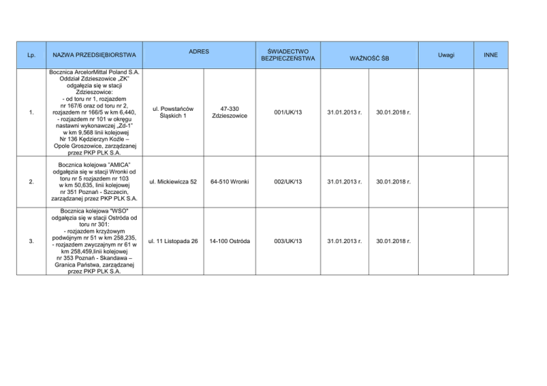 ŚWIADECTWO BEZPIECZEŃSTWA ADRES Lp. NAZWA PRZEDSIĘBIORSTWA 1. Bocznica ArcelorMittal Poland S.A. Oddział Zdzieszowice „ZK” odgałęzia się w stacji Zdzieszowice: - od toru nr 1, rozjazdem nr 167/6 oraz od toru nr 2, rozjazdem nr 166/5 w km 6,440, - rozjazdem nr 101 w okręgu nastawni wykonawczej „Zd-1” w km 9,568 linii kolejowej Nr 136 Kędzierzyn Koźle – Opole Groszowice, zarządzanej przez PKP PLK S.A. ul. Powstańców Śląskich 1 47-330 Zdzieszowice 001/UK/13 31.01.2013 r. 30.01.2018 r. 2. Bocznica kolejowa ”AMICA” odgałęzia się w stacji Wronki od toru nr 5 rozjazdem nr 103 w km 50,635, linii kolejowej nr 351 Poznań - Szczecin, zarządzanej przez PKP PLK S.A. ul. Mickiewicza 52 64-510 Wronki 002/UK/13 31.01.2013 r. 30.01.2018 r. 3. Bocznica kolejowa "WSO" odgałęzia się w stacji Ostróda od toru nr 301: - rozjazdem krzyżowym podwójnym nr 51 w km 258,235, - rozjazdem zwyczajnym nr 61 w km 258,459,linii kolejowej nr 353 Poznań - Skandawa – Granica Państwa, zarządzanej przez PKP PLK S.A. ul. 11 Listopada 26 14-100 Ostróda 003/UK/13 31.01.2013 r. 30.01.2018 r. WAŻNOŚĆ ŚB Uwagi INNE Bocznica kolejowa BRAVET Sp. z o.o. odgałęzia się od toru dojazdowego nr 101 rozjazdem nr 101 w km 2,553. Tor dojazdowy nr 101 odgałęzia się w stacji Otmuchów od toru nr 1 rozjazdem nr 1 w km 1,055 linii kolejowej nr 137 Katowice – Legnica, zarządzanej przez PKP PLK S.A. ul. Jana Pawła II 61 C/304 01-031 Warszawa 004/UK/13 31.01.2013 r. 30.01.2018 r. 5. Bocznica kolejowa „TanQuid” odgałęzia się w stacji Piekary Śląskie Szarlej od toru nr 4 rozjazdem nr 22 w km 13,149 linii kolejowej nr 131 Chorzów Batory Tczew, zarządzanej przez PKP PLK S.A. ul. Zofii Nałkowskiej 51 41 - 922 Radzionków 005/UK/13 31.01.2013 r. 30.01.2018 r. 6. Bocznica P.W. „ATEX” Sp. z o.o. odgałęzia się od toru dojazdowego nr 102 rozjazdem nr 701 w km 12,742. Tor dojazdowy nr 102 odgałęzia się od toru szlakowego Zamość – Jarosławiec rozjazdem nr 601 w km 11,030 linii kolejowej nr 72 Zawada – Hrubieszów Miasto, zarządzanej przez PKP PLK S.A. ul. Hrubieszowska 173 22 - 400 Zamość 006/UK/13 31.01.2013 r. 30.01.2018 r. 7. Bocznica kolejowa WBK – 812 odgałęzia się w stacji Świnoujście Przytor od toru nr 1 rozjazdem nr 6 w km 94,700 linii kolejowej nr 401 Szczecin Dąbie – Świnoujście Port, zarządzanej przez PKP PLK S.A. ul. Steyera 14 72-600 Świnoujście 007/UK/13 31.01.2013 r. 30.01.2018 r. 4. 8. Bocznica kolejowa CNH Polska Sp. z o.o. stanowi przedłużenie toru nr 102 bocznicy Mostostal Płock S.A. – Grupa Mostostal Warszawa S.A., która odgałęzia się w stacji Płock od toru nr 201 rozjazdem nr 101 w km 52,553 linii kolejowej nr 33 Kutno – Brodnica, zarządzanej przez PKP PLK S.A. Początkiem bocznicy jest brama wjazdowa usytuowana w torze nr 102, za rozjazdem nr 102. ul. Otolińska 25 09-407 Płock 008/UK/13 31.01.2013 r. 30.01.2018 r. 9. Bocznica kolejowa „Dalkia” odgałęzia się w stacji Świdnik od toru nr 14 rozjazdem nr 29 w km 185,826 linii kolejowej nr 7 Warszawa Wschodnia Osobowa - Dorohusk, zarządzanej przez PKP PLK S.A. ul. Żwirki i Wigury 1 21-045 Świdnik 009/UK/13 31.01.2013 r. 30.01.2018 r. 10. Bocznica kolejowa ,,DYNEA” odgałęzia się w stacji Trzemeszno od toru nr 7 rozjazdem nr 13 w km 59,650 linii kolejowej nr 353 Poznań Wschód – Skandawa, zarządzanej przez PKP PLK S.A. ul. Fabryczna 4 62-240 Trzemeszno 010/UK/13 31.01.2013 r. 30.01.2018 r. 11. Bocznica kolejowa ,,ELEWARR” Sp. z o.o. odgałęzia się w stacji Wąbrzeźno od toru nr 44 rozjazdem nr 27 w km 175,238 linii kolejowej nr 353 Poznań - Skandawa, zarządzanej przez PKP PLK S.A. ul. Bielska 2a 09 – 412 Nowe Proboszczewice 011/UK/13 01.03.2013 r. 28.02. 2018 r. przedłużenie świadectwa bezpieczeństwa dla użytkownika bocznicy kolejowej nr 013/UK/08 z dnia 26.02.2008 r. przedmiotowe świadectwo obowiązuje od dnia 01 marca 2013 r. 12. Bocznica „Fiat Auto Poland S.A.” jest bocznicą szlakową odgałęziającą się na szlaku Bieruń Stary - Lędziny, rozjazdem zwyczajnym nr 3 w km 16,029 linii kolejowej nr 179 Tychy - Mysłowice Kosztowy MKSB1 zarządzanej przez PKP PLK S.A. ul. Turyńska 100 43-100 Tychy 012/UK/13 26.02.2013 r. 25.02.2018 r. 13. Wojskowa bocznica kolejowa "WBK 165" odgałęzia się w stacji Łask od toru nr 100 rozjazdem zwyczajnym nr 32 w km 29,983 linii kolejowej nr 14 Łódź Kaliska -Tuplice, zarządzanej przez PKP PLK S.A. ul. 9 Maja 95 90 - 108 Łask 013/UK/13 01.03.2013 r. 28.02.2018 r. 14. Bocznica kolejowa „PANMAR” Sp. Jawna odgałęzia się w stacji Krosno od toru nr 7 rozjazdem nr 13 w km 68,586 linii kolejowej nr 108 Stróże – Krościenko, zarządzanej przez PKP PLK S.A. ul. Podkarpacka 16B 38-400 Krosno 014/UK/13 26.02.2013 r. 25.02.2018 r. 15. Wojskowa bocznica kolejowa "Wbk 406" odgałęzia się w stacji Tarnowskie Góry od toru nr 406 rozjazdem nr 351 w km 35,400 linii kolejowej nr 131 Chorzów Batory - Tczew, zarządzanej przez PKP PLK S.A. ul. Gen. Andersa 47 44-121 Gliwice Nr 015/UK/13 26.02.2013 r. 25.02.2018 r. przedłużenie świadectwa bezpieczeństwa dla użytkownika bocznicy kolejowej nr 014/UK/08 z dnia 26.02.2008 r. przedmiotowe świadectwo obowiązuje od dnia 01 marca 2013 r. 16. Bocznica kolejowa „PEC” odgałęzia się w stacji Police od toru nr 6 rozjazdem nr 101 w km 23,591 linii kolejowej nr 406 Szczecin Główny – Trzebież Szczeciński, zarządzanej przez PKP PLK S.A. ul. Bankowa 18 72-010 Police 016/UK/13 27.02.2013 r. 26.02.2018 r. 17. Bocznica kolejowa „Cukrownia Miejska Górka" odgałęzia się w stacji Miejska Górka od toru nr 1 rozjazdem nr 21 w km 0,613 linii kolejowej nr 366 Miejska Górka Kościan, zarządzanej przez PKP PLK S.A. ul. Mickiewicza 35 60-959 Poznań 017/UK/13 27.02.2013 r. 26.02.2018 r. 18. Bocznica kolejowa „MEGATEM EC-LUBLIN” odgałęzia się w stacji Lublin Tatary od toru nr 802 rozjazdem nr 701 w km 4,552 linii kolejowej nr 067 Lublin – Świdni