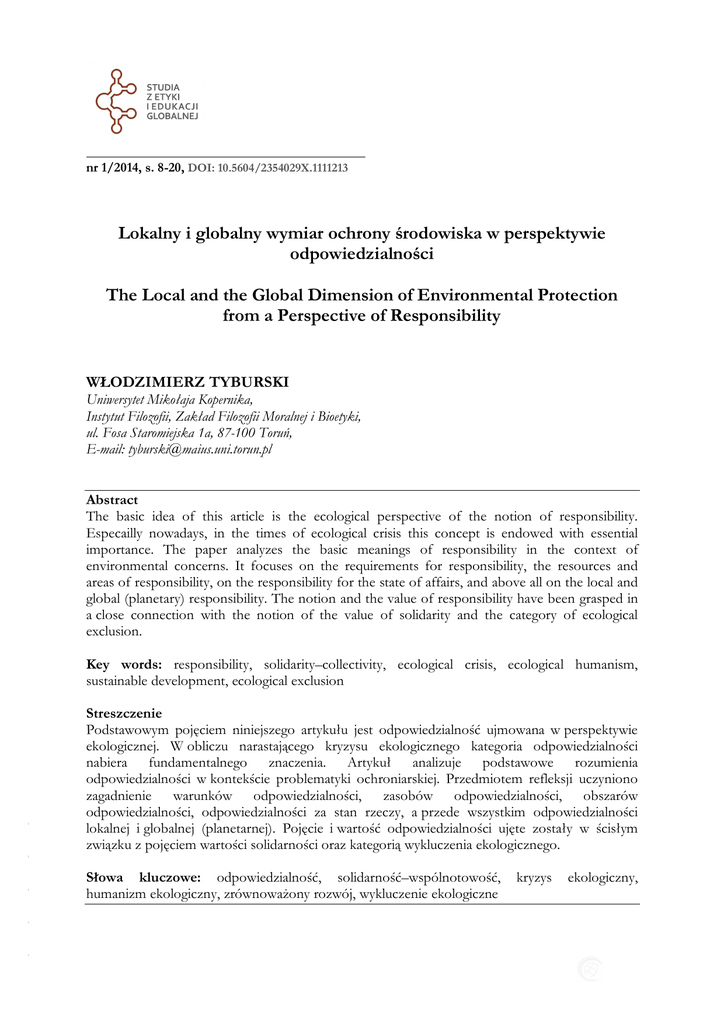 nr 1/2014, s. 8-20, DOI: 10.5604/2354029X.1111213 Lokalny i globalny wymiar ochrony środowiska w perspektywie odpowiedzialności The Local and the Global Dimension of Environmental Protection from a Perspective of Responsibility WŁODZIMIERZ TYBURSKI Uniwersytet Mikołaja Kopernika, Instytut Filozofii, Zakład Filozofii Moralnej i Bioetyki, ul. Fosa Staromiejska 1a, 87-100 Toruń, E-mail: [email protected] Abstract The basic idea of this article is the ecological perspective of the notion of responsibility. Especailly nowadays, in the times of ecological crisis this concept is endowed with essential importance. The paper analyzes the basic meanings of responsibility in the context of environmental concerns. It focuses on the requirements for responsibility, the resources and areas of responsibility, on the responsibility for the state of affairs, and above all on the local and global (planetary) responsibility. The notion and the value of responsibility have been grasped in a close connection with the notion of the value of solidarity and the category of ecological exclusion. Streszczenie Podstawowym pojęciem niniejszego artykułu jest odpowiedzialność ujmowana w perspektywie ekologicznej. W obliczu narastającego kryzysu ekologicznego kategoria odpowiedzialności nabiera fundamentalnego znaczenia. Artykuł analizuje podstawowe rozumienia odpowiedzialności w kontekście problematyki ochroniarskiej. Przedmiotem refleksji uczyniono zagadnienie warunków odpowiedzialności, zasobów odpowiedzialności, obszarów odpowiedzialności, odpowiedzialności za stan rzeczy, a przede wszystkim odpowiedzialności lokalnej i globalnej (planetarnej). Pojęcie i wartość odpowiedzialności ujęte zostały w ścisłym związku z pojęciem wartości solidarności oraz kategorią wykluczenia ekologicznego. - - - - - Key words: responsibility, solidarity–collectivity, ecological crisis, ecological humanism, sustainable development, ecological exclusion Słowa kluczowe: odpowiedzialność, solidarność–wspólnotowość, humanizm ekologiczny, zrównoważony rozwój, wykluczenie ekologiczne kryzys ekologiczny, Tyburski/Studia z Etyki i Edukacji Globalnej/ nr 1/2014, s. 8-20 Budząca głęboki niepokój w wymiarze globalnym oraz często dramatyczna w skali lokalnej i regionalnej sytuacja ekologiczna świata – jak również potwierdzająca to zgromadzona wiedza – pozwala wnioskować, że cywilizacja zachodnia jest raczej mało przyjazna dla przyrody. Z reguły traktowała ją jako niewyczerpany zasób dóbr służących jej autonomicznemu rozwojowi. Nie jest więc przesadą stwierdzenie, że do świata przyrody odnosiła się najczęściej z perspektywy instrumentalno-utylitarnej. U podstaw takiego nastawienia znajdowały się określone przesłanki natury filozoficznej, aksjologicznej, społecznej, gospodarczej – uzasadniające eksploatatorski stosunek człowieka wobec swego naturalnego otoczenia. Jednak negatywne doświadczenia ostatniego stulecia, zwłaszcza zaś widmo nadciągającego globalnego kryzysu ekologicznego, zmuszają do rewizji tego myślenia, które wyznaczało dotychczasowy kierunek rozwoju cywilizacji. Ufundowane ono było na paradygmacie pozytywistyczno-technokratycznym, zaś oparty na jego przesłaniach postęp naukowo-technologiczny ujawnił z czasem swe Janusowe oblicze. Cywilizacyjno-techniczne sukcesy człowieka okazywały się bardzo często klęską przyrody. W miarę budowania obecnego kształtu cywilizacji, tworzenia dóbr materialnych i technicznych oraz wzrostu konsumpcji dokonywała się postępująca degradacja i niszczenie środowiska przyrodniczego, które jest – co należy zawsze przypominać – również środowiskiem człowieka. Współczesna myśl ekologiczna proponuje budowanie odmiennego od dotychczasowego paradygmatu postulującego nowe podejście metodologiczne i koncepcyjne, oparte na wiedzy i wartościach ekologicznych. Opowiada się także za wypracowaniem nowej filozofii rozwoju, uwzględniającej wnioski wynikające z negatywnych doświadczeń naszych czasów. W kreowaniu nowego paradygmatu rozwoju szczególnie istotną rolę mają do spełniania dyscypliny humanistyczne. Wypracowują one filozofię określającą na nowych zasadach stosunek człowieka do świata przyrody. Przede wszystkim wskazują na potrzebę myślenia i działania zgodnego z wartościami humanizmu. Bowiem – jak powiadał założyciel Klubu Rzymskiego Aurelio Peccei – „nasza epoka wymaga humanizmu, który by zastąpił i zmienił zasady oraz normy, uważane przez nas dotąd za nienaruszalne, lecz obecnie są nie do zastosowania bądź powodują skutki sprzeczne z naszymi celami; humanizm ten musi sprzyjać powstawaniu zarówno nowego systemu wartości, który by nam przywrócił równowagę wewnętrzną, jak i nowych motywacji: etycznych, filozoficznych, społecznych, politycznych, estetycznych, - intelektualnych, - - artystycznych”1. A. Peccei, One Hundred Pages for the Future, Pergamon Press, Nowy Jork 1981; cyt. za: D.L. Medows, J. Randers, Przekraczanie granic, czy bezpieczna przyszłość?, Wydawnictwo Naukowe Scholar, Warszawa 1995, s. 205-206. - - 1 9 Tyburski/Studia z Etyki i Edukacji Globalnej/ nr 1/2014, s. 8-20 Szczególną doniosłość wymiaru humanistycznego w działaniach na rzecz ochrony środowiska akcentuje wyraźnie również Henryk Skolimowski, gdy dowodzi, że „stan środowiska jest odbiciem stanu ducha ludzkiego, odbiciem naszego sposobu myślenia, naszych wartości”2. Świadomość tego faktu jest najbardziej wyrazistą cechą przedstawianych powyżej dyscyplin humanistycznych. Zaproponowały one nowe myślenie, odmienne od tego, które znajdowało się u podstaw tradycyjnego stosunku człowieka do świata przyrody. Owe różnice uwydatnia cytowany autor, zestawiając zasadnicze tezy filozofii ekologicznej i filozofii tradycyjnej. Jego zdaniem filozofia tradycyjna charakteryzuje się tym, że jest „kawałkująca, szukająca informacji, pomi
