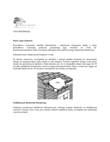 www.lech-bud.org Dach i jego elementy Prawidłowe wykonanie obróbki blacharskiej i niektórych elementów dachu a także prawidłowe wykonane pokrycia gwarantują jego trwałość na wiele lat. Poniżej prezentujemy kilka rozwiązań zabezpieczenia dachu krytego dachówką bitumiczną. Zabezpieczenie okapu przed śniegiem i wodą W okresie zimowym, szczególnie na dachach o małym spadku dochodzi do zatrzymania śniegu na nieogrzewanej części dachu tj. nad okapem. Podczas topnienia śniegu woda może dostać się pod pokrycie dachowe. Stąd zalecane jest, by w przypadku okapu szerszego niż 30 cm jako podkład pod dachówkę stosować papę termozgrzewalną. Papa ta winna być sięgać od krawędzi dachu do ok. 60 cm poza wewnętrzne lico ściany zewnętrznej. Podkład pod dachówkę bitumiczną Niektórzy producenci dachówek bitumicznych, zalecają montaż dachówki na dodatkowej warstwie izolacji, przy czym przy bardzo małych spadkach dachu wymagana jest podwójna warstwa izolacji. Rys. 2. Zasada montażu podkładu Rys. 3. Zasada montażu podkładu dodatkowego Obróbki blacharskie wokół komina Dla prawidłowej obróbki blacharskiej komina wymagana jest stosowanie podwójnych zabezpieczeń gwarantujących trwałość obróbek. W pierwszej kolejności należy wykonać blacharkę przylegająca bezpośrednio o komina, przy czym z tyłu komina wykorzystać można dachówki bitumiczne (rys. 4a). Kolejnym etapemjest pokrycie wykonanych obróbek blachą, która w górnej części wchodzi w spoinę miedzy cegłami (rys. 4b). a) b) Rys. 4. Zasady obróbki blacharskiej komina Kozubek Dla swobodnego opływu komina przez wodę, z tyłu komina należy wykonać kozubek. Rys. 5. Kozubek Obróbki blacharskie dachu na styku ze ścianami pionowymi Zasadą jest montaż obróbek blacharskich przed montażem materiału elewacyjnego na ścianach i przed montażem pokrycia dachu. Przy czy w przypadku stosowania krótkich odcinków blachy (rys. 7) zasadą jest jednoczesny montaż obróbek blacharskich i pokrycia dachu Rys. 6. Obróbka blacharska lukarny Rys. 7. Obróbka blacharska w miejscu styku dachu i ściany pokrytej sidingiem Obróbki blacharskie kosza i sposoby pokrycia dachówką bitumiczną Kosz należy wyłożyć blachą, przy czym w przypadku stosowania obróbki tzw. otwartej wymagana jest dodatkowa izolacja kosza papą termozgrzewalną. a) obróbka tzw. otwarta, b) obróbka tzw. zamknięta, c) obróbka tzw. na zakładkę Rys. 8. Przykłady montażu dachówki bitumicznej w koszu. Na podstawie "Roofing Materials" Building Research Council University of Illinois opracował Jakub Szymonowicz. Niniejszy materiał jest wstępem do następnego numeru LBS, który poświęcony będzie dachowym i jego elementom. materiały pochodzą ze strony www.szkielet.com.pl