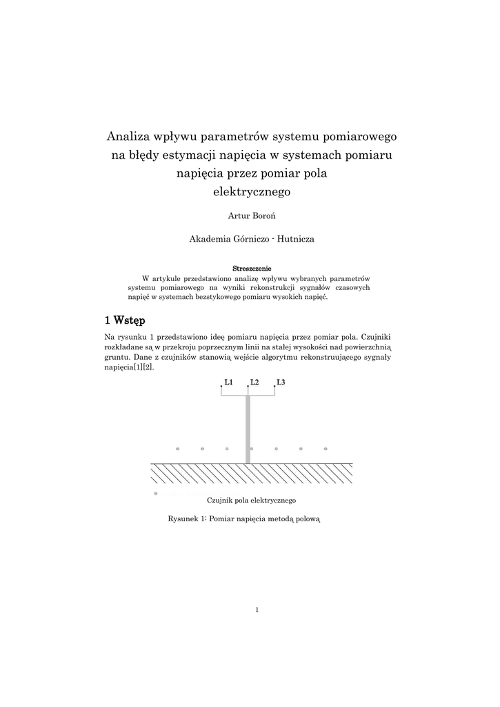 Analiza wpływu parametrów systemu pomiarowego na błędy estymacji napięcia w systemach pomiaru napięcia przez pomiar pola elektrycznego Artur Boroń Akademia Górniczo - Hutnicza Streszczenie W artykule przedstawiono analizę wpływu wybranych parametrów systemu pomiarowego na wyniki rekonstrukcji sygnałów czasowych napięć w systemach bezstykowego pomiaru wysokich napięć. 1 Wstęp Na rysunku 1 przedstawiono ideę pomiaru napięcia przez pomiar pola. Czujniki rozkładane są w przekroju poprzecznym linii na stałej wysokości nad powierzchnią gruntu. Dane z czujników stanowią wejście algorytmu rekonstruującego sygnały napięcia[1][2]. Czujnik pola elektrycznego Rysunek 1: Pomiar napięcia metodą polową 1 2 Liniowy algorytm rekonstrukcji Znając położenie przewodów w stosunku do czujników możemy zapisać wyrażenie na wartość potencjału w punktach, w których zostaną umieszczone czujniki. Wyrażenie z zastosowaniem notacji macierzowej dane jest wzorem (1). V = A(xLk,yLk)U dla k =1..m (1) Wymiary macierzy określa ilość przewodów m oraz czujników p. Elementy macierzy A dane są wzorem (2). A jk 1 ln 4ne (x L k - x j )2 (x Lk - x j )2 + (VL k + 1)2 + (VL k - 1)2 dla k = 1..m,j = 1..p (2) Na podstawie tak zapisanego modelu otrzymujemy wartości potencjałów w punktach pomiaru. Do uzyskania wartości napięcia będącego źródłem potencjału konieczne jest odwrócenie macierzy A. W ogólnym przypadku macierz ta nie jest kwadratowa i wymaga odwrócenia uogólnionego Moore'a - Penrose'a. Stosując to uogólnienie można zapisać wyrażenie na wartość napięcia (3). U = A 1 (xLk,VLk)V dla k = 1..m (3) W przypadku stałych wartości współrzędnych przewodów uzyskujemy stosunkowo mało złożony obliczeniowo algorytm rekonstrukcji sprowadzający się do mnożenia przez stałą macierz. Niestety zastosowanie tego algorytmu do pomiaru nie przynosi wystarczająco dobrych rezultatów. Szczegółowa analiza źródeł błędów algorytmu oraz sposoby ich ograniczenia przedstawiono dalszej części artykułu. 2.1 Błędy algorytmu liniowego Właściwości toru pomiarowego zniekształcają dane zebrane w czasie pomiaru. Zniekształcenia te mogą mieć charakter losowy, jak szum, lub bardziej deterministyczny, jak błąd zera. Inne z kolei wynikają z przyjętych założeń projektowych, jak na przykład rozdzielczość przetwornika analogowo - cyfrowego. Istnieje cała grupa czynników mających wpływ na błąd rekonstrukcji, można tu wymienić: • Różnice wzmocnienia w poszczególnych czujnikach, • Napięcie niezrównoważenia, • Szum własny czujnika, • Pole wspólne, • Rozdzielczość rejestracji, • Nieznajomości geometrii, 2 Znaczenie poszczególnych czynników zostało sprawdzone na sygnałach wygenerowanych w modelu. Do czystego sygnału z modelu dodawane były poszczególne zakłócenia, a następnie sygnał ten stanowił wejście algorytmu rekonstrukcyjnego. Jako miarę oceny jakości rekonstrukcji przyjęto błąd względny, skuteczny, procentowy (4). 5 = J(Uwe -2 Uw y )2 * 100% y (4) U wy Definicja taka pozwala na ocenę liczbową jakości rekonstrukcji. Umożliwia to porównanie błędów rekonstrukcji pochodzących od różnych źródeł i określenie szkodliwości poszczególnych zaburzeń. 2.1.1 Różnice wzmocnienia w poszczególnych czujnikach Elementy bierne decydujące o wzmocnieniu czujnika posiadają tolerancję, w której mieści się ich wartość. Powoduje to, że otrzymane wzmocnienia w poszczególnych kanałach pomiarowych będą znajdowały się w pewnym zakresie. Podobna sytuacja ma miejsce w przypadku filtrów, których charakterystyki w jeszcze większym stopniu są zależne od elementów ze względu na ich większą ilość. Jak widać na rysunku 2 algorytm reaguje tak samo na za duże jak i na zbyt małe wzmocnienie. Aby uzyskać małe błędy rekonstrukcji, kalibracja musi ograniczyć błędy wzmocnienia do wartości mniejszych niż 0,1%. 35 -1 -0.5 0 0.5 1 Błąd wzmocnienia w pojedynczym torze [%] Rysunek 2: Błąd metody w funkcji różnicy wzmocnienia w jednym z kanałów pomiarowych 3 2.1.2 Napięcie niezrównoważenia Sygnał zarejestrowany przy pomocy czujnika pojemnościowego powinien posiadać zerową składową stałą. Właściwości elementów toru pomiarowego oraz użytej topologi obwodów kondycjonującej sygnał powodują zmianę poziomu zera. Poziom ten może się zmieniać co uniemożliwia jego uwzględnienie w procesie kalibracji. Zmiany te nie posiadają dużego zakresu i są bardzo wolne ze względu na to, że zależą głównie od temperatury. Pozwala to usunąć je z sygnału, gdyż ich częstotliwość leży poza dolną częstotliwością graniczną czujnika. 2.1.3 Szum własny czujnika Każdy tor pomiarowy dodaje do mierzonego sygnału szum. Szum termiczny poszczególnych elementów analogowych oraz szum propagujący się przez sprzężenia pojemnościowe dodają się do sygnału jeszcze przed jego próbkowaniem, a proces próbkowania wprowadza szum kwantyzacji. Rozdzielczość przetwarzania określa minimalny poziom szumu (maksymalną wartość parametru SNR) według wzoru (5), gdzie N jest ilością bitów. SNR = 6.02N + 1.76 (5) Nie znaczy to jednak, że inne czynniki nie mogą zmniejszyć wartości tego parametru. Nic natomiast nie jest w stanie powiększyć jego wartości. Niewłaściwy dobór elementów oraz nieprawidłowe zaprojektowanie obwodu drukowanego może znacząco pogorszyć właściwości szumowe i w nieodwracalny sposób pogorszyć jakość sygnału. W przypadku opisywanego algorytmu, zaniedbania projektowe mogą prowadzić do znaczących błędów. Charakterystyka błędu rekonstrukcji w funkcji parametru SNR została przedstawiona na rysunku 3. .6 LI L 2 L 3 0 50 60 70 80 90 100 110 120 SNR w torze pomiarowym[dB] Rysunek 3: Błąd metody w funkcji SNR w kanałach pomiarowych 4 Błąd rekonstrukcji osiąga małe wartości dla SNR > 90dB. Uzyskanie takiego stosunku sygnału do s