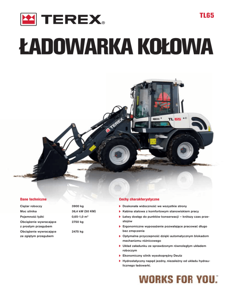 TL65 ŁADOWARKA KOŁOWA Dane techniczne Cechy charakterystyczne Ciężar roboczy 3900 kg Doskonała widoczność we wszystkie strony Moc silnika 36,4 kW (50 KM) 3 Kabina stalowa z komfortowym stanowiskiem pracy Pojemność łyżki 0,65-1,0 m Łatwy dostęp do punktów konserwacji – krótszy czas prze- Obciążenie wywracające 2750 kg stojów z prostym przegubem Obciążenie wywracające ze zgiętym przegubem Ergonomiczne wyposażenie pozwalające pracować długo 2475 kg bez zmęczenia Optymalna przyczepność dzięki automatycznym blokadom mechanizmu różnicowego Układ załadunku ze sprawdzonym równoległym układem roboczym Ekonomiczny silnik wysokoprężny Deutz Hydrostatyczny napęd jezdny, niezależny od układu hydraulicznego ładowarki. OPIS TECHNICZNY SILNIK Producent, model Typ Deutz, D 2011 L04 4-cylindrowy silnik wysokoprężny, EU stopień III A, EPA Interim Tier 4 4-suwowy z wtryskiem bezpośrednim 3100 cm3 36,4 kW (50 KM) Zewnętrzne chłodzenie oleju Cykl pracy Pojemność skokowa Moc zgodnie z ISO 9249 przy 2300 min-1 Układ chłodzenia INSTALACJA ELEKTRYCZNA Napięcie robocze Instalacja oświetleniowa zgodna z przepisami ruchu drogowego i normą europejską. 12 V UKŁAD HYDRAULICZNY UKŁAD PRZENIESIENIA NAPĘDU Hydrostatyczny napęd jazdy w zamkniętym obiegu, niezależny od hydrauliki ładowarki. Zaawansowana automatyka jazdy, samoczynna optymalizacja siły pociągowej i prędkości. Regulacja silnika hydraulicznego w funkcji obciążenia umożliwia wybór jednego z dwóch zakresów prędkości. Płynna regulacja prędkości do przodu i do tyłu. Napęd na wszystkie koła przekazywany z przekładni redukcyjnej na tylnej osi przez wał przegubowy na przednią oś. Pedał hamulca z funkcją pełzania. 2 zakresy jazdy: „Zakres prędkości I“ 0-7 km/h „Zakres prędkości II“ 0-20 km/h 4 zakresy jazdy (opcjonalnie wersja szybkiej jazdy): „Zakres prędkości I“ 0-6,5 / 0-18 km/h „Zakres prędkości II“ 0-14 / 0-36 km/h OSIE Oś przednia: Oś napędu planetarnego, sztywna. Samoblokujący mechanizm różnicowy 45%. Oś tylna: Oś napędu planetarnego ze zintegrowaną przekładnią redukcyjną, zawieszenie wahliwe, amortyzowana poduszkami gumowym. Samoblokujący mechanizm różnicowy 45%. Kąt wychylenia ±12° OPONY Rozmiar standardowy 365/70 R 18 SPT 9 Dunlop HAMULCE Hamulec roboczy: Hamulec dodatkowy: Hamulec postojowy: Hydrauliczny centralny hamulec bębnowy, działający poprzez napęd na wszystkie cztery koła. Hydrostatyczny przez zamknięty obieg napędu jezdnego. Mechaniczny centralny hamulec bębnowy przedniej osi. UKŁAD KIEROWNICZY Sterowanie przegubowe, 1 siłowniki kierujące z obustronną amortyzacją w położeniach krańcowych, całkowicie hydrauliczne przez zawór priorytetowy Load-Sensing, szybkie i łatwe kierowanie również przy prędkości obrotowej silnika na biegu jałowym. Całkowity kąt skrętu 80° POJEMNOŚCI NAPEŁNIENIA Pojemność zbiornika paliwa Układ hydrauliczny (włącznie ze zbiornikiem) 75 l 60 l PARAMETRY EKSPLOATACYJNE, WYPOSAŻENIE STANDARDOWE Ciężar roboczy (ISO 6016) Obciążenie przewracające, na prosto (ISO 14397-1) Obciążenie wywracające, pod kątem (ISO 14397-1) Długość całkowita, łyżka na podłożu Szerokość całkowita Promień skrętu na zewnętrznej krawędzi łyżki standardowej Rozstaw osi Wysokość z kabiną 3900 kg 2750 kg. 2475 kg. 4780 mm 1700 mm 3870 mm 1950 mm 2610 mm Wydajność pompy maks. 41 l/min. Ciśnienie robocze 250 bar Urządzenie sterujące: Proporcjonalny zawór hydrauliczny z 3 obiegami sterującymi i przełącznikiem biegu szybkiego dla przechylania. Wszystkie ruchy są sterowalne równocześnie i niezależnie. Dźwignia sterująca (dźwignia wielofunkcyjna) dla siłownika podnoszącego i przechylającego ze zintegrowanym przełącznikiem dodatkowego obwodu sterującego i przełącznikiem kierunku jazdy. Pozycja pływająca w obwodzie sterującym „opuszczanie", sterowana elektro-hydraulicznie. Dodatkowy obwód sterujący łącznie ze złączami wtykowymi i funkcją pracy ciągłej wbudowane seryjnie. UKŁAD ZAŁADOWCZY Układ załadowczy z kinematyką równoległą i zintegrowanym mechanicznym (opcjonalnie hydraulicznym) szybkozłączem. Łyżka załadowcza (ISO 7546) 0,65 m3 Siła podnoszenia przy gruncie (ISO 14397-2) 33 000 N Siła skrawania (ISO 14397-2) 37 000 N PODNOŚNIK WIDŁOWY Udźwig (łączny zakres podnoszenia i skrętu) 1550 (1650*) kg Udźwig (pozycja transportowa), ok. 300 mm nad podłożem, całkowity zakres 1900* kg skrętu Szerokość wspornika wideł 1240 mm Długość zębów wideł (100x40 mm) 900 mm Współczynnik stateczności 1,25 Wyznaczanie udźwigu użytecznego na równym podłożu = 80% obciążenia przewracającego pod kątem KABINA Elastycznie osadzona stalowa kabina z pełną widocznością, świadectwo ROPS (EN ISO 3471 ROPS) i FOPS** (EN ISO 3449 FOPS). Kabina operatora wyposażona w dwoje drzwi, elektryczne wycieraczki z przełącznikiem interwałowym i spryskiwaczami z przodu i z tyłu, barwione panoramiczne przeszklenie ze szkła bezpiecznego, odsuwaną szybę z lewej strony. Fotel operatora z hydrauliczną amortyzacją, regulacją wagi operatora i biodrowym pasem bezpieczeństwa zgodnie z ISO 7096 i ISO 6683. Ogrzewanie kabiny z 3-stopniową dmuchawą (przełączaną ze świeżego powietrza na tryb cyrkulacji powietrza) i odmrażaniem szyby przedniej i tylnej. Przygotowana do montażu klimatyzacji i radia. Regulacja nachylenia i wysokości kierownicy. 2 reflektory robocze przednie. Poziom mocy akustycznej odpowiada dyrektywom WE. *Z balastem tylnej osi **FOPS tylko z ochronną siatką dachową (opcja) TL65 WYMIARY: ŁYŻKA ZAŁADOWCZA 80° 1650 4 0° Pojemność zgodnie z ISO 7546: 0,65 m3 Maksymalny ciężar ładunku: 1,8 t/m3 580 410 1950 70 ° 120 0 133 0 170 35° 50° 2515 2610 3120 45° 183 0 1175 3870 4780 PODNOŚNIK WIDŁOWY ŁYŻKA UNIWERSALNA Pojemność zgodnie z ISO 7546: 0,60 m3 Maksymalny ciężar ładunku: 1,6 t/m3 3