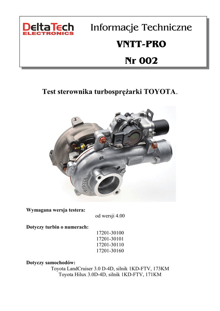Informacje Techniczne VNTT-PRO Nr 002 Test sterownika turbosprężarki TOYOTA. Wymagana wersja testera: od wersji 4.00 Dotyczy turbin o numerach: 17201-30100 17201-30101 17201-30110 17201-30160 Dotyczy samochodów: Toyota LandCruiser 3.0 D-4D, silnik 1KD-FTV, 173KM Toyota Hilux 3.0D-4D, silnik 1KD-FTV, 171KM 2/3 Informacje Techniczne VNTT-PRO Nr 002 Sposób sprawdzenia sterownika: Moduł odczytu położenia zmiennej geometrii zawiera dwa niezależne czujniki położenia. Z tego względu test sterownika należy przeprowadzić w dwóch etapach. Etap I. – sprawdzenie sterownika w oparciu o wskazania czujnika 1 1. Podłączyć sterownik zgodnie z poniższą tabelą Oznaczenie przewodu PV Podłączenie sterownika (kolory końcówek przewodu) niebieski/ zielony lub czerwony/zielony A1 – czarny A2 – czerwony B1 – zielony B2 – żółty B3 – niebieski Wygląd złącza A B 2 1 2. 3. 4. 5. 6. 6 5 4 3 2 1 Włączyć tester VNTT-PRO Wybrać opcję „Test sterownika” Wybrać sterownik „DENSO” Uruchomić żądaną funkcję: „Sterowanie” lub „Test zakresu” Sprawdzić poprawność działania sterownika w oparciu o płynność ruchu dźwigni oraz wskazania poboru prądu (Imax). DeltaTech Electronics 3/3 Informacje Techniczne VNTT-PRO Nr 002 Etap II – sprawdzenie sterownika w oparciu o wskazania czujnika 2 1. Podłączyć sterownik zgodnie z poniższą tabelą Oznaczenie przewodu PV Podłączenie sterownika (kolory końcówek przewodu) niebieski/ zielony lub czerwony/zielony A1 – czarny A2 – czerwony B4 – zielony B5 – żółty B6 – niebieski Wygląd złącza A B 2 1 2. 3. 4. 5. 6. 6 5 4 3 2 1 Włączyć tester VNTT-PRO Wybrać opcję „Test sterownika” Wybrać sterownik „DENSO” Uruchomić żądaną funkcję: „Sterowanie” lub „Test zakresu” Sprawdzić poprawność działania sterownika w oparciu o płynność ruchu dźwigni oraz wskazania poboru prądu (Imax). Dopuszczalne wartości Imax dla funkcji „Sterowanie” Producent sterownika DENSO Oznaczenie sterownika Dopuszczalna wartość prądu Imax < 1.20 [A] Dopuszczalne wartości Imax dla funkcji „Test zakresu” Producent sterownika DENSO Oznaczenie sterownika Dopuszczalna wartość prądu Imax < 0.80 [A] DeltaTech Electronics