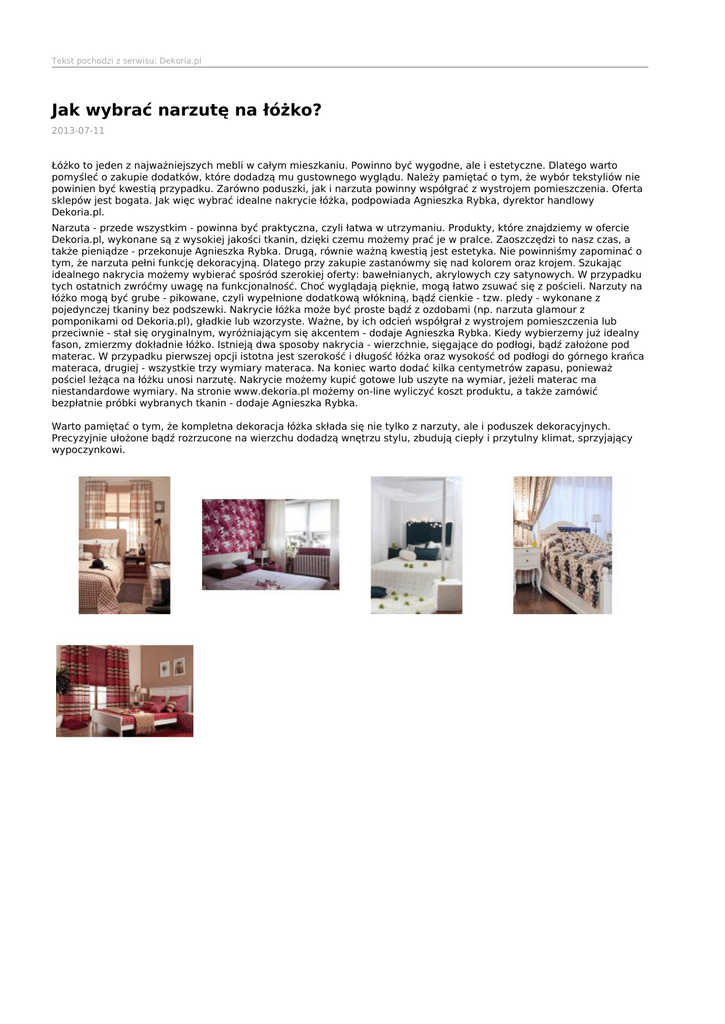 Tekst pochodzi z serwisu: Dekoria.pl Jak wybrać narzutę na łóżko? 2013-07-11 Łóżko to jeden z najważniejszych mebli w całym mieszkaniu. Powinno być wygodne, ale i estetyczne. Dlatego warto pomyśleć o zakupie dodatków, które dodadzą mu gustownego wyglądu. Należy pamiętać o tym, że wybór tekstyliów nie powinien być kwestią przypadku. Zarówno poduszki, jak i narzuta powinny współgrać z wystrojem pomieszczenia. Oferta sklepów jest bogata. Jak więc wybrać idealne nakrycie łóżka, podpowiada Agnieszka Rybka, dyrektor handlowy Dekoria.pl. Narzuta - przede wszystkim - powinna być praktyczna, czyli łatwa w utrzymaniu. Produkty, które znajdziemy w ofercie Dekoria.pl, wykonane są z wysokiej jakości tkanin, dzięki czemu możemy prać je w pralce. Zaoszczędzi to nasz czas, a także pieniądze - przekonuje Agnieszka Rybka. Drugą, równie ważną kwestią jest estetyka. Nie powinniśmy zapominać o tym, że narzuta pełni funkcję dekoracyjną. Dlatego przy zakupie zastanówmy się nad kolorem oraz krojem. Szukając idealnego nakrycia możemy wybierać spośród szerokiej oferty: bawełnianych, akrylowych czy satynowych. W przypadku tych ostatnich zwróćmy uwagę na funkcjonalność. Choć wyglądają pięknie, mogą łatwo zsuwać się z pościeli. Narzuty na łóżko mogą być grube - pikowane, czyli wypełnione dodatkową włókniną, bądź cienkie - tzw. pledy - wykonane z pojedynczej tkaniny bez podszewki. Nakrycie łóżka może być proste bądź z ozdobami (np. narzuta glamour z pomponikami od Dekoria.pl), gładkie lub wzorzyste. Ważne, by ich odcień współgrał z wystrojem pomieszczenia lub przeciwnie - stał się oryginalnym, wyróżniającym się akcentem - dodaje Agnieszka Rybka. Kiedy wybierzemy już idealny fason, zmierzmy dokładnie łóżko. Istnieją dwa sposoby nakrycia - wierzchnie, sięgające do podłogi, bądź założone pod materac. W przypadku pierwszej opcji istotna jest szerokość i długość łóżka oraz wysokość od podłogi do górnego krańca materaca, drugiej - wszystkie trzy wymiary materaca. Na koniec warto dodać kilka centymetrów zapasu, ponieważ pościel leżąca na łóżku unosi narzutę. Nakrycie możemy kupić gotowe lub uszyte na wymiar, jeżeli materac ma niestandardowe wymiary. Na stronie www.dekoria.pl możemy on-line wyliczyć koszt produktu, a także zamówić bezpłatnie próbki wybranych tkanin - dodaje Agnieszka Rybka. Warto pamiętać o tym, że kompletna dekoracja łóżka składa się nie tylko z narzuty, ale i poduszek dekoracyjnych. Precyzyjnie ułożone bądź rozrzucone na wierzchu dodadzą wnętrzu stylu, zbudują ciepły i przytulny klimat, sprzyjający wypoczynkowi.