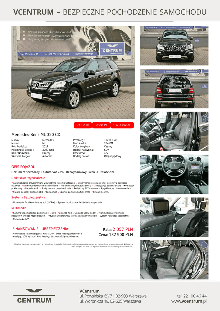 Mercedes-Benz ML 320 CDI Marka: Model: Rok Produkcji: Pojemność silnika : Kolor Nadwozia: Skrzynia biegów: Mercedes ML 2011 3000 cm3 Czarny Automat Przebieg : Moc silnika : Kolor Wnętrza: Rodzaj nadwozia: Ilość drzwi: Rodzaj paliwa: 102000 km 204 KM Czarny SUV 4/5 Olej napędowy OPIS POJAZDU: Dokument sprzedaży: Faktura Vat 23% Bezwypadkowy Salon PL I właściciel Dodatkowe Wyposażenie ✓Automatycznie przyciemniane wewnętrzne lusterko wsteczne ✓Elektrycznie sterowany fotel kierowcy z pamięcią ustawień ✓Elementy dekoracyjne aluminiowe ✓Kierownica wykończona skórą ✓Klimatyzacja automatyczna ✓Komputer pokładowy ✓Napęd 4Matic ✓Podgrzewane przednie fotele ✓Reflektory Bi-Xenonowe ✓Spryskiwacze ciśnieniowe lamp ✓Światła do jazdy dziennej LED ✓Tempomat ✓Czujniki parkowania tył i przód ✓Czujnik deszczu Systemy Bezpieczeństwa ✓Mocowanie fotelików dziecięcych (ISOFIX) ✓System monitorowania ciśnienia w oponach Multimedia ✓Kamera wspomagająca parkowanie ✓DVD ✓Gniazdo AUX ✓Gniazdo USB / iPod® ✓Multimedialny system dla pasażerów tylnego rzędu siedzeń ✓Przyciski w kierownicy sterujące zestawem audio ✓System nawigacji satelitarnej ✓Zmieniarka 6CD FINANSOWANIE I UBEZPIECZENIA: Przykładowa rata miesięczna, wpłata 20%, okres leasingu/kredytu 48 miesięcy, 10% wykupu. Rata leasingu jest wartością netto bez vat. Rata: 2 057 Cena: 132 900 PLN PLN Niniejsza treść nie stanowi oferty w rozumieniu przepisów Kodeksu Cywilnego oraz opisu towaru ani zapewnienia w rozumieniu art. 4 Ustawy z dnia 27 lipca 2002r o szczególnych warunkach sprzedaży konsumenckiej. Powered by TCPDF (www.tcpdf.org)