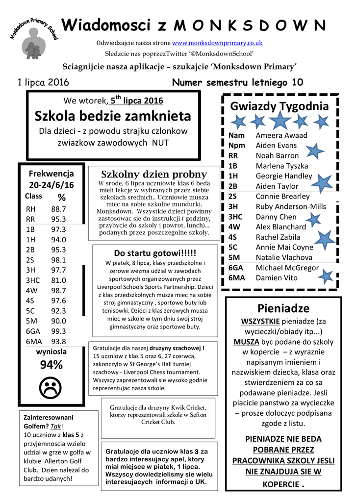 Wiadomosci z M O N K S D O W N Odwiedzajcienaszastronewww.monksdownprimary.co.uk Sledzcie nas poprzezTwitter ‘@MonksdownSchool’ Sciagnijcie nasza aplikacje – szukajcie ‘Monksdown Primary’ 1 lipca 2016 Numer semestru letniego 10 th lipca2016 Wewtorek,5 Szkolabedziezamknieta Dladzieci-zpowodustrajkuczlonkow zwiazkowzawodowychNUT Frekwencja 20-24/6/16 Szkolny dzien probny Class % RH 88.7 RR 95.3 1B 97.3 1H 94.0 2B 95.3 2S 98.1 3H 97.7 3HC 81.0 4W 98.7 4S 97.6 5C 92.3 5M 90.0 6GA 99.3 6MA 93.8 wyniosla W srode, 6 lipca uczniowie klas 6 beda mieli lekcje w wybranych przez siebie szkolach srednich.. Uczniowie musza miec na sobie szkolne mundurki. powinny Monksdown. Wszystkie dzieci zastosowac sie do instrukcji ( godziny, przybycie do szkoly i powrot, lunch)... podanych przez szkoly. poszczegolne 94% L Zainteresownani Golfem?Tak! 10uczniowzklas5z przyjemnosciawzielo udzialwgrzewgolfaw klubieAllertonGolf Club.Dziennalezaldo bardzoudanych! % % Dostartugotowi!!!!! Wpiatek,8lipca,klasyprzedszkolnei zerowewezmaudzialwzawodach sportowychorganizowanychprzez 90.0 LiverpoolSchoolsSportsPartnership.Dzieci zklasprzedszkolnychmuszamiecnasobie strojgimnastyczny,sportowebutylub tenisowki.Dziecizklaszerowychmusza miecwszkolewtymdniuswojstroj gimnastycznyorazsportowebuty. Gratulacjedlanaszejdruzynyszachowej! 15uczniowzklas5oraz6,27czerwca, zakonczylowStGeorge’sHallturniej szachowy-LiverpoolChesstournament. Wszyscyzaprezentowalisiewysokogodnie reprezentujacnaszaszkole. Gratulacje dla druzyny Kwik Cricket, ktorzy reprezentowali szkole w Sefton Cricket Club. GwiazdyTygodnia Nam Npm RR 1B 1H 2B 2S 3H 3HC 4W 4S 5C 5M 6GA 6MA AmeeraAwaad AidenEvans NoahBarron MarlenaTyszka GeorgieHandley AidenTaylor ConnieBrearley RubyAnderson-Mills DannyChen AlexBlanchard RachelZabila AnnieMaiCoyne NatalieVlachova MichaelMcGregor DamienVito Pieniadze WSZYSTKIEpieniadze(za wycieczki/obiadyitp...) MUSZAbycpodanedoszkoly wkopercie–zwyraznie napisanymimieniemi nazwiskiemdziecka,klasaoraz stwierdzeniemzacosa podawanepieniadze.Jesli placiciepanstwozawycieczke –proszedoloczycpodpisana zgodezlistu. Gratulacje dla uczniow klas 3 za bardzo interesujacy apel, ktory mial miejsce w piatek, 1 lipca. Wszyscy dowiedzielismy sie wielu interesujacych informacji o UK. PIENIADZENIEBEDA POBRANEPRZEZ PRACOWNIKASZKOLYJESLI NIEZNAJDUJASIEW KOPERCIE.