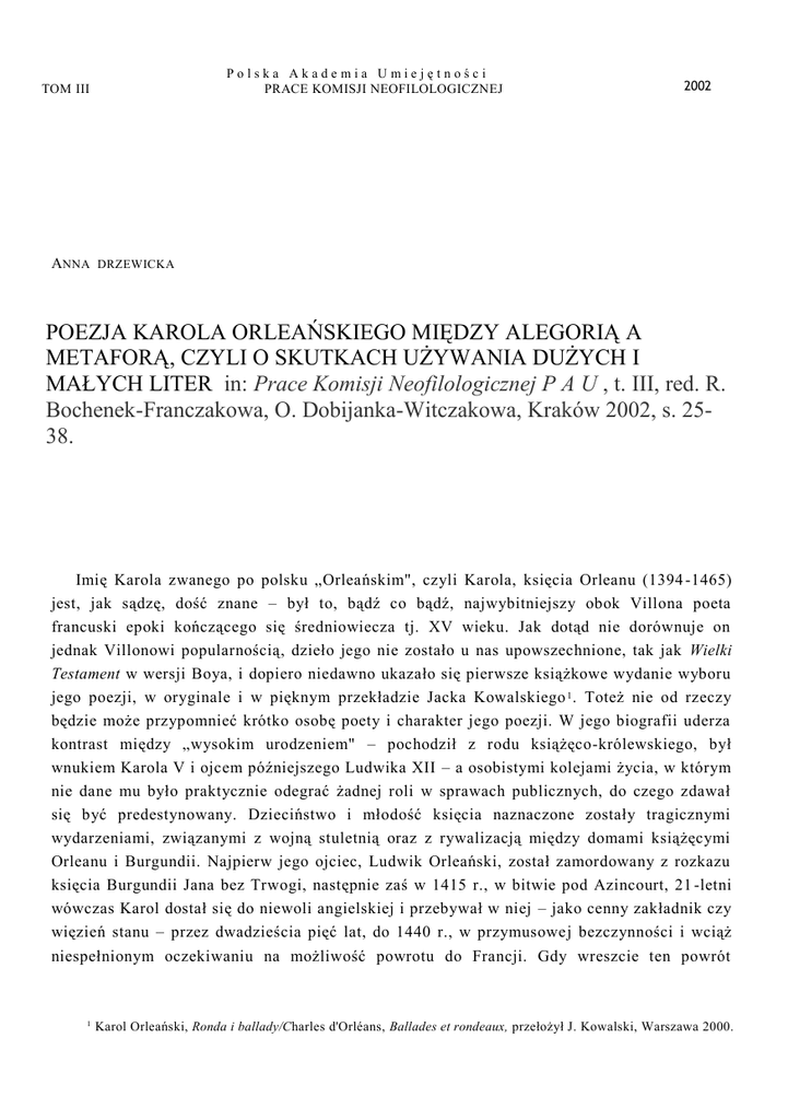Polska Akademia Umiejętności PRACE KOMISJI NEOFILOLOGICZNEJ TOM III 2002 ANNA DRZEWICKA POEZJA KAROLA ORLEAŃSKIEGO MIĘDZY ALEGORIĄ A METAFORĄ, CZYLI O SKUTKACH UŻYWANIA DUŻYCH I MAŁYCH LITER in: Prace Komisji Neofilologicznej P A U , t. III, red. R. Bochenek-Franczakowa, O. Dobijanka-Witczakowa, Kraków 2002, s. 2538. Imię Karola zwanego po polsku „Orleańskim", czyli Karola, księcia Orleanu (1394 -1465) jest, jak sądzę, dość znane – był to, bądź co bądź, najwybitniejszy obok Villona poeta francuski epoki kończącego się średniowiecza tj. XV wieku. Jak dotąd nie dorównuje on jednak Villonowi popularnością, dzieło jego nie zostało u nas upowszechnione, tak jak Wielki Testament w wersji Boya, i dopiero niedawno ukazało się pierwsze książkowe wydanie wyboru jego poezji, w oryginale i w pięknym przekładzie Jacka Kowalskiego 1 . Toteż nie od rzeczy będzie może przypomnieć krótko osobę poety i charakter jego poezji. W jego biografii uderza kontrast między „wysokim urodzeniem" – pochodził z rodu książęco-królewskiego, był wnukiem Karola V i ojcem późniejszego Ludwika XII – a osobistymi kolejami życia, w którym nie dane mu było praktycznie odegrać żadnej roli w sprawach publicznych, do czego zdawał się być predestynowany. Dzieciństwo i młodość księcia naznaczone zostały tragicznymi wydarzeniami, związanymi z wojną stuletnią oraz z rywalizacją między domami książęcymi Orleanu i Burgundii. Najpierw jego ojciec, Ludwik Orleański, został zamordowany z rozkazu księcia Burgundii Jana bez Trwogi, następnie zaś w 1415 r., w bitwie pod Azincourt, 21 -letni wówczas Karol dostał się do niewoli angielskiej i przebywał w niej – jako cenny zakładnik czy więzień stanu – przez dwadzieścia pięć lat, do 1440 r., w przymusowej bezczynności i wciąż niespełnionym oczekiwaniu na możliwość powrotu do Francji. Gdy wreszcie ten powrót nastąpił, był już, na owe czasy, starym czy starzejącym się człowiekiem. Próby aktywności 1 Karol Orleański, Ronda i ballady/Charles d'Orléans, Ballades et rondeaux, przełożył J. Kowalski, Warszawa 2000. 26 Anna Drzewicka politycznej nie potrwały długo i odtąd książę będzie już prawie wyłącznie poetą. Znany jest jego „dwór poetycki" w Blois, gdzie żyje w zaciszu, z dala od zgiełku, w otoczeniu rodzi ny i przyjaciół. Zachował się cenny welinowy rękopis zawierający obszerny zbiór jego poezji, uważany za „osobisty" rękopis księcia, za jego „księgę myśli" („livre de pensée"), częściowo autograficzny, przez niego wciąż uzupełniany i poprawiany; pojawiają s ię w nim również wiersze jego przyjaciół i gości, czasem całe serie wierszy różnych autorów o tym samym incipicie – był to zapewne rodzaj zabawy czy (nie w ścisłym sensie) „konkursu poetyckiego"; znany jest fakt, że w jednym z nich, na temat: „Je meurs de soif auprès de la fontaine" („Ginę z pragnienia tuż przy źródle stojąc"), uczestniczył również ktoś, czyje nazwisko nie wyróżnia się w rękopisie wśród wielu innych, ale dziś nieporównanie więcej nam mówi - brzmi ono: Villon. Przypuszczano nawet, że ten i inny jeszcze tekst, opatrzony tymże nazwiskiem, to autografy młodego poety, którego zmienne koleje burzliwego życia zaprowadziły również na dwór w Blois. Wiersze, którymi książę Karol wypełniał swoją „księgę myśli", na pozór nie wyróżniają się niczym w kontekście tradycji formalnej poezji późnego średniowiecza. Spuścizna poety obejmuje przede wszystkim bardzo liczne ballady i ronda, reszta to właściwie margines: dwa nieco dłuższe poematy alegoryczne, nieliczne complaintes i caroles oraz trochę obfitsza kolekcja „piosnek" (chansons), które w zasadzie mają również formę rond, z tym tylko, że są przeznaczone do śpiewu. Przede wszystkim więc ballady i ronda, a zatem najczęściej uprawiane przez poetów XIV i XV wieku drobne gatunki à forme fixe, o formie stałej – o ściśle określonym z góry układzie stroficznym i rymowym, z koniecznością mnożenia wielokrotnych rymów, z nawrotami wersów-refrenów. Ta trudna technika, która dla poety miernego może stać się celem sama w sobie, źródłem sztuczności i nieudolności, w wypadk u Karola Orleańskiego okazała się idealnie dopasowana do jego talentu. Jest on mistrzem małych form poetyckich; jego wiersze, czasem chciałoby się rzec: wierszyki, to jakby miniatury, barwne iluminacje zdobiące średniowieczną księgę. Zwłaszcza ronda, które z biegiem lat stają się ulubioną formą poety, to czasem prawdziwe klejnociki, zamykające na wąskiej przestrzeni słownej całe bogactwo jego wewnętrznego świata. Bo zbiór poezji księcia Karola jest rzeczywiście „księgą myśli". Rzadko, zupełnie wyjątkowo można się w nich dosłuchać echa dramatycznych przecież wydarzeń historycznych epoki, a nawet wyraźnych odniesień autobiograficznych. Nie opowiadając o sobie, Karol mówi jednak o sobie bardzo wiele. Zdarzają się, to prawda, wiersze żartobliwe, okolicznościowe, proste obrazki z życia, czasem bardzo wdzięczne. Ale znaczną większość ballad i rond wypełnia nieustanny monolog lirycznego „ja", daleki od romantycznego patosu czy ekshibicjonizmu, daleki również od dramatyczno-kpiarskiego tonu villonowskich wyznań. Karol mówi dyskretnie, półgłosem, choć mówi o swoich smutkach, rozczarowaniach, o doświadczeniu starzenia się, o troskach, o melancholii, o ucieczce Poezja Karola Orleańskiego [...] czyli o skutkach używania dużych i małych liter 27 w zobojętnienie - „nonchaloir". Jednakże wszystkie te zwierzenia przybierają najczęściej formę pośrednią, odwołującą się również do długiej, a w czasach poety wszechwładnie panującej tradycji: tradycji poezji alegorycznej. Wszyscy zgodnie podkreślają oryginalność zastosowania tej alegorycznej techniki w poezji Karola, tym niemniej, podobni