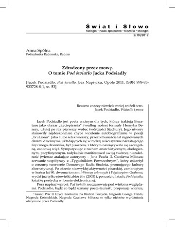 Świat i Słowo filologia • nauki społeczne • filozofia • teologia 2(19)/2012 Anna Spólna Politechnika Radomska, Radom Zdradzony przez mowę. O tomie Pod światło Jacka Podsiadły [Jacek Podsiadło, Pod światło, Bez Napiwku, Opole 2011, ISBN 978-83933728-8-1, ss. 53] Bezsens znaczy niewiele mniej aniżeli sens. Jacek Podsiadło, Wahadło i passa Jacek Podsiadło jest poetą ważnym dla tych, którzy traktują literaturę jako obszar „życiopisania” (według nośnej formuły Henryka Berezy, użytej po raz pierwszy wobec twórczości Stachury). Jego utwory stanowiły najdoskonalsze chyba wcielenie autobiografizmu w poezji „bruLionu”. Jako autor setek wierszy, przez kilkanaście lat sygnowanych datami dziennymi, układających się w rodzaj sukcesywnie narastającego lirycznego dziennika, był pisarzem, z którym nawiązywało się szczególną, osobową więź. Sympatyzując z ruchem anarchistycznym, ekologicznym, pacyfistycznym, radykalnie manifestował swoją twórczą niezależność (wiersze atakujące autorytety – Jana Pawła II, Czesława Miłosza; zerwanie współpracy z „Tygodnikiem Powszechnym”, który oskarżył o cenzurę; tworzenie Domowego Radia Studnia, promującego kulturę alternatywną). Po okresie niezwykłej aktywności pisarskiej, zamkniętym w końcu lat 90. dwoma tomami Wierszy zebranych i Wychwytem Grahama, wydał już tylko niewielki zbiór Kra (2005) i, po sześciu latach, Pod światło, książkę poetycką w formie elektronicznej. Pora napisać wprost: Pod światło rozczarowuje pod wieloma względami. Podsiadło, bądź co bądź uznany poeta-laureat1, proponuje wiersze, 1 Grand Prix II Edycji Konkursu na Brulion Poetycki, Nagroda Georga Trakla, Nagroda Kościelskich, Nagroda Czesława Miłosza to tylko niektóre wyróżnienia otrzymane przez Podsiadłę. Anna Spólna 306 którym daleko do jego wcześniejszych dokonań, dających „nowe wzory wrażliwości, nowe tony mówienia”2. Czego więc ubywa w poezji Podsiadły? Ucieczki donikąd Decyzję opublikowania e-booka zamiast tradycyjnego zbioru wierszy można traktować jako kolejną próbę zachowania kontroli nad swoim pisaniem – i życiem. Pisarz pozostaje poza głównym obiegiem wydawniczym, a tożsamy z nim bohater książki szuka sobie enklaw prywatności. Szkoda, że jego osobność niepokojąco przypomina przyczajenie lub emocjonalne odrętwienie, co zapowiada już Przedmowa: [...] Leżmy. Tamta wrzawa, siejba, kośba, szajba, żwawa krzątanina i kurzawa to gra o nic i niczyja, nie ma co się zastanawiać3. Tropy autobiograficzne są starannie zacierane, nadal jednak „ja” liryczne i „ja” autorskie nie dają się oddzielić. Obcujący z liryką Podsiadły od dwudziestu kilku lat pozbierają okruchy prywatności poety (wspomnienie Anny Marii, pierwszej wielkiej miłości poety; Olga, Marianka, Dawid – najbliżsi; mazurska Kraina Czerwonych Dachów; okolice Ostrowca Świętokrzyskiego, skąd wyruszył kiedyś w drogę „prześwietlony przez baśnie” chłopiec z Lamentu świętokrzyskiego, 31). Są też imiona znacząco przemilczane, wokół których obracała się niegdyś oś świata. Znikły listy, pisane do przyjaciół z krótkich przystanków w nieustającej podróży. Wraz z nimi język bezpośredniej rozmowy, kolokwialny i niewymuszony, ważny dla odświeżenia poetyckiego idiomu po 1989 roku. Poezja Podsiadły, nieco pochopnie wrzucona wówczas do o’harystycznego worka, udowadniała, że można nasycać liryczne wyznanie uważną obserwacją codzienności, rozszerzać granice wiersza aż do brawurowej, whitmanowskiej z ducha logorei, a jednocześnie nie rezygnować z kunsztownych gier z tradycją. Ekozoficzne wiersze kontemplujące jedność kosmicznych sił życiowych, wspólnotę wszystkich stworzeń, charakterystyczne dla poety, są w książce nieliczne i tracą swą moc. Podmiot dostrzega fascynującą jedność wszechświata, ale coraz rzadziej czuje się jej częścią i słyszy w sobie „dawną muzykę” (Strzemię i metrum, 38). Choć państwo kretów, rozcią2 Pisał o nich niegdyś M. Stala, Cały ten zgiełk. Kilka uwag o sytuacji i świadomości nowej poezji, zapisanych jesienią 1995 roku, [w:] tegoż, Druga strona. Notatki o poezji współczesnej, Kraków 1997, s. 177. 3 J. Podsiadło, Pod światło, Opole 2011, s. 5. Wszystkie cytaty pochodzą z tego wydania, w nawiasie podaję tytuł wiersza i numer strony. Zdradzony przez mowę… gające się pod powierzchnią ziemi, przesyła nam niezrozumiałe sygnały (Masz wiadomość, 14), a niemowlę pełza jak waran, powtarzając formę wypracowaną przed milionami lat przez Matkę Naturę (Robinia i judaszowiec, 17), udomowiony człowiek zrywa więź z otaczającymi go siłami przyrody. Droga pozostaje dla Podsiadły słowem zapisywanym wielką literą: cóż, kiedy w całym tomie ma okazję pojawić się tylko raz. Wolność przestaje być dostępna, o ucieczce można tylko pomarzyć: A moje rachunki? Zawiodły mnie. Nie tu i nie tak miałem żyć [...]. Włóczykij za oknem zostawia nierówny ścieg śladów, kroki stawia duże, omija kałuże, nie wchodzi w rachubę. (Przestrzeń i oś, 28) Autor wielu ważnych „wierszy przeciwko państwu”, propagujących uwspółcześnioną wersję „obywatelskiego nieposłuszeństwa”: H. D. Thoreau, w najnowszym tomie zestawia rymowany manifest Wiersz zalecany przez ministerstwo edukacji do użytku szkolnego, który kończy inwokacyjne: „Polsko. Ojczyzno moja. Jesteś jak choroba” (42). Wydaje się, że Podsiadło, wybierając tę pozornie obrazoburczą, w gruncie rzeczy niesmaczną parafrazę Mickiewiczowskiego poematu na przynętę dla nabywców swego e-booka, oddaje własnej poezji niedźwiedzią przysługę. Wezwanie do przetestowanej niegdyś na sobie ucieczki ze szponów systemu szkolnego, Kościoła, polityki, mediów zapisuje w formie tak zwulgaryzowanej, jakby adresatami byli rzeczywiście prymitywni młodociani wagarowicze. Rzeczywist