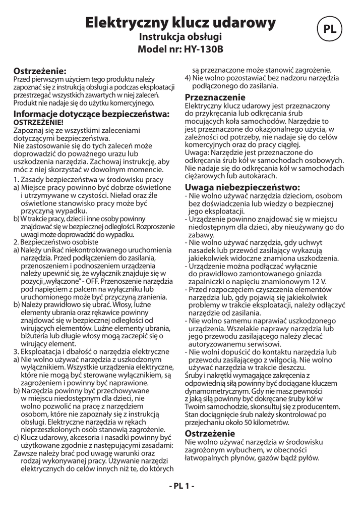 Elektryczny klucz udarowy Instrukcja obsługi Model nr: HY-130B Ostrzeżenie: Przed pierwszym użyciem tego produktu należy zapoznać się z instrukcją obsługi a podczas eksploatacji przestrzegać wszystkich zawartych w niej zaleceń. Produkt nie nadaje się do użytku komercyjnego. Informacje dotyczące bezpieczeństwa: OSTRZEŻENIE! Zapoznaj się ze wszystkimi zaleceniami dotyczącymi bezpieczeństwa. Nie zastosowanie się do tych zaleceń może doprowadzić do poważnego urazu lub uszkodzenia narzędzia. Zachowaj instrukcję, aby móc z niej skorzystać w dowolnym momencie. 1. Zasady bezpieczeństwa w środowisku pracy a) Miejsce pracy powinno być dobrze oświetlone i utrzymywane w czystości. Nieład oraz źle oświetlone stanowisko pracy może być przyczyną wypadku. b) W trakcie pracy, dzieci i inne osoby powinny znajdować się w bezpiecznej odległości. Rozproszenie uwagi może doprowadzić do wypadku. 2. Bezpieczeństwo osobiste a) Należy unikać niekontrolowanego uruchomienia narzędzia. Przed podłączeniem do zasilania, przenoszeniem i podnoszeniem urządzenia należy upewnić się, że wyłącznik znajduje się w pozycji „wyłączone” - OFF. Przenoszenie narzędzia pod napięciem z palcem na wyłączniku lub uruchomionego może być przyczyną zranienia. b) Należy prawidłowo się ubrać. Włosy, luźne elementy ubrania oraz rękawice powinny znajdować się w bezpiecznej odległości od wirujących elementów. Luźne elementy ubrania, biżuteria lub długie włosy mogą zaczepić się o wirujący element. 3. Eksploatacja i dbałość o narzędzia elektryczne a) Nie wolno używać narzędzia z uszkodzonym wyłącznikiem. Wszystkie urządzenia elektryczne, które nie mogą być sterowane wyłącznikiem, są zagrożeniem i powinny być naprawione. b) Narzędzia powinny być przechowywane w miejscu niedostępnym dla dzieci, nie wolno pozwolić na pracę z narzędziem osobom, które nie zapoznały się z instrukcją obsługi. Elektryczne narzędzia w rękach nieprzeszkolonych osób stanowią zagrożenie. c) Klucz udarowy, akcesoria i nasadki powinny być użytkowane zgodnie z następującymi zasadami: Zawsze należy brać pod uwagę warunki oraz rodzaj wykonywanej pracy. Używanie narzędzi elektrycznych do celów innych niż te, do których PL są przeznaczone może stanowić zagrożenie. 4) Nie wolno pozostawiać bez nadzoru narzędzia podłączonego do zasilania. Przeznaczenie Elektryczny klucz udarowy jest przeznaczony do przykręcania lub odkręcania śrub mocujących koła samochodów. Narzędzie to jest przeznaczone do okazjonalnego użycia, w zależności od potrzeby, nie nadaje się do celów komercyjnych oraz do pracy ciągłej. Uwaga: Narzędzie jest przeznaczone do odkręcania śrub kół w samochodach osobowych. Nie nadaje się do odkręcania kół w samochodach ciężarowych lub autokarach. Uwaga niebezpieczeństwo: - Nie wolno używać narzędzia dzieciom, osobom bez doświadczenia lub wiedzy o bezpiecznej jego eksploatacji. - Urządzenie powinno znajdować się w miejscu niedostępnym dla dzieci, aby nieużywany go do zabawy. - Nie wolno używać narzędzia, gdy uchwyt nasadek lub przewód zasilający wykazują jakiekolwiek widoczne znamiona uszkodzenia. - Urządzenie można podłączać wyłącznie do prawidłowo zamontowanego gniazda zapalniczki o napięciu znamionowym 12 V. - Przed rozpoczęciem czyszczenia elementów narzędzia lub, gdy pojawią się jakiekolwiek problemy w trakcie eksploatacji, należy odłączyć narzędzie od zasilania. - Nie wolno samemu naprawiać uszkodzonego urządzenia. Wszelakie naprawy narzędzia lub jego przewodu zasilającego należy zlecać autoryzowanemu serwisowi. - Nie wolni dopuścić do kontaktu narzędzia lub przewodu zasilającego z wilgocią. Nie wolno używać narzędzia w trakcie deszczu. Śruby i nakrętki wymagające zakręcenia z odpowiednią siłą powinny być dociągane kluczem dynamometrycznym. Gdy nie masz pewności z jaką siłą powinny być dokręcane śruby kół w Twoim samochodzie, skonsultuj się z producentem. Stan dociągnięcie śrub należy skontrolować po przejechaniu około 50 kilometrów. Ostrzeżenie Nie wolno używać narzędzia w środowisku zagrożonym wybuchem, w obecności łatwopalnych płynów, gazów bądź pyłów. - PL 1 - Elektrické nářadí vytváří jiskry, které mohou prach Urządzenia elektryczne są źródłem iskier, które Eksploatacja Provoz a výpary zapálit. Neházejte nářadí otevřeného ohně mogą wywołać zapłon gazu lubdounoszących OSTRZEŻENIE materiálu – istnieje niebezpieczeństwo VAROVÁNÍ-poškození się w do powietrzu cząsteczek. Nie wolno wrzucać nebo vody. uszkodzenia materiału narzędzia ognia ani do wody. • -Nepřetěžujte nářadí. Nevyvíjejte na nářadí nadměrný Nie wolno przeciążać narzędzia. Nie wolno go • Používejtedo osobní ochranné prostředky. - Należy używać środków ochrony osobistej. tlak. Pokud nemůže být šroubem pohnuto rázový zbyt mocno dociskać w trakcie pracy.aGdy śruba Nepoužívejte volné oděvy nebo UdržujteWłosy, -• Nie wolno nosić luźnych ubrańšperky. ani biżuterii. utahovák zastavte Buď použijnie dajesesięzaseknul, odkręcić i kluczpráci. nie może ruszyć, vaše vlasy, a rukavice v dostatečné vzdálenosti luźne częścioděv ubrania i rękawice powinny znajdować tenależy silnějšínatychmiast nářadí, nebo pokračujte przerwać ručním pracę. klíčem. W takim odwhybných částí. Uvolněný oděv, šperky nebo vlasy się bezpiecznej odległości od wirujących Nepokoušejte se pokračovat v povolování/utahování przypadku należy użyć mocniejszego narzędzia elementów. Luźne elementy ubrania, biżuteria lub mobou být hybnými částmi zachyceny. lub kontynuować pracę z użyciem klucza šroubu ručně s rázovým utahovákem. długie włosy mogą zaczepić się o wirujący element. ręcznego. Nie wolno pomagać kluczem ręcznym w odkręcaniu