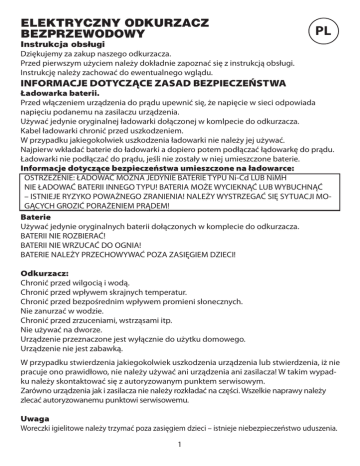 ELEKTRYCZNY ODKURZACZ BEZPRZEWODOWY PL Instrukcja obsługi Dziękujemy za zakup naszego odkurzacza. Przed pierwszym użyciem należy dokładnie zapoznać się z instrukcją obsługi. Instrukcję należy zachować do ewentualnego wglądu. INFORMACJE DOTYCZĄCE ZASAD BEZPIECZEŃSTWA Ładowarka baterii. Przed włączeniem urządzenia do prądu upewnić się, że napięcie w sieci odpowiada napięciu podanemu na zasilaczu urządzenia. Używać jedynie oryginalnej ładowarki dołączonej w komlpecie do odkurzacza. Kabel ładowarki chronić przed uszkodzeniem. W przypadku jakiegokolwiek uszkodzenia ładowarki nie należy jej używać. Najpierw wkładać baterie do ładowarki a dopiero potem podłączać łądowarkę do prądu. Ładowarki nie podłączać do prądu, jeśli nie zostały w niej umieszczone baterie. Informacje dotyczące bezpieczeństwa umieszczone na ładowarce: OSTRZEŻENIE: ŁADOWAĆ MOŻNA JEDYNIE BATERIE TYPU Ni-Cd LUB NiMH NIE ŁADOWAĆ BATERII INNEGO TYPU! BATERIA MOŻE WYCIEKNĄĆ LUB WYBUCHNĄĆ – ISTNIEJE RYZYKO POWAŻNEGO ZRANIENIA! NALEŻY WYSTRZEGAĆ SIĘ SYTUACJI MOGĄCYCH GROZIĆ PORAŻENIEM PRĄDEM! Baterie Używać jedynie oryginalnych baterii dołączonych w komplecie do odkurzacza. BATERII NIE ROZBIERAĆ! BATERII NIE WRZUCAĆ DO OGNIA! BATERIE NALEŻY PRZECHOWYWAĆ POZA ZASIĘGIEM DZIECI! Odkurzacz: Chronić przed wilgocią i wodą. Chronić przed wpływem skrajnych temperatur. Chronić przed bezpośrednim wpływem promieni słonecznych. Nie zanurzać w wodzie. Chronić przed zrzuceniami, wstrząsami itp. Nie używać na dworze. Urządzenie przeznaczone jest wyłącznie do użytku domowego. Urządzenie nie jest zabawką. W przypadku stwierdzenia jakiegokolwiek uszkodzenia urządzenia lub stwierdzenia, iż nie pracuje ono prawidłowo, nie należy używać ani urządzenia ani zasilacza! W takim wypadku należy skontaktować się z autoryzowanym punktem serwisowym. Zarówno urządzenia jak i zasilacza nie należy rozkładać na części. Wszelkie naprawy należy zlecać autoryzowanemu punktowi serwisowemu. Uwaga Woreczki igielitowe należy trzymać poza zasięgiem dzieci – istnieje niebezpieczeństwo uduszenia. 1 OPIS ODKURZACZA 1. 2. 3. 4. 5. 6. 7. 8. 9. Drążek końcówki z uchwytem Drążki końcówek Akumulatorki 7,2V Przegroda na baterie Przełącznik On/Off (włączenie/wyłączenie) Drążek podstawowy Przeźroczysta rama zewnętrzna Korpus odkurzacza Zapadki obudowy zewnętrznej (kształt prostokąta) 10. Elastyczna złączka 11. Bezworkowy pojemnik na śmieci 12. Szczotki obrotowe 13. Ładowarka z akumulatorem (2 części) 14. Urządzenie do czyszczenia szczotek & Pokrywa do przechowywania 15. Obrotowy zaczep 2 MONTAŻ ODKURZACZA rys. 1 rys. 2 1) Złożyć ze sobą drążki końcówek (patrz rys. 1). 2) Założyć końcówkę na drążek podstawowy. Strzałki na końcówce i drążku podstawowym muszą być skierowane naprzeciw siebie. Kołki zabezpieczające drążka muszą wejść do otworów nasady. ŁADOWANIE BATERII rys. 3 1) Baterie włożyć do ładowarki (białe strzałki skierowane są naprzeciw siebie) – patrz rys. 3. 2) Ładowarkę podłączyć do prądu. Uwaga: czerwona dioda kontrolna wskazuje na proces ładowania baterii. Przed pierwszym użyciem: baterie należy ładować przez około 10 godzin. Następne ładowania – czas ładowania wynosi: 8 do 10 godzin Baterii nie należy ładować dłużej niż jest to wskazane! OBSŁUGA ODKURZACZA 1) Upewnić się, że przełącznik odkurzacza znajduje się w pozycji OFF = WYŁĄCZONY. 2) Sprawdzić, czy pojemnik na śmieci jest pusty. 3) Baterie włożyć do przegrody na baterie. Włąściwa pozycja: białe strzałki skierowane są naprzeciw siebie. – Należy zadbać o włąściwą polaryzację baterii. (patrz rys. 4). rys. 4 4) Włączyć odkurzacz – w tym celu przestawić przełącznik do pozycji ON = WŁĄCZONY. 5) Po zakończeniu sprzątania odkurzacz należy wyłączyć – przełącznik przestawić do pozycji OFF = WYŁĄCZONY. Wysypać śmieci z pojemnika. Jeśli to konieczne naładować baterie. 6) Obrotowy zaczep (patrz punkt 15 w opisie produktu) jest używany do wygodnego sprzątania pod meblami. Po odblokowaniu zatrzasku można złamać rączke co ułatki sprzątanie. po zablokowaniu zatrzasku rączka bedzie znowu cała prosta 3 CZYSZCZENIE I KONSERWACJA Przed każdym czyszczeniem odkurzacz należy wyłączyć a następnie wyjąć baterie. Bezworkowy pojemnik na śmieci 1) Przed wysypaniem pojemnika należy upewnić się, że odkurzacz jest wyłączony a baterie wyciągnięte. 2) Opróżnianie pojemnika na śmieci: a) umieścić odkurzacz nad koszem i otworzyć pokrywę pojemnika. b) wysypać śmieci do kosza. c) zamknąć pokrywę pojemnika. Uwaga: W przypadku kiedy pojemnika na śmieci nie da się dokłądnie założyć – należy sprawdzić, czy do wewnętrznej części magnetycznej obudowy nie przyczepił się jakiś metalowy przedmiot (na przykład spinacze biurowe, pinezki,...). Jesli tak, należy go ściagnąć. Czyszczenie szczotek Do czyszczenia szczotek służy specjalny przedmiot dołączony w komplecie do odkurzacza (znajdujący się w nacięciu na kartonie, w którym zapakowane są rączki). 1) Należy upewnić się, że odkurzacz jest wyłączony a bateria wyciągnięta. 2) Przesunąć 2 prostokątne zapadki obudowy zewnętrznej w kierunku do drążka odkurzacza. (patrz rys.5). rys. 5 3) Unieść zewnętrzną przeźroczystą ramę i przeciągnąć ją przez nasadę, otrzymując w ten sposób dogodny dostęp do szczotek. (patrz rys. 6) rys. 6 Ostrzeżenie: Urządzenie do czyszczenia szczotek ma na końcu ostrze z ostrym szpicem. Podczas pracy z tym przyrządem do czyszczenia szczotek należy zachować szczególną ostrożność. 4) Zaplątane włosy, zwierzęca sierść, nici i tym podobne należy wyczesać przy pomocy urządzenia do czyszczenia szczotek. Wystarczy przejechać ostrzem tego urządzenia wzdłuż szczotek.(patrz rys. 7). W ten łatwy sposób szczotk