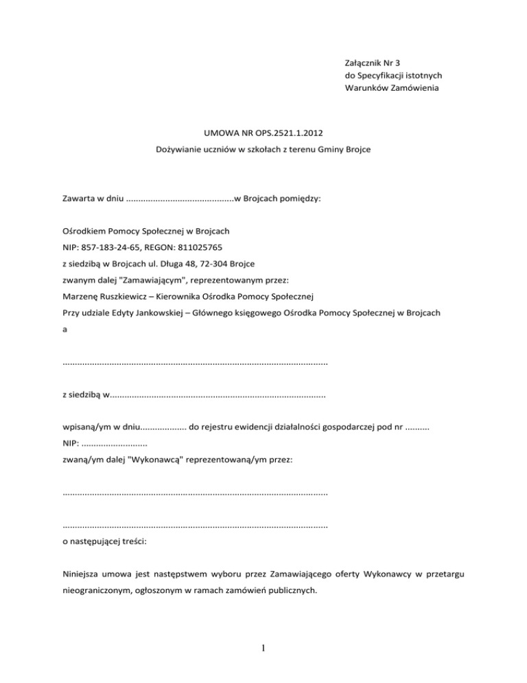 Załącznik Nr 3 do Specyfikacji istotnych Warunków Zamówienia UMOWA NR OPS.2521.1.2012 Dożywianie uczniów w szkołach z terenu Gminy Brojce Zawarta w dniu ............................................w Brojcach pomiędzy: Ośrodkiem Pomocy Społecznej w Brojcach NIP: 857-183-24-65, REGON: 811025765 z siedzibą w Brojcach ul. Długa 48, 72-304 Brojce zwanym dalej "Zamawiającym", reprezentowanym przez: Marzenę Ruszkiewicz – Kierownika Ośrodka Pomocy Społecznej Przy udziale Edyty Jankowskiej – Głównego księgowego Ośrodka Pomocy Społecznej w Brojcach a ............................................................................................................ z siedzibą w........................................................................................ wpisaną/ym w dniu................... do rejestru ewidencji działalności gospodarczej pod nr .......... NIP: ........................... zwaną/ym dalej "Wykonawcą" reprezentowaną/ym przez: ............................................................................................................ ............................................................................................................ o następującej treści: Niniejsza umowa jest następstwem wyboru przez Zamawiającego oferty Wykonawcy w przetargu nieograniczonym, ogłoszonym w ramach zamówień publicznych. 1 §1 1. Zamawiający zleca, a Wykonawca zobowiązuje się, zgodnie ze specyfikacją istotnych warunków zamówienia oraz ofertą, do świadczenia usług żywieniowych polegających na przygotowaniu i wydawaniu posiłków dla uczniów Gimnazjum i Szkoły Podstawowej w Brojcach oraz Filii Szkoły Podstawowej w Dargosławiu. 2. Wykonawca przyjmuje, iż posiłki przygotowywane będą w dzierżawionej przez Wykonawcę od Gminy Brojce kuchni w Szkole Podstawowej w Brojcach, ul. Długa 19. 3. Czas obowiązywania umowy dla czynności określonych w ust.1 i ust. 2 ustala się na okres od dnia 01 sierpnia 2012 r. do dnia 31 lipca 2013 r. 4. Dyrektorzy szkół wymienionych w ust. 1 w porozumieniu z kierownikiem Ośrodka Pomocy Społecznej w Brojcach ustalą szczegółowy plan wydawania posiłków przez Wykonawcę, obejmujący okresy miesięczne, w którym określą: 1) dni i godziny wydawania posiłków, 2) liczbę uczniów objętych dożywianiem, 3) skład posiłku (pełny: zupa + drugie danie lub jednodaniowy: zupa albo drugie danie). §2 1. Wykonawca zobowiązuje się przygotowywać i wydawać posiłki z należytą starannością – przy zachowaniu odpowiednich warunków higieny i wymagań, o których mowa w ust. 4 – oraz przestrzegać norm ilościowych, dla poszczególnych posiłków: 1) jedna porcja zupy: 500ml zupy wraz z kromką chleba; 2) jedna porcja drugiego dania: ziemniaki lub zamiennik (kasza, ryż, makaron) 200g, mięso 100g, surówka 150g albo – nie częściej niż jeden raz w tygodniu – innych potraw (tj. naleśniki, pierogi itp.) o gramaturze 300g na porcję, kompot 200ml. 2. Wykonawca zobowiązany jest do przygotowywania posiłków w wydzierżawionej kuchni szkoły Podstawowej w Brojcach. Niespełnienie tego warunku będzie podstawą do rozwiązania niniejszej umowy z winy Wykonawcy. 3. Wydawanie posiłków Wykonawca będzie dokonywał w stołówce Szkoły Podstawowej w Brojcach i stołówce Szkoły Podstawowej Filia w Dargosławiu. 4. Świadczenie usług żywieniowych powinno być zgodne z ustawą o bezpieczeństwie żywności i żywienia (tekst jednolity DU z 2010 r. nr 136, poz. 914 z późn. zm.) oraz zaleceniami Głównego Inspektora Sanitarnego i Instytutu Żywności i Żywienia w sprawie norm wyżywienia i żywienia, jakie obowiązują zakładach żywienia zbiorowego oraz jakości zdrowotnej żywności, z uwzględnieniem zaleceń dotyczących: 1) wyposażenia (stanu technicznego i sanitarnego pomieszczeń i urządzeń); 2 2) personelu (kwalifikacje i niezbędne badania lekarskie); 3) cyklu produkcyjnego i jego poszczególnych etapów (przestrzegania zasad sanitarnohigienicznych na każdym etapie: produkcji posiłków, wydawania posiłków; składowania i magazynowania produktów, przewozu posiłków); 4) w zakresie jakości usług (w sposób gwarantujący jakość posiłków zgodną z zalecanymi normami dotyczącymi zawartości składników pokarmowych zapewniając różnorodność diety z uwzględnieniem specyfiki żywienia dzieci i młodzieży); 5. Wymagania w zakresie dystrybucji, jakości i gramatury oraz dostarczania posiłków: 1) posiłki muszą być przygotowane i transportowane w higienicznych warunkach, pojemniki muszą być szczelnie zamknięte, aby nie wylewały się z nich dania płynne i utrzymywały odpowiednią temperaturę; 2) gramatura poszczególnych porcji żywnościowych musi być zgodna z § 2 ust. 1 pkt1 i 2; 3) dostarczane i wydawane posiłki muszą być gorące, poza posiłkami, które co do zasady są spożywane na zimno. 6. Wykonawca na własny koszt wyposaży kuchnię w urządzenia, sprzęt i akcesoria niezbędne do wykonywania usługi, które po zakończeniu okresu umowy zdemontuje w ten sposób, iż przywróci pomieszczenia kuchenne do stanu pierwotnego – tj. z dnia przyjęcia pomieśćże kuchennych od Zamawiającego. 7. Wykonawca zobowiązany jest do utrzymania w należytym stanie sanitarno-higienicznym pomieszczeń kuchni tj. mycie i dezynfekcja pomieszczeń, stanowisk pracy, urządzeń i sprzętu kuchennego. 8. Wykonawca odpowiada za przestrzeganie przez osoby wykonujące zamówienie obowiązujących przepisów BHP, p.poż. i higieniczno-sanitarnych. 9. Wykonawca ponosić będzie odpowiedzialność prawną i materialną wobec organów kontroli w zakresie przestrzegania przepisów, o których mowa w ust. 7 i 8 oraz w zakresie wykonywanej usługi (tj. jakości produktów i przygotowania posiłków, ich zgodności z odpowiednimi normami oraz wymagań higieniczno-sanitarnych i porządkowych) o których mowa w ust. 4 i 5. §3 1. Strony ustalają wynagrodzenie Wykonawcy za każdy wydany po