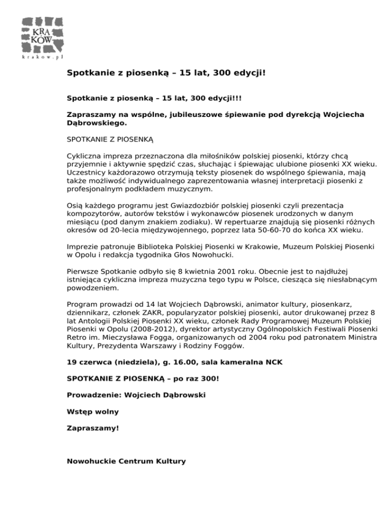 Spotkanie z piosenką – 15 lat, 300 edycji! Spotkanie z piosenką – 15 lat, 300 edycji!!! Zapraszamy na wspólne, jubileuszowe śpiewanie pod dyrekcją Wojciecha Dąbrowskiego. SPOTKANIE Z PIOSENKĄ Cykliczna impreza przeznaczona dla miłośników polskiej piosenki, którzy chcą przyjemnie i aktywnie spędzić czas, słuchając i śpiewając ulubione piosenki XX wieku. Uczestnicy każdorazowo otrzymują teksty piosenek do wspólnego śpiewania, mają także możliwość indywidualnego zaprezentowania własnej interpretacji piosenki z profesjonalnym podkładem muzycznym. Osią każdego programu jest Gwiazdozbiór polskiej piosenki czyli prezentacja kompozytorów, autorów tekstów i wykonawców piosenek urodzonych w danym miesiącu (pod danym znakiem zodiaku). W repertuarze znajdują się piosenki różnych okresów od 20-lecia międzywojennego, poprzez lata 50-60-70 do końca XX wieku. Imprezie patronuje Biblioteka Polskiej Piosenki w Krakowie, Muzeum Polskiej Piosenki w Opolu i redakcja tygodnika Głos Nowohucki. Pierwsze Spotkanie odbyło się 8 kwietnia 2001 roku. Obecnie jest to najdłużej istniejąca cykliczna impreza muzyczna tego typu w Polsce, ciesząca się niesłabnącym powodzeniem. Program prowadzi od 14 lat Wojciech Dąbrowski, animator kultury, piosenkarz, dziennikarz, członek ZAKR, popularyzator polskiej piosenki, autor drukowanej przez 8 lat Antologii Polskiej Piosenki XX wieku, członek Rady Programowej Muzeum Polskiej Piosenki w Opolu (2008-2012), dyrektor artystyczny Ogólnopolskich Festiwali Piosenki Retro im. Mieczysława Fogga, organizowanych od 2004 roku pod patronatem Ministra Kultury, Prezydenta Warszawy i Rodziny Foggów. 19 czerwca (niedziela), g. 16.00, sala kameralna NCK SPOTKANIE Z PIOSENKĄ – po raz 300! Prowadzenie: Wojciech Dąbrowski Wstęp wolny Zapraszamy! Nowohuckie Centrum Kultury al. Jana Pawła II 232 31-913 Kraków Powered by TCPDF (www.tcpdf.org)