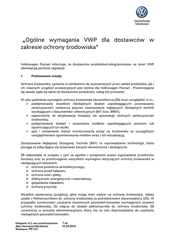 „Ogólne wymagania VWP dla dostawców w zakresie ochrony środowiska” Volkswagen Poznań informuje, że dostawców produktów/usług/procesów na teren VWP obowiązują poniższe regulacje: 1 Podstawowe zasady Ochrona środowiska, zarówno w odniesieniu do wytwarzanych przez zakład produktów, jak i ich własnych urządzeń produkcyjnych jest istotna dla Volkswagen Poznań . Przestrzegania tej zasady żąda się także od dostawców produktów, usług lub procesów. W celu spełnienia wymogów ochrony środowiska zleceniobiorca (ZB) musi uwzględnić m.in.: podejmowanie wszelkich niezbędnych działań zapobiegających powstawaniu zanieczyszczeń, zwłaszcza poprzez zastosowanie najlepszych dostępnych technik wynikających z dokumentów referencyjnych BAT (tzw. BREF), zapewnienie, że eksploatacja instalacji nie spowoduje istotnych zanieczyszczeń środowiska, podejmowanie działań i stosowanie środków zapobiegających awariom lub ograniczających ich skutki, opis i zestawienie metod monitorowania emisji na środowisko ze szczególnym uwzględnieniem opomiarowania mediów wraz z ich wizualizacją. Zastosowanie Najlepszej Dostępnej Techniki (BAT) to wprowadzenie technologii, która pociąga za sobą dające się oszacować korzyści ekonomiczne i ekologiczne. ZB odpowiada w związku z tym za zgodne z przepisami prawa wyposażenie przedmiotu dostawy oraz za przestrzeganie wszystkich wymogów dotyczących ochrony środowiska w następujących obszarach: ochrona powietrza atmosferycznego, ochrona przed hałasem, ochrona wód i gleby, efektywność energetyczna i materiałowa, gospodarka odpadami, ochrona przyrody. Wszelkie zamierzenia (projekty), jakie mogą mieć wpływ na ochronę środowiska, należy ustalić z Pełnomocnikiem ds. ochrony środowiska za pośrednictwem zleceniodawcy (ZD). W przypadku konieczności uzyskania stosownych pozwoleń/zezwoleń wymaganych prawem ochrony środowiska, ZD włącza do działań pełnomocnika ds. ochrony środowiska. ZB uczestniczy w procesie administracyjnym, który ma na celu doprowadzenie do uzyskania niezbędnych pozwoleń/zezwoleń. Kategoria: 6.1 czas przechowywania: data utworzenia/aktualizacji: Wydawca: PPP-5/5 7 lat 01.03.2016 Polityka środowiskowa i energetyczna ZD oraz zasady ochrony środowiska obowiązujące w VWP muszą być znane ZB oraz jego pracownikom zaangażowanym do realizacji danego zlecenia. Zasad tych należy przestrzegać. Uzasadnienie przyjętych rozwiązań ZB dokonuje na podstawie cyklu życia produktu oraz efektywności energetycznej, które przekazuje ZD. ZB gwarantuje, że na czas wykonywania czynności w zakładach ZD jasno uregulował kwestię odpowiedzialności i procedur związanych z ochroną środowiska. W szczególności ZB jest zobowiązany poinformować pracujących w zakładach ZD pracowników o zgodnym z zasadami ochrony środowiska zachowaniu na miejscu pracy. Należy oszczędnie obchodzić się mediami i materiałami udostępnionymi przez ZD (sprężone powietrze, energia elektryczna, woda, energia cieplna, materiały technologiczne, materiały eksploatacyjne itd.). W przypadku powstania zagrożeń lub szkód środowiskowych należy natychmiast poinformować centralę alarmową – telefon 35 4555, a w przypadku używania telefonu zewnętrznego +48 61 659 4555. 2 Pozwolenia Podczas planowania/realizacji zlecenia należy przestrzegać przepisów ochrony środowiska, prawa unijnego, krajowego i miejscowego ze szczególnym uwzględnieniem dokumentów referencyjnych BAT (tzw. BREF). Wszelkie kontakty z urzędami, niezbędne do uzyskania pozwoleń/zezwoleń środowiskowych prowadzone są przez Pełnomocnika ds. ochrony środowiska. Wszelkie dokumenty związane z wnioskami, zawiadomieniami itd. są podpisywane przez Pełnomocnika ds. ochrony środowiska i przez niego kierowane do właściwych urzędów. Wszelkie niezbędne dokumenty związane z ww. procedurami ZB udostępnia w komplecie. Podczas odbioru projektu ZB musi potwierdzić, że zostały spełnione wszystkie warunki z zakresu ochrony środowiska nałożone prawem i decyzjami. Niezbędne w związku z tym nakłady, np. na dokonanie odbioru przez rzeczoznawców lub na przeprowadzenie pomiarów, ponosi ZB, o ile w umowie nie ustalono inaczej. 3 Ochrona przed hałasem Poniższe wytyczne dotyczą budowy/rozbudowy/przebudowy urządzeń ZD emitujących hałas oraz wszystkich procesów, w tym transportu i przeładunku. Urządzenie/instalacja obejmuje wszystkie elementy generujące dźwięki na zewnątrz, w szczególności przewody rurowe, kanały, obudowy, urządzenia pomocnicze, otwory wylotowe, instalacje doprowadzające i odprowadzające powietrze. Hałas emitowany do środowiska należy utrzymywać na możliwie jak najniższym poziomie, zgodnie ze stanem techniki umożliwiającej redukcję hałasu i nie wyższym niż wartości graniczne obowiązujące na terenie chronionym, w przypadku ZD 50 dB(A) w porze dnia oraz 40dB(A) w porze nocy. Kategoria: 6.1 czas przechowywania: data utworzenia/aktualizacji: Wydawca: PPP-5/5 7 lat 01.03.2016 Wszystkie nowo instalowane/rozbudowywane/modernizowane źródła hałasu nie mogą przekraczać mocy akustycznej (ang. sound power level) wynoszącej 70 dB(A). Jeżeli z przyczyn technicznych ww. źródła hałasu nie mogą mieć mocy akustycznej nieprzekraczającej tego poziomu to wszystkie odstępstwa należy uzgodnić z pełnomocnikiem ds. ochrony środowiska. Jeżeli wśród hałasu emitowanego przez dane urządzenie występują istotne dla immisji pojedyncze dźwięki, impulsy lub składowe dźwięku o niskiej częstotliwości, wówczas ZD zastrzega sobie możliwość redukcji wartości gwarantowanej o wartości poszczególnych składowych dźwięku lub impulsu itd. (wartości dźwięków, impulsów wyizolowanych). Działania ograniczające emisję hałasu, niezbędne dla zachowania wartości granicznych na terenach chronionych akustycznie wykraczające poza możliwości techniki redukcji hałasu, należy oddzieln