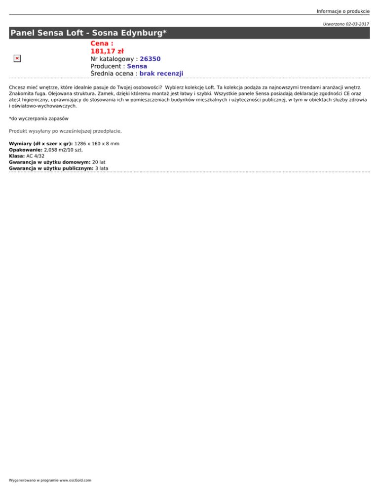 Informacje o produkcie Utworzono 02-03-2017 Panel Sensa Loft - Sosna Edynburg* Cena : 181,17 zł Nr katalogowy : 26350 Producent : Sensa Średnia ocena : brak recenzji Chcesz mieć wnętrze, które idealnie pasuje do Twojej osobowości? Wybierz kolekcję Loft. Ta kolekcja podąża za najnowszymi trendami aranżacji wnętrz. Znakomita fuga. Olejowana struktura. Zamek, dzięki któremu montaż jest łatwy i szybki. Wszystkie panele Sensa posiadają deklarację zgodności CE oraz atest higieniczny, uprawniający do stosowania ich w pomieszczeniach budynków mieszkalnych i użyteczności publicznej, w tym w obiektach służby zdrowia i oświatowo-wychowawczych. *do wyczerpania zapasów Produkt wysyłany po wcześniejszej przedpłacie. Wymiary (dł x szer x gr): 1286 x 160 x 8 mm Opakowanie: 2,058 m2/10 szt. Klasa: AC 4/32 Gwarancja w użytku domowym: 20 lat Gwarancja w użytku publicznym: 3 lata Wygenerowano w programie www.oscGold.com