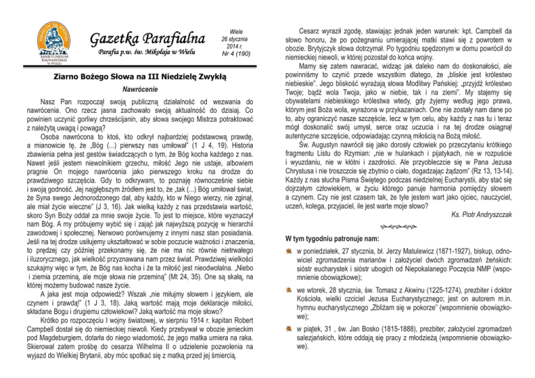 Gazetka Parafialna Parafia p.w. p.w. św. Mikołaja w Wielu Wiele 26 stycznia 2014 r. Nr 4 (190) Ziarno Bożego Słowa na III Niedzielę Zwykłą Nawrócenie Nasz Pan rozpoczął swoją publiczną działalność od wezwania do nawrócenia. Ono rzecz jasna zachowało swoją aktualność do dzisiaj. Co powinien uczynić gorliwy chrześcijanin, aby słowa swojego Mistrza potraktować z należytą uwagą i powagą? Osoba nawrócona to ktoś, kto odkrył najbardziej podstawową prawdę, a mianowicie tę, że „Bóg (...) pierwszy nas umiłował” (1 J 4, 19). Historia zbawienia pełna jest gestów świadczących o tym, że Bóg kocha każdego z nas. Nawet jeśli jestem niewolnikiem grzechu, miłość Jego nie ustaje, albowiem pragnie On mojego nawrócenia jako pierwszego kroku na drodze do prawdziwego szczęścia. Gdy to odkrywam, to poznaję równocześnie siebie i swoją godność. Jej najgłębszym źródłem jest to, że „tak (...) Bóg umiłował świat, że Syna swego Jednorodzonego dał, aby każdy, kto w Niego wierzy, nie zginął, ale miał życie wieczne” (J 3, 16). Jak wielką każdy z nas przedstawia wartość, skoro Syn Boży oddał za mnie swoje życie. To jest to miejsce, które wyznaczył nam Bóg. A my próbujemy wybić się i zająć jak najwyższą pozycję w hierarchii zawodowej i społecznej. Nerwowo porównujemy z innymi nasz stan posiadania. Jeśli na tej drodze usiłujemy ukształtować w sobie poczucie ważności i znaczenia, to prędzej czy później przekonamy się, że nie ma nic równie nietrwałego i iluzorycznego, jak wielkość przyznawana nam przez świat. Prawdziwej wielkości szukajmy więc w tym, że Bóg nas kocha i że ta miłość jest nieodwołalna. „Niebo i ziemia przeminą, ale moje słowa nie przeminą” (Mt 24, 35). One są skałą, na której możemy budować nasze życie. A jaka jest moja odpowiedź? Wszak „nie miłujmy słowem i językiem, ale czynem i prawdą!” (1 J 3, 18). Jaką wartość mają moje deklaracje miłości, składane Bogu i drugiemu człowiekowi? Jaką wartość ma moje słowo? Krótko po rozpoczęciu I wojny światowej, w sierpniu 1914 r. kapitan Robert Campbell dostał się do niemieckiej niewoli. Kiedy przebywał w obozie jenieckim pod Magdeburgiem, dotarła do niego wiadomość, że jego matka umiera na raka. Skierował zatem prośbę do cesarza Wilhelma II o udzielenie pozwolenia na wyjazd do Wielkiej Brytanii, aby móc spotkać się z matką przed jej śmiercią. Cesarz wyraził zgodę, stawiając jednak jeden warunek: kpt. Campbell da słowo honoru, że po pożegnaniu umierającej matki stawi się z powrotem w obozie. Brytyjczyk słowa dotrzymał. Po tygodniu spędzonym w domu powrócił do niemieckiej niewoli, w której pozostał do końca wojny. Mamy się zatem nawracać, widząc jak daleko nam do doskonałości, ale powinniśmy to czynić przede wszystkim dlatego, że „bliskie jest królestwo niebieskie”. Jego bliskość wyrażają słowa Modlitwy Pańskiej: „przyjdź królestwo Twoje; bądź wola Twoja, jako w niebie, tak i na ziemi”. My stajemy się obywatelami niebieskiego królestwa wtedy, gdy żyjemy według jego prawa, którym jest Boża wola, wyrażona w przykazaniach. One nie zostały nam dane po to, aby ograniczyć nasze szczęście, lecz w tym celu, aby każdy z nas tu i teraz mógł doskonalić swój umysł, serce oraz uczucia i na tej drodze osiągnął autentyczne szczęście, odpowiadając czynną miłością na Bożą miłość. Św. Augustyn nawrócił się jako dorosły człowiek po przeczytaniu krótkiego fragmentu Listu do Rzymian: „nie w hulankach i pijatykach, nie w rozpuście i wyuzdaniu, nie w kłótni i zazdrości. Ale przyobleczcie się w Pana Jezusa Chrystusa i nie troszczcie się zbytnio o ciało, dogadzając żądzom” (Rz 13, 13-14). Każdy z nas słucha Pisma Świętego podczas niedzielnej Eucharystii, aby stać się dojrzałym człowiekiem, w życiu którego panuje harmonia pomiędzy słowem a czynem. Czy nie jest czasem tak, że tyle jestem wart jako ojciec, nauczyciel, uczeń, kolega, przyjaciel, ile jest warte moje słowo? Ks. Piotr Andryszczak W tym tygodniu patronuje nam: w poniedziałek, 27 stycznia, bł. Jerzy Matulewicz (1871-1927), biskup, odnowiciel zgromadzenia marianów i założyciel dwóch zgromadzeń żeńskich: sióstr eucharystek i sióstr ubogich od Niepokalanego Poczęcia NMP (wspomnienie obowiązkowe); we wtorek, 28 stycznia, św. Tomasz z Akwinu (1225-1274), prezbiter i doktor Kościoła, wielki czciciel Jezusa Eucharystycznego; jest on autorem m.in. hymnu eucharystycznego „Zbliżam się w pokorze” (wspomnienie obowiązkowe); w piątek, 31 , św. Jan Bosko (1815-1888), prezbiter, założyciel zgromadzeń salezjańskich, które oddają się pracy z młodzieżą (wspomnienie obowiązkowe). Czy ktoś słucha? Ogłoszenia duszpasterskie 1. Dziś przypada 3. niedziela w ciągu roku liturgicznego, a zarazem jest to ostatnia niedziela stycznia, która jest obchodzona jako Światowy Dzień Trędowatych. Choroba ta jest dziś uleczalna, ale mimo to wciąż zbiera wielkie żniwo w krajach rozwijających się. 2. Wczoraj dobiegł końca tegoroczny Tydzień Modlitw o Jedność Chrześcijan. Od kilku lat dzień po jego zakończeniu, tj. 26 stycznia, obchodzony jest w Polsce i w kilku innych krajach Dzień Islamu. Jego celem jest przede wszystkim modlitwa za wyznawców islamu, ale też wzajemne, lepsze poznanie się i poszukiwanie dróg porozumienia. 3. W tym tygodniu przypada też pierwsza sobota miesiąca. W tym dniu szczególnie czcimy Matkę Najświętszą i powierzamy Jej matczynej opiece całą naszą codzienność. Po Mszy świętej porannej odmówimy różaniec. Zapraszam do wspólnej modlitwy Róże Różańcowe oraz wszystkich chętnych. 4. Dziś kończyny wizytę duszpasterską zwaną kolędą. Bóg zapłać za gościnę i składane ofiary na rzecz naszej wspólnoty. Dziś od godziny 1300 ulica Dąbrowska – po stronie lewej oraz ulica Krótka.