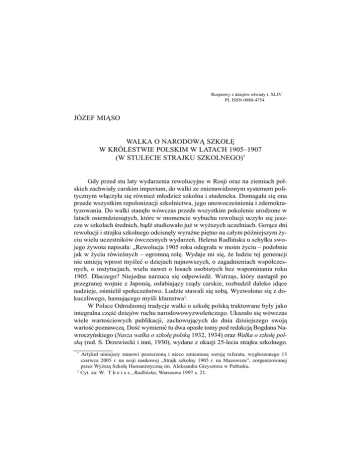 Rozprawy z dziejów owiaty t. XLIV PL ISSN 0080-4754 JÓZEF MI¥SO WALKA O NARODOW¥ SZKO£Ê W KRÓLESTWIE POLSKIM W LATACH 19051907 (W STULECIE STRAJKU SZKOLNEGO)* Gdy przed stu laty wydarzenia rewolucyjne w Rosji oraz na ziemiach polskich zachwia³y carskim imperium, do walki ze znienawidzonym systemem politycznym w³¹czy³a siê równie¿ m³odzie¿ szkolna i studencka. Domaga³a siê ona przede wszystkim repolonizacji szkolnictwa, jego unowoczenienia i zdemokratyzowania. Do walki stanê³o wówczas przede wszystkim pokolenie urodzone w latach osiemdziesi¹tych, które w momencie wybuchu rewolucji uczy³o siê jeszcze w szko³ach rednich, b¹d studiowa³o ju¿ w wy¿szych uczelniach. Gor¹ce dni rewolucji i strajku szkolnego odcisnê³y wyrane piêtno na ca³ym póniejszym ¿yciu wielu uczestników ówczesnych wydarzeñ. Helena Radliñska u schy³ku swojego ¿ywota napisa³a: Rewolucja 1905 roku odegra³a w moim ¿yciu podobnie jak w ¿yciu rówienych ogromn¹ rolê. Wydaje mi siê, ¿e ludzie tej generacji nie umiej¹ wprost myleæ o dziejach najnowszych, o zagadnieniach wspó³czesnych, o instytucjach, wielu nawet o losach osobistych bez wspominania roku 1905. Dlaczego? Niejedna narzuca siê odpowied. Wstrz¹s, który nast¹pi³ po przegranej wojnie z Japoni¹, os³abiaj¹cy rz¹dy carskie, rozbudzi³ daleko id¹ce nadzieje, omieli³ spo³eczeñstwo. Ludzie stawali siê sob¹. Wyzwolono siê z dokuczliwego, hamuj¹cego myli k³amstwa1. W Polsce Odrodzonej tradycje walki o szko³ê polsk¹ traktowane by³y jako integralna czêæ dziejów ruchu narodowowyzwoleñczego. Ukaza³o siê wówczas wiele wartociowych publikacji, zachowuj¹cych do dnia dzisiejszego swoj¹ wartoæ poznawcz¹. Doæ wymieniæ tu dwa opas³e tomy pod redakcj¹ Bogdana Nawroczyñskiego (Nasza walka o szko³ê polsk¹ 1932, 1934) oraz Walka o szko³ê polsk¹ (red. S. Drzewiecki i inni, 1930), wydane z okazji 25-lecia strajku szkolnego. Artyku³ niniejszy stanowi poszerzon¹ i nieco zmienion¹ wersjê referatu, wyg³oszonego 13 czerwca 2005 r. na sesji naukowej Strajk szkolny 1905 r. na Mazowszu, zorganizowanej przez Wy¿sz¹ Szko³ê Humanistyczn¹ im. Aleksandra Gieysztora w Pu³tusku. 1 Cyt. za: W. T h e i s s , Radliñska, Warszawa 1997 s. 21. * 76 JÓZEF MI¥SO Cennym ród³em pozwalaj¹cym na poznanie nie tylko dziejów walki m³odzie¿y o now¹ szko³ê, lecz i jej aspiracji intelektualnych oraz sposobów ich zaspokajania, s¹ ksiêgi pami¹tkowe, wydane staraniem wychowanków niektórych gimnazjów2. W czasach Polski Ludowej obchodzono 50-lecie rewolucji w 1955 r., akcentuj¹c przede wszystkim jej polityczne i klasowe oblicze oraz cis³y zwi¹zek z rosyjskim ruchem robotniczym. Dopiero w 1976 r. ukaza³a siê ksi¹¿ka Stanis³awa Kalabiñskiego i Feliksa Tycha pt. Czwarte powstanie czy pierwsza rewolucja. Lata 19051907 na ziemiach polskich, która ukazywa³a rewolucjê jako rodzaj narodowego, niepodleg³ociowego zrywu, który ogarn¹³ znaczn¹ czêæ polskiego spo³eczeñstwa. Strajk szkolny w zaborze rosyjskim nie doczeka³ siê do tej pory gruntownej, ród³owej monografii. Ksi¹¿ka Micha³a Szulkina, wydana przez Ossolineum w 1959 r. (Strajk szkolny 1905 roku), oparta na licznych dokumentach, przechowywanych w polskich archiwach, nadal zachowuje swoj¹ wartoæ informacyjn¹. Niewielk¹ wartoæ naukow¹ ma ksi¹¿eczka Teofila Wojeñskiego (Walka o szko³ê polsk¹ w okresie rewolucji 1905 r. PZWS 1960), oparta g³ównie na niektórych dawniejszych opracowaniach i grzesz¹ca jednostronnoci¹ s¹dów. Doæ du¿o napisano o strajkach dziatwy polskiej w zaborze pruskim. Do popularnej przedwojennej ksi¹¿ki Mieczys³awa Jabczyñskiego (Walka dziatwy polskiej z prusk¹ szko³¹, Poznañ 1930) dodano kilka ród³owych opracowañ. Wymieniæ tu trzeba liczne prace Ludwika Gomolca, w szczególnoci jego ksi¹¿kê pt. We Wrzeni przed szeædziesiêciu laty 19011961 (Poznañ 1961) oraz zbiór studiów pod redakcj¹ Zdzis³awa Grota pt. Wydarzenia wrzesiñskie (Poznañ 1964). Cenny wk³ad do badañ nad strajkami szkolnymi wnosi praca zachodnioniemieckiego historyka Rudolfa Kortha, oparta miêdzy innymi na oficjalnych dokumentach w³adz pruskich3. Swoj¹ wartoæ zachowuje do dzi ksi¹¿ka amerykañskiego historyka R. W. Timsa, oparta na materia³ach archiwalnych pozyskanych w Polsce i w Niemczech przed 1939 r.4 O ruchu patriotycznym wród m³odzie¿y zaboru pruskiego pisa³ zas³u¿ony gdañski historyk Jerzy Szews5. Pocz¹tek strajkowi szkolnemu w Królestwie Polskim da³a m³odzie¿ kilku warszawskich szkó³ rednich, która 28 stycznia 1905 r., na znak solidarnoci z powszechnym strajkiem polskich robotników, porzuci³a zajêcia i t³umnie wyleg³a na Por: Ksiêga Pami¹tkowa Kielczan 18561904, Warszawa 1925; Ksiêga Pami¹tkowa Wychowañców Gimnazjum Ziemi Kujawskiej, W³oc³awek 1931, Ksiêga Pami¹tkowa Siedlczan (18441905), Warszawa 1927; Ksiêga Pami¹tkowa Ko³a P³occzan, Warszawa 1931. 3 P. K o r t h , Die preussische Schulpolitik und die polnischen Schulstreiks. Ein Beitrag zur preussischen Polenpolitik der Ära Bülow, Würzburg 1963. 4 R. W. T i m s , Germanizing Prussian Poland. The H-K-T Society and struggle for the Eastern Marches in the German Empire 18941919, New York 1966. 5 J. S z e w s , Filomaci Pomorscy. Tajne zwi¹zki m³odzie¿y polskiej na Pomorzu Gdañskim w latach 18301920, Warszawa 1992. 2 WALKA O NARODOW¥ SZKO£Ê W KRÓLESTWIE POLSKIM W LATACH 19051907 77 ulice stolicy. Bunt m³odzie¿y obj¹³ wkrótce ca³e Królestwo Polskie i doprowadzi³ do niemal ca³kowitego wyludnienia szkó³ rednich i wy¿szych, a w dalszej kolejnoci, równie¿ pocz¹tkowych. Jedn¹ z g³ównych przyczyn tego buntu by³a rosyjska polityka owiatowa w Królestwie Polskim zapocz¹tkowana po powstaniu styczniowym, która na miejsce szko³y narodowej wprowadzi³a szko³ê rosyjsk¹. Krótkotrwa³a odwil¿ polityczna, poprzedzaj¹ca wybuch powstania 1863 r., umo¿liwi³a gruntown¹ reformê i odbudowê szkolni