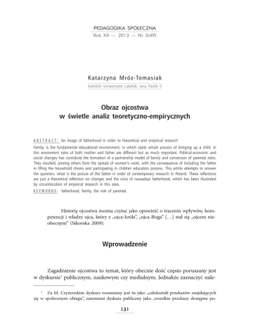 bicki temat przemian ojcostwa jest coraz częściej obecny w świadomości społecznej, co skutkuje podjęciem dyskusji o wygląd ...współczesnej polskiej rodziny i polskich ojców (Kubicki 2009, s. 78).