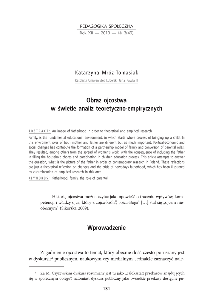 ukazującym różnorodne oblicza współczesnego ojcostwa. Analiza zjawiska została dokonana na podstawie studium literatury z zakresu ojcostwa; zawiera również omówienie wyników badan empirycznych oraz własną obserwację problemu.
