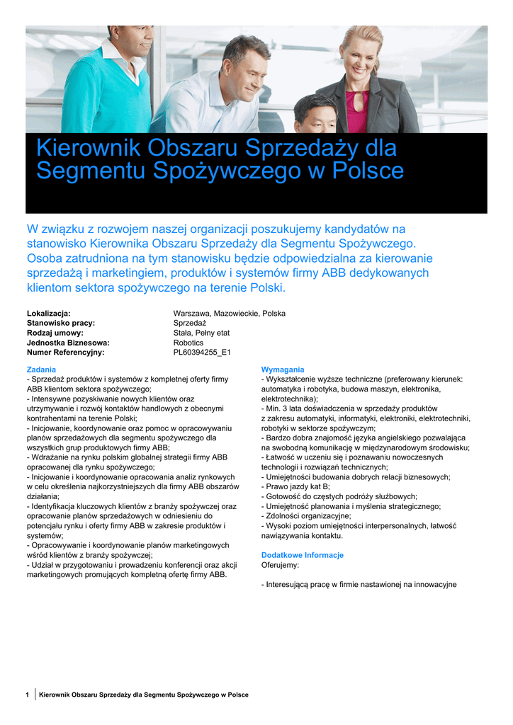 Kierownik Obszaru Sprzedaży dla Segmentu Spożywczego w Polsce W związku z rozwojem naszej organizacji poszukujemy kandydatów na stanowisko Kierownika Obszaru Sprzedaży dla Segmentu Spożywczego. Osoba zatrudniona na tym stanowisku będzie odpowiedzialna za kierowanie sprzedażą i marketingiem, produktów i systemów firmy ABB dedykowanych klientom sektora spożywczego na terenie Polski. Lokalizacja: Stanowisko pracy: Rodzaj umowy: Jednostka Biznesowa: Numer Referencyjny: Warszawa, Mazowieckie, Polska Sprzedaż Stała, Pełny etat Robotics PL60394255_E1 Zadania - Sprzedaż produktów i systemów z kompletnej oferty firmy ABB klientom sektora spożywczego; - Intensywne pozyskiwanie nowych klientów oraz utrzymywanie i rozwój kontaktów handlowych z obecnymi kontrahentami na terenie Polski; - Inicjowanie, koordynowanie oraz pomoc w opracowywaniu planów sprzedażowych dla segmentu spożywczego dla wszystkich grup produktowych firmy ABB; - Wdrażanie na rynku polskim globalnej strategii firmy ABB opracowanej dla rynku spożywczego; - Inicjowanie i koordynowanie opracowania analiz rynkowych w celu określenia najkorzystniejszych dla firmy ABB obszarów działania; - Identyfikacja kluczowych klientów z branży spożywczej oraz opracowanie planów sprzedażowych w odniesieniu do potencjału rynku i oferty firmy ABB w zakresie produktów i systemów; - Opracowywanie i koordynowanie planów marketingowych wśród klientów z branży spożywczej; - Udział w przygotowaniu i prowadzeniu konferencji oraz akcji marketingowych promujących kompletną ofertę firmy ABB. Wymagania - Wykształcenie wyższe techniczne (preferowany kierunek: automatyka i robotyka, budowa maszyn, elektronika, elektrotechnika); - Min. 3 lata doświadczenia w sprzedaży produktów z zakresu automatyki, informatyki, elektroniki, elektrotechniki, robotyki w sektorze spożywczym; - Bardzo dobra znajomość języka angielskiego pozwalająca na swobodną komunikację w międzynarodowym środowisku; - Łatwość w uczeniu się i poznawaniu nowoczesnych technologii i rozwiązań technicznych; - Umiejętności budowania dobrych relacji biznesowych; - Prawo jazdy kat B; - Gotowość do częstych podróży służbowych; - Umiejętność planowania i myślenia strategicznego; - Zdolności organizacyjne; - Wysoki poziom umiejętności interpersonalnych, łatwość nawiązywania kontaktu. Dodatkowe Informacje Oferujemy: - Interesującą pracę w firmie nastawionej na innowacyjne 1 Kierownik Obszaru Sprzedaży dla Segmentu Spożywczego w Polsce rozwiązania i nowoczesne technologie; - Możliwość rozwoju zawodowego w międzynarodowym środowisku i podnoszenia kwalifikacji zawodowych w różnych obszarach; - Stabilność zatrudnienia w firmie o ugruntowanej pozycji rynkowej; - Atrakcyjne warunki zatrudnienia uzależnione od doświadczenia i posiadanych umiejętności; - Miłą atmosferę pracy. Informacje dodatkowe: Osoby zainteresowane prosimy o przesyłanie CV za pośrednictwem naszej strony klikając na przycisk „Aplikuj”. Zastrzegamy sobie prawo odpowiedzi wyłącznie na wybrane oferty. Wszystkie oferty powinny zawierać klauzulę: „Wyrażam zgodę na przetwarzanie moich danych osobowych zawartych w ofercie pracy zgodnie z Ustawą z dnia 29 sierpnia 1997 o ochronie danych osobowych (tekst jednolity Dz. U. 2002.101.926. z późn. zm.) dla potrzeb niezbędnych do realizacji procesu rekrutacji”. ABB (ABBN: SIX Swiss Ex) jest liderem w technologiach dla energetyki, robotyki i systemów napędowych automatyki przemysłowej i sieci energetycznych, obsługującym klientów z sektora użyteczności publicznej, przemysłu oraz transportu i infrastruktury na całym świecie. Kontynuując ponad 125-letnią historię innowacji, obecnie ABB tworzy przyszłość cyfryzacji przemysłu odgrywając kluczową rolę w rewolucji energetycznej i czwartej rewolucji przemysłowej. Grupa ABB zatrudnia około 132 000 pracowników w ponad 100 krajach świata. www.abb.pl Our ambition. Your legacy. 2 Kierownik Obszaru Sprzedaży dla Segmentu Spożywczego w Polsce