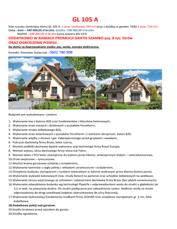 GL 105 A Stan surowy zamknięty domu GL 105 A o pow. użytkowej 104 m2 wraz z działką nr geodez. 5492 o pow. 724 m2. Cena : dom – 340 000,00 zł brutto, działka- 108 000,00 zł brutto RAZEM - 448 000,00 zł brutto (cena zawiera 8% VAT) DODATKOWO W RAMACH PROMOCJI GRATIS SZAMBO poj. 8 tys. litrów ORAZ OGRODZENIE POSESJI. Do domu są doprowadzone media: gaz, woda, energia elektryczna. Kontakt: Stanisław Stolarczyk : 0602 780 908 Budynek jest wybudowany i zawiera: 1. Wykonanie ław z betonu B20 oraz fundamentów z bloczków betonowych, 2. Wykonanie ścian nośnych i działowych z pustaków Porotherm, 3. Wykonanie stropu żelbetowego B20, 4. Wykonanie ścian kolankowych z pustaków Porotherm i z wieńcem zbrojonym, beton B20, 5. Wykonanie więźby z drzewa I gat. Zabezpieczonego przed grzybami i owadami, 6. Pokrycie dachówką firmy Braas, kolor czarny, 7. Montaż podbitki dachowej będzie wykonany w/g technologii firmy Royal Europa, 8. Montaż wyłazu, okna dachowego firmy Velux lub Fakro, 9. Montaż okien z PCV kolor zewnętrzny do wyboru przez klienta, wewnętrznym białym – sześciokomorowe, 10.Drzwi wejściowe – tymczasowe, 11.Montaż bramy garażowej uchylnej z ociepleniem, 12.Wykonanie kominów z cegły pełnej z wkładami ceramicznymi i ociepleniem, 13.Ocieplenie budynku styropianem z tynkiem mineralnym w kolorze wybranym przez klienta (kolory jasne), 14.Wykonanie wylewek betonowych (tzw. chudy beton) na parterze oraz schodów żelbetowych na poddasze, 15.Wykonanie tarasu wejściowego ze schodami i zadaszeniem dachówką firmy Braas (bez płytek ceramicznych), 16.Wykonanie odwodnienia budynku wg technologii PipeLife z odprowadzeniem wody do studni o głębokości ok. 2,5 m wyk. na powyższej działce. Do studni podłączone jest odwodnienie rynien. Nadmiar wody ze studni odprowadzony do drogi osiedlowej (odpływ ukierunkowany do ulicy Rzecznej), 17.Wykonanie hydroizolacji fundamentu środkami firmy IZOHAN oraz ocieplenie styropianem gr. 5 cm, folia kubełkowa, 18.Dodatkowy pokój nad garażem. 19.Kostka brukowa przed wjazdem do garażu 20.Działka ogrodzona. PROMOCJA: wykonanie ogrodzenia z siatki powlekanej oraz bramy wjazdowej z furtką ze słupkami z cegły klinkierowej. (5) DODATKOWY POKÓJ RZUT PARTERU RZUT PODDASZA 1. przedsionek 2,75 m2 2. kuchnia 6,65 m2 3. hall z komunikacją 4,95 m2 4. pokój dzienny z jadalnią 27,75 m2 5. w.c. z piecem c.o. 3,65 m2 6. garaż 18,90 m2 1. Hall ze schodami 2,05 m2 2. Łazienka 4,75 m2 3. Pokój 8,95 m2 4. Pokój 11,45 m2 5. Pokój 18,90 m2 Powierzchnia netto (podłóg) Parteru i poddasza 133,75 m2 Powierzchnia całkowita 165,25 m2 Powierzchnia tarasów i schodów zewnętrznych nie wchodzą do powierzchni zabudowy 21,20 m2 Wysokość budynku 7.37 m UWAGA: 1. Pozostałe prace wykończeniowe w systemie tzw. developerskim możemy wykonać, ale już w drugim etapie wg odrębnej umowy i propozycji klienta, 2. Pomagamy w przygotowaniu dokumentów niezbędnych do otrzymania kredytu na dogodnych warunkach w bankach, z którymi współpracuje Grupa Polskie Składy Budowlane. ZAPRASZAMY DO ODWIEDZENIA NASZEGO OSIEDLA, ISTNIEJE MOŻLIWOŚĆ NEGOCJACJI CEN.