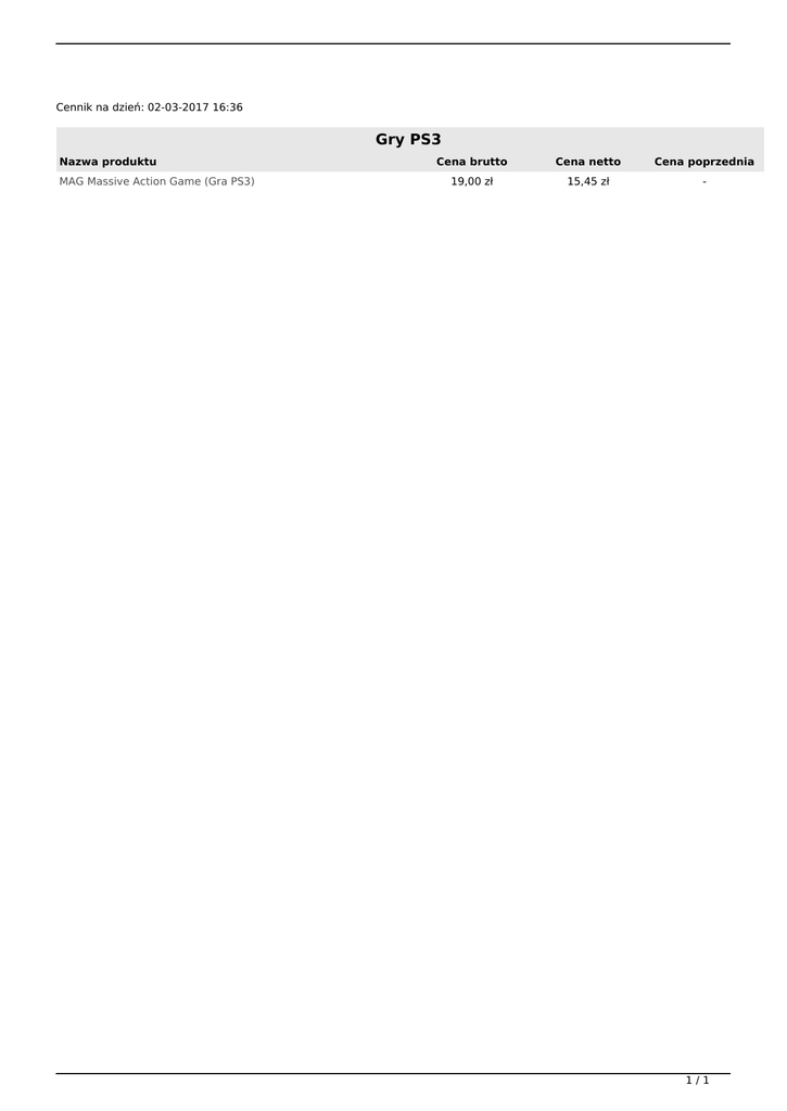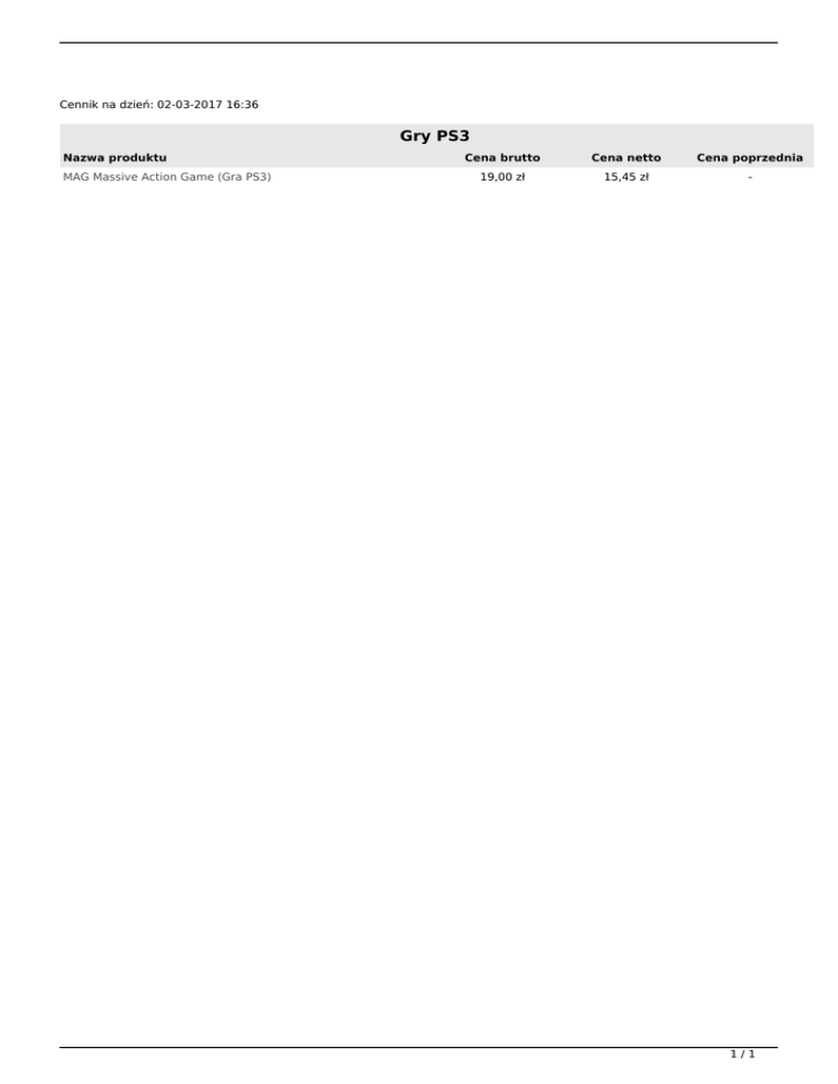 Cennik na dzień: 02-03-2017 16:36 Gry PS3 Nazwa produktu MAG Massive Action Game (Gra PS3) Cena brutto Cena netto Cena poprzednia 19,00 zł 15,45 zł - 1/1 Powered by TCPDF (www.tcpdf.org)