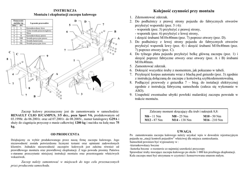 Kolejność czynności przy montażu INSTRUKCJA Montażu i eksploatacji zaczepu kulowego Oznaczenie zacisku wg ISO PN 1 L 2 + 3 31 4 R 5 58R 6 54 7 58L D Łączenie przewodów D 7 5 Kierunkowskazy lewe Tylne światła przeciwmgłowe Masa Kierunkowskazy prawe Światła pozycyjne prawe Światła hamowania Światła pozycyjne lewe B 6 A 7 C C 9 8 1 A 4 7 8 7 2 3 B 1. Zdemontować zderzak. 2. Do podłużnicy z prawej strony pojazdu do fabrycznych otworów przyłożyć wsporniki (poz. 5 i 6): - wspornik (poz. 5) przyłożyć z prawej strony, - wspornik (poz. 6) przyłożyć z lewej strony, i skręcić śrubami M10x40mm (poz. 7) poprzez otwory (poz. D). 3. Do podłużnicy z lewej strony pojazdu do fabrycznych otworów przyłożyć wspornik lewy (poz. 4) i skręcić śrubami M10x40mm (poz. 7) poprzez otwory (poz. C). 4. Do tylnego płata pojazdu przyłożyć belkę główną zaczepu (poz. 1) i skręcić poprzez fabryczne otwory oraz otwory (poz. A i B) śrubami M10x40mm. 5. Zamontować zderzak. 6. Dokręcić wszystkie śruby z momentem, jak pokazano w tabeli. 7. Przykręcić korpus automatu wraz z blachą pod gniazdo (poz. 3) zgodnie z instrukcją dołączaną do zaczepu z końcówką szybkodemontowalną. 8. Podłączyć przewody z gniazdka 7 – bieg. do instalacji elektrycznej zgodnie z instrukcją fabryczną samochodu (zaleca się wykonanie w ASO). 9. Uzupełnić ewentualne ubytki powłoki malarskiej zaczepu powstałe w trakcie montażu. Zaczep kulowy przeznaczony jest do zamontowania w samochodzie: RENAULT CLIO II/CAMPUS, 3/5 drz., poza Sport V6, produkowanym od 03.1998r. do 06.2001r. oraz od 07.2001r. do 08.2005r., numer katalogowy G29A i służy do ciągnięcia przyczep o masie całkowitej 1200 kg i nacisku na kulę max 75 kg. Zalecany moment skręcający dla śrub i nakrętek 8,8: M6 - 11 Nm M8 - 25 Nm M10 - 50 Nm M12 - 87 Nm M14 - 138 Nm M16 - 210 Nm OD PRODUCENTA Po zamontowaniu zaczepu kulowego należy uzyskać wpis w dowodzie rejestracyjnym pojazdu na „stacji kontroli pojazdów” właściwej dla miejsca zamieszkania. Samochód powinien być wyposażony w : -kierunkowskazy boczne -lusterka boczne o rozstawie co najmniej szerokości przyczepy Sprawdzać śruby mocujące zaczepu kulowego po około 1 000 km przebiegu eksploatacji. Kula zaczepu musi być utrzymana w czystości i konserwowana smarem stałym. Dziękujemy za wybór produkowanego przez naszą firmę zaczepu kulowego. Jego niezawodność została potwierdzona licznymi testami oraz opiniami zadowolonych klientów. Jednakże niezawodność zaczepów kulowych jest zależna również od prawidłowego montażu oraz prawidłowej eksploatacji. Z tego powodu prosimy Państwa o staranne przeczytanie niniejszej instrukcji montażu oraz przestrzeganie właściwych wskazówek. Zaczep należy zamontować w miejscach do tego celu przeznaczonych przez producenta samochodu. UWAGA PPUH AUTO-HAK S.J. Wyposażenie zaczepu: Produkcja Zaczepów Kulowych Henryk & Zbigniew Nejman 76-200 SŁUPSK ul. Słoneczna 16K tel/fax (059) 8-414-414; 8-414-413 E-mail: [email protected] www. autohak.com.pl Zaczep kulowy bez wyposażenia elektrycznego G29A Klasa: A50-X Nr kat. Przeznaczony do zamontowania w samochodzie: Producent: RENAULT Model: CLIO II/CAMPUS, poza Sport V6 Typ: 3/5 drz. produkowanym od 03.1998r. do 06.2001r. oraz od 07.2001r. do 08.2005r. Dane techniczne: Wartość siły D: 6,54 kN maksymalna masa przyczepy: 1200 kg maksymalny nacisk na kulę: 75 kg Numer homologacji zgodnie z wytycznymi regulaminu EKG/ONZ 55.01: E20-55R-01 4314 KARTA GWARANCYJNA Producent udziela gwarancji niniejszą kartą gwarancyjną na okres 24 miesięcy licząc od dnia zakupu zaczepu kulowego do samochodu: RENAULT CLIO II/ CAMPUS, 3/5 drz., poza Sport V6 INFORMACJA WSTĘPNA produkowanego od 03.1998r. do 06.2001r. oraz produkowanego od 07.2001r. do 08.2005r. Zaczep kulowy jest skonstruowany zgodnie z zasadami bezpieczeństwa ruchu drogowego. Zaczep kulowy jest elementem wpływającym na bezpieczeństwo jazdy i może zostać zainstalowany wyłącznie przez personel wyspecjalizowany. Niedopuszczalne jest dokonywanie jakichkolwiek zmian w konstrukcji zaczepu. Powoduje to wygaśniecie dopuszczenia do stosowania. W przypadku obecności masy izolacyjnej lub osłony podwozia w miejscu przylegania zaczepu, należy ją usunąć. Nieosłonięte miejsca karoserii oraz wywiercone otwory należy pomalować farbą antykorozyjną. Informacjami wiążącymi odnośnie wartości obciążeń są dane podawane przez producenta samochodu, względnie wartości maksymalnej masy przyczepy oraz maksymalnego nacisku na kulę, przy czym wartości parametrów zaczepu kulowego nie mogą być przekroczone. Wzór do obliczania wartości siły D: Data produkcji .............................. Data zakupu............................................. Zakres gwarancji obejmuje wyłącznie wady jakościowe wynikające z winy producenta. Gwarancja nie obejmuje natomiast uszkodzeń zawinionych przez nabywcę, wynikających z niewłaściwego montażu, użytkowania lub konserwacji, uszkodzeń mechanicznych, normalnego zużycia podczas eksploatacji itp. Gwarancja udzielona na zakupiony towar nie wyłącza, nie ogranicza ani nie zawiesza uprawnień kupującego wynikających z niezgodności towaru z umową. Reklamacje należy zgłaszać w punkcie sprzedaży, składając jednocześnie kartę gwarancyjną. Usunięcie "wady" następuje po stwierdzeniu przez punkt sprzedaży wspólnie z producentem słuszności złożonej reklamacji. Reklamacja powinna być załatwiona w ciągu 14 dni od dnia uznania reklamacji. Karta gwarancyjna jest nieważna jeżeli nie jest wypełniona i podpisana. Data zgłoszenia reklamacji: ................................................................... Maks. masa przyczepy [kg] x Maks. masa samochodu [kg] Maks. masa przyczepy [kg] + Maks. masa samochodu [kg] X 9,81 = 1000 D [kN]