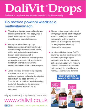 DaliVit Drops Podawana raz dziennie multiwitamina dla dzieci i niemowląt Co rodzice powinni wiedzieć o multiwitaminach. Witaminy są bardzo ważne dla zdrowia, a szczególnie istotną rolę odgrywają u dzieci, które potrzebują ich do prawidłowego wzrostu i rozwoju. Niezbędne witaminy mogą być dostarczane organizmowi w zdrowej, urozmaiconej i zrównoważonej diecie, jeśli jednak zabraknie w niej przez dłuższy czas którejkolwiek z podstawowych witamin, może dojść do spowolnienia wzrostu lub wystąpienia niektórych chorób związanych z niedoborem składników pokarmowych. Coraz częstszą przypadłością staje się uczulenie na orzeszki ziemne niedawne badania wykazały, że odsetek dotkniętych nią osób zarówno w Europie, jak i w USA podwoił się w ciągu pięciu lat. Szacuje się, że alergia na orzeszki ziemne dotyka 1 na 50 niemowląt. więcej informacji znajduje się na stronie... www.dalivit.co.uk PREPARAT DOSTĘPNY W APTECE Alergie pokarmowe najczęściej występują u dzieci pochodzących z rodzin, w których także inni członkowie rodziny są nimi dotknięci. Szczególnie narażone na alergie pokarmowe są niemowlęta z egzemą. Krople multiwitaminowe DaliVit zawierają siedem podstawowych witamin zapobiegających awitaminozie. Jedna dawka na dobę pozwala zapewnić małemu dziecku zalecane ilości witamin potrzebnych do prawidłowego rozwoju i zachowania zdrowia. BRAK ORZECHÓW W SKŁADZIE SUPLEMENTU DaliVit Słoneczna witamina dla dzieci i niemowląt Co rodzice powinni wiedzieć o witaminie D3. Przeciętne małe dziecko otrzymuje około 27% potrzebnej mu ilości witaminy D z pożywieniem, natomiast mniej niż 1 dziecko na 10 przyjmuje jakikolwiek suplement diety zawierający witaminy. Witamina D ma olbrzymie znaczenie w procesie budowy kości i wchłaniania wapnia, bez którego kości nie mogą prawidłowo się rozwijać - stają się kruche, a przy cięższych niedoborach dochodzi do krzywicy. Ministerstwo Zdrowia (DoH) zaleca, aby wszystkie dzieci w wieku od 6 miesięcy do 5 lat otrzymywały codziennie dodatkowo co najmniej 200 iu witaminy D. Bogatymi w witaminę D składnikami cotygodniowej diety dziecka powinny być: wątróbka, mięso ryb oleistych oraz żółtka jaj. Niekoniecznie są to jednak ulubione potrawy dzieci! Organizm wytwarza witaminę D dzięki reakcjom zachodzącym w skórze pod wpływem promieni słonecznych, dlatego witaminę tę nazywa się "słoneczną". We wczesnym okresie życia zapotrzebowanie organizmu na witaminę D jest wysokie, trudno jest zatem zapewnić odpowiednią jej ilość wyłącznie w diecie. W uzyskaniu właściwego bilansu pomóc może suplement diety o nazwie DaliVit. W pożywieniu występuje naturalnie jedynie ograniczona ilość witaminy D. Dlatego bardzo trudno jest zapewnić dziecku całość potrzebnej mu codziennie dawki witaminy D wyłącznie w diecie. więcej informacji znajduje się na stronie... www.dalivit.co.uk PREPARAT DOSTĘPNY W APTECE BRAK ORZECHÓW W SKŁADZIE SUPLEMENTU