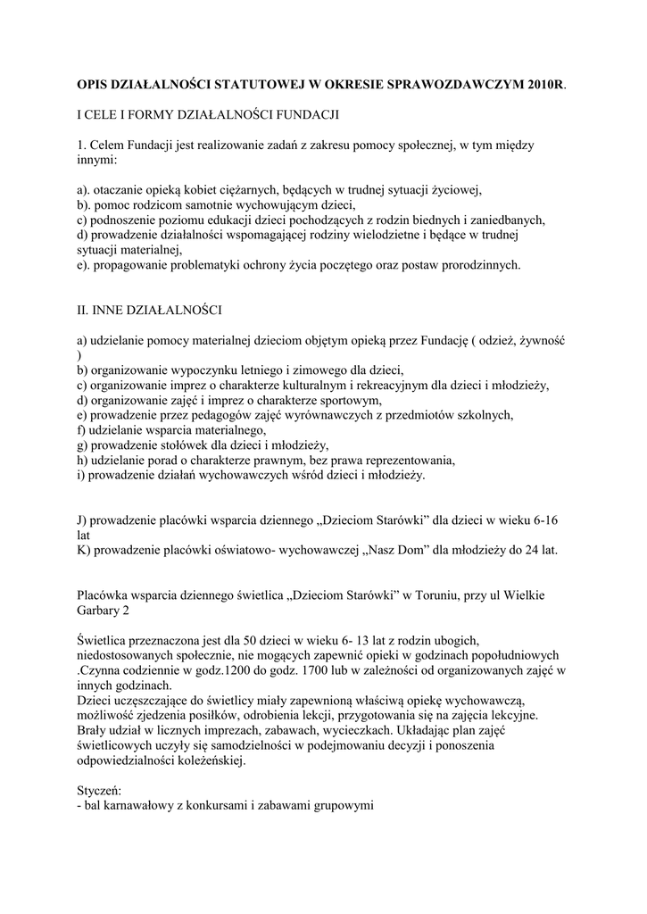 OPIS DZIAŁALNOŚCI STATUTOWEJ W OKRESIE SPRAWOZDAWCZYM 2010R. I CELE I FORMY DZIAŁALNOŚCI FUNDACJI 1. Celem Fundacji jest realizowanie zadań z zakresu pomocy społecznej, w tym między innymi: a). otaczanie opieką kobiet ciężarnych, będących w trudnej sytuacji życiowej, b). pomoc rodzicom samotnie wychowującym dzieci, c) podnoszenie poziomu edukacji dzieci pochodzących z rodzin biednych i zaniedbanych, d) prowadzenie działalności wspomagającej rodziny wielodzietne i będące w trudnej sytuacji materialnej, e). propagowanie problematyki ochrony życia poczętego oraz postaw prorodzinnych. II. INNE DZIAŁALNOŚCI a) udzielanie pomocy materialnej dzieciom objętym opieką przez Fundację ( odzież, żywność ) b) organizowanie wypoczynku letniego i zimowego dla dzieci, c) organizowanie imprez o charakterze kulturalnym i rekreacyjnym dla dzieci i młodzieży, d) organizowanie zajęć i imprez o charakterze sportowym, e) prowadzenie przez pedagogów zajęć wyrównawczych z przedmiotów szkolnych, f) udzielanie wsparcia materialnego, g) prowadzenie stołówek dla dzieci i młodzieży, h) udzielanie porad o charakterze prawnym, bez prawa reprezentowania, i) prowadzenie działań wychowawczych wśród dzieci i młodzieży. J) prowadzenie placówki wsparcia dziennego „Dzieciom Starówki” dla dzieci w wieku 6-16 lat K) prowadzenie placówki oświatowo- wychowawczej „Nasz Dom” dla młodzieży do 24 lat. Placówka wsparcia dziennego świetlica „Dzieciom Starówki” w Toruniu, przy ul Wielkie Garbary 2 Świetlica przeznaczona jest dla 50 dzieci w wieku 6- 13 lat z rodzin ubogich, niedostosowanych społecznie, nie mogących zapewnić opieki w godzinach popołudniowych .Czynna codziennie w godz.1200 do godz. 1700 lub w zależności od organizowanych zajęć w innych godzinach. Dzieci uczęszczające do świetlicy miały zapewnioną właściwą opiekę wychowawczą, możliwość zjedzenia posiłków, odrobienia lekcji, przygotowania się na zajęcia lekcyjne. Brały udział w licznych imprezach, zabawach, wycieczkach. Układając plan zajęć świetlicowych uczyły się samodzielności w podejmowaniu decyzji i ponoszenia odpowiedzialności koleżeńskiej. Styczeń: - bal karnawałowy z konkursami i zabawami grupowymi - Dzień Babci i Dziadka – występy artystyczne przeplatane konkursami i wspólnymi zabawami - zabawy zimowe w terenie, lepienie bałwana, bitwa na śnieżki, konkurs na najładniejszego aniołka - wizyta w klubie garnizonowym na dziecięcych występach oraz na seansie dla dzieci - wizyta przedstawiciela Straży Miejskiej – rozmowa na temat bezpiecznych ferii oraz ogłoszenie konkursu bezpieczne ferie. - zajęcia artystyczne w Galerii Wozownia - przedstawienie teatralne w Baju Pomorskim „Afrykańska opowieść” - podsumowanie konkursu Bezpieczne ferie w Cinema City na seansie „Opowieść wigilijna” Luty: - „Walentynki w świetlicy”- dyskoteka połączona z przekazywaniem sobie listów, prezentacja przygotowanych wierszy i scenek, konkurs na najładniejszą walentynkę - tydzień z Harrym Potterem – oglądanie filmu, zabawa w magiczną szkołę, wykonywanie scenografii do szkoły czarów - konkurs związany z urodzinami Mikołaja Kopernika Marzec: - wyjście do Cinema City na seans filmowy „ Alicja w krainie czarów”3D -wizyta w CSW – tworzenie kapeluszy z różnych materiałów, zajęcia nawiązujące do filmu - Dzień Kobiet – uroczyste wręczenie prezentów i własnoręcznie wykonanych laurek przez chłopców Maj: - Dzień Matki – występy artystyczne, śmieszne scenki i wiersze, wykonywanie układu muzycznego, wspólny poczęstunek - miesiąc Disneya – zapoznanie się z twórczością Disneya, zajęcia plastyczne, oglądanie bajek, czytanie bajek, konkursy związane z jego twórczością na podsumowanie miesiąca - dzień ekologiczny – zajęcia związane z ekologią w terenie, zadania do wykonania przez grupy, podsumowanie z nagrodami, nadanie odznak młodych ekologów Czerwiec Dzień Dziecka -gry i zabawy świetlicowe. Zakończenie roku szkolnego – pożegnanie szóstoklasistów upominkami, gry i zabawy świetlicowe. Wakacje - wyjścia na place zabaw, na boisko, - poznawanie miasta, spacery z przewodnikiem - dzieci brały udział w zajęciach organizowanych przez miasto - zajęcia organizowane przez Straż Miejską „ Bezpieczne wakacje” - zajęcia w CSW, klubie NRD ( oglądanie filmu, w którym dzieci brały udział) oraz w Wozowni. - wycieczka do Szkoły Leśnej na Barbarce Wrzesień: - turniej sportowy na najlepszego ratownika - przedstawienie teatralne „ Na straganie” zdrowe odżywianie w ramach realizacji programu Danone „Podziel się posiłkiem” Październik: - Tydzień z J. Ch. Andersenem – czytanie baśni, malowanie prac plastycznych, zdobienie świetlicy pracami, przedstawienie „Dziewczynka z zapałkami” - wyjście do Ciemna City na bajkę „Żółwik Sammy”, - Halloween w świetlicy – zabawy, opowieści o duchach, wykonywanie dyń oraz nietoperzy Listopad:cie do Ciemna City na film „Zemsta Futrzaków” zajęcia rytmiczne dla dzieci z zerówek i klas I. - Andrzejki grudzień: - Mikołajki - wyjście do Cinema City: „Opowieści z Narni 3”, „ Artur i Minimki 3”, „Mysi agent” - Kolacja Wigilijna - przedstawienie jasełkowe Działalność placówki oświatowo- wychowawczej „Nasz Dom” , przy ul Grudziądzkiej 163 Placówka „Nasz Dom” jest to siłownia dla młodzieży w wieku 16-26 lat. Na zajęcia uczęszczało dziennie ok. 30-40 osób. Z zajęć skorzystały 84 osoby. Zajęcia odbywały się w grupach w zależności od stopnia zaawansowania uczestników od poniedziałku do piątku w godz. 1400 do 2000 . oraz w soboty. Integralna częścią naszego programu była współpraca z rodzicami, a także promocja rodziny. Ćwiczenia rekreacyjno- sportowe w soboty ,oprócz kształtowania ciała, charakteru i osobowości ukazały młodzieży sposób spędzania czasu wolnego z rodziną. N