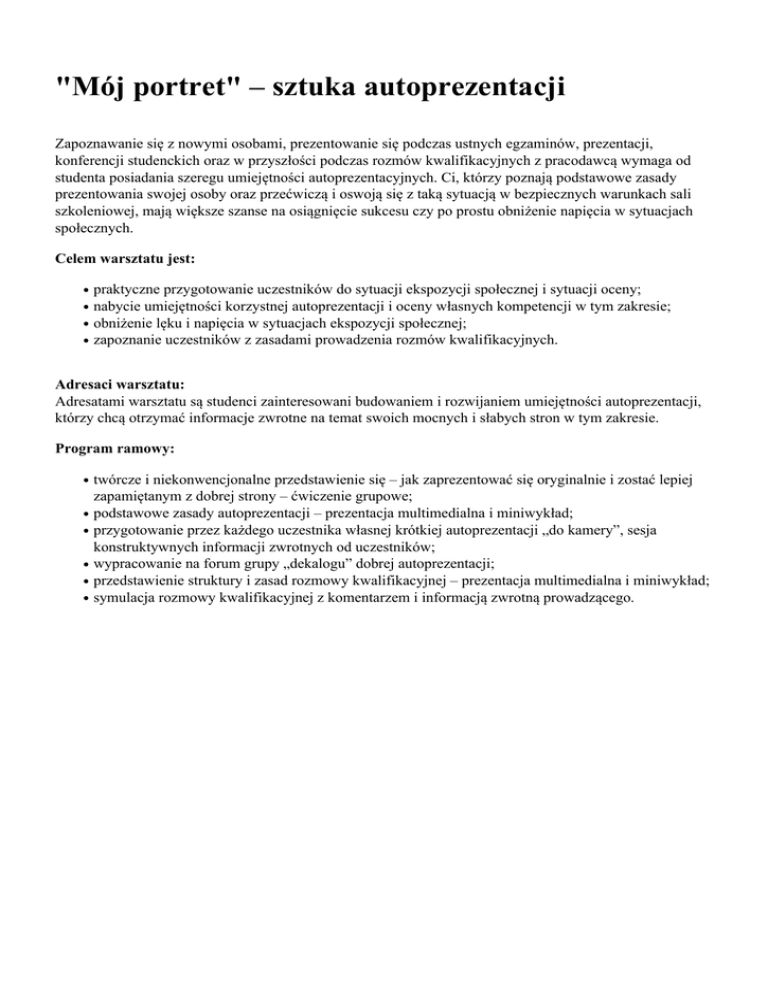 "Mój portret" – sztuka autoprezentacji Zapoznawanie się z nowymi osobami, prezentowanie się podczas ustnych egzaminów, prezentacji, konferencji studenckich oraz w przyszłości podczas rozmów kwalifikacyjnych z pracodawcą wymaga od studenta posiadania szeregu umiejętności autoprezentacyjnych. Ci, którzy poznają podstawowe zasady prezentowania swojej osoby oraz przećwiczą i oswoją się z taką sytuacją w bezpiecznych warunkach sali szkoleniowej, mają większe szanse na osiągnięcie sukcesu czy po prostu obniżenie napięcia w sytuacjach społecznych. Celem warsztatu jest: praktyczne przygotowanie uczestników do sytuacji ekspozycji społecznej i sytuacji oceny; nabycie umiejętności korzystnej autoprezentacji i oceny własnych kompetencji w tym zakresie; obniżenie lęku i napięcia w sytuacjach ekspozycji społecznej; zapoznanie uczestników z zasadami prowadzenia rozmów kwalifikacyjnych. Adresaci warsztatu: Adresatami warsztatu są studenci zainteresowani budowaniem i rozwijaniem umiejętności autoprezentacji, którzy chcą otrzymać informacje zwrotne na temat swoich mocnych i słabych stron w tym zakresie. Program ramowy: twórcze i niekonwencjonalne przedstawienie się – jak zaprezentować się oryginalnie i zostać lepiej zapamiętanym z dobrej strony – ćwiczenie grupowe; podstawowe zasady autoprezentacji – prezentacja multimedialna i miniwykład; przygotowanie przez każdego uczestnika własnej krótkiej autoprezentacji „do kamery”, sesja konstruktywnych informacji zwrotnych od uczestników; wypracowanie na forum grupy „dekalogu” dobrej autoprezentacji; przedstawienie struktury i zasad rozmowy kwalifikacyjnej – prezentacja multimedialna i miniwykład; symulacja rozmowy kwalifikacyjnej z komentarzem i informacją zwrotną prowadzącego.