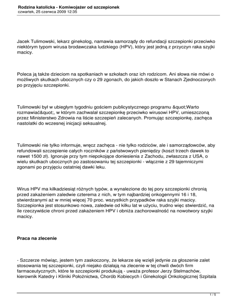 Rodzina katolicka - Komiwojażer od szczepionek czwartek, 25 czerwca 2009 12:35 Jacek Tulimowski, lekarz ginekolog, namawia samorządy do refundacji szczepionki przeciwko niektórym typom wirusa brodawczaka ludzkiego (HPV), który jest jedną z przyczyn raka szyjki macicy. Poleca ją także dzieciom na spotkaniach w szkołach oraz ich rodzicom. Ani słowa nie mówi o możliwych skutkach ubocznych czy o 29 zgonach, do jakich doszło w Stanach Zjednoczonych po przyjęciu szczepionki. Tulimowski był w ubiegłym tygodniu gościem publicystycznego programu "Warto rozmawiać", w którym zachwalał szczepionkę przeciwko wirusowi HPV, umieszczoną przez Ministerstwo Zdrowia na liście szczepień zalecanych. Promując szczepionkę, zachęca nastolatki do wczesnej inicjacji seksualnej. Tulimowski nie tylko informuje, wręcz zachęca - nie tylko rodziców, ale i samorządowców, aby refundowali szczepienie całych roczników z państwowych pieniędzy (koszt trzech dawek to nawet 1500 zł). Ignoruje przy tym niepokojące doniesienia z Zachodu, zwłaszcza z USA, o wielu skutkach ubocznych po zastosowaniu tej szczepionki - włącznie z 29 tajemniczymi zgonami po przyjęciu ostatniej dawki leku. Wirus HPV ma kilkadziesiąt różnych typów, a wynalezione do tej pory szczepionki chronią przed zakażeniem zaledwie czterema z nich, w tym najbardziej onkogennymi 16 i 18, stwierdzanymi aż w mniej więcej 70 proc. wszystkich przypadków raka szyjki macicy. Szczepionka jest stosunkowo nowa, zaledwie od kilku lat w użyciu, trudno więc stwierdzić, na ile rzeczywiście chroni przed zakażeniem HPV i obniża zachorowalność na nowotwory szyjki macicy. Praca na zlecenie - Szczerze mówiąc, jestem tym zaskoczony, że lekarze się wzięli jedynie za głoszenie zalet stosowania tej szczepionki, czyli niejako działają na zlecenie w tej chwili dwóch firm farmaceutycznych, które te szczepionki produkują - uważa profesor Jerzy Stelmachów, kierownik Katedry i Kliniki Położnictwa, Chorób Kobiecych i Ginekologii Onkologicznej Szpitala 1/5 Rodzina katolicka - Komiwojażer od szczepionek czwartek, 25 czerwca 2009 12:35 Bródnowskiego w Warszawie. - Problem skuteczności szczepionki nie jest do końca poznany, bo jest ona na rynku dopiero od kilku lat, natomiast my mamy mówić o zabezpieczeniu kobiet na całe życie. Szczepienia niewątpliwie spowodują mniejszą zachorowalność na raka szyjki macicy, bo zmniejszą infekcje HPV, to jest pewne. Tylko również jest pewne, że w stu procentach nie zlikwidują zagrożenia nowotworem złośliwym szyjki macicy - a przynajmniej te szczepionki, które obecnie są na rynku - zwraca uwagę Stelmachów. I dodaje, że szaleńczy optymizm na obecnym etapie badań i wiedzy jest nieuzasadniony: - Onkologia uczy pokory i odczekania. Jeżeli coś w tej chwili robimy: czy leczymy jakąś metodą, czy stosujemy jakąś profilaktykę, to na efekty musimy oczekiwać 10-15 lat. Dopiero potem odpowiemy, kiedy będziemy mieli konkretne liczby, że zaszczepionych zostało tyle i tyle kobiet, a wśród tych, które przebyły takie szczepienia, jest ileś zachorowań na raka. Ale to wymaga czasu - tak jak każda metoda lecznicza - uczula Stelmachów. Na Zachodzie ostrożniej W Hiszpanii 7 tys. lekarzy zaapelowało o wycofanie szczepionek z rynku. Irlandia już się wycofała, a w Niemczech i Francji jest to rozważane. Dlatego koncerny, mając kłopoty na Zachodzie, rzuciły się na rynki wschodnie. Jeden z koncernów produkujących szczepionkę półtora roku temu zapłacił w USA 5 mld USA odszkodowania tylko amerykańskim ofiarom leku przeciwbólowego Vioxx, który gwałtownie zwiększa ryzyko zawału i wylewu (ten lek był obecny także w Polsce). Czy koncern nie chce po prostu bardzo szybko wyciągnąć kilku miliardów z Polski, stosując agresywną akwizycję w celu poszerzania rynku? Producenci szczepionek chcą szczepić coraz młodsze dziewczynki, nawet dziesięcioletnie. Gdzieś w domyśle pozostaje niedopowiedziane: mogę podejmować współżycie i mieć wielu partnerów, skoro stosuję dwu- czy czterowalentną szczepionkę, to jestem w grupie bezpiecznej i raka szyjki mieć nie będę - mówi dr Ewa Ślizień-Kuczapska, specjalista ginekologii i położnictwa ze Szpitala Ginekologiczno-Położniczego św. Zofii w Warszawie. Dodaje, że poza kontaktami seksualnymi możliwość zakażenia się tym wirusem jest bardzo niewielka. - Przede wszystkim najlepszą ochroną przed wirusem HPV jest po prostu czystość. Na pewno bezpieczeństwa nie daje wczesna inicjacja seksualna i wielopartnerskość. Jedynie sytuacja, w której mężczyzna i kobieta będący w związku seksualnym pozostają sobie wierni - czyli najbardziej idealny jest po prostu związek małżeński: w tym momencie jest to pełne bezpieczeństwo - przypomina Ślizień-Kuczapska. 2/5 Rodzina katolicka - Komiwojażer od szczepionek czwartek, 25 czerwca 2009 12:35 Na jednym z wykładów w szkole doktor przekonywał: - Niestety, panuje przekonanie, że nastolatka to dziewczynka, która jeszcze nie współżyje, natomiast okazuje się, że są to dziewczyny, które współżyją od kilku lat. Ja nie jestem wcale przeciwnikiem - wręcz odwrotnie natomiast róbcie to z głową. Nie chodzi o to, że mamy zamknąć się w klatce, ewentualnie założyć pas cnoty i klucz wyrzucić do toalety. Ja bym chciał, żebyście wynieśli stąd takie przesłanie: "safe your sex" [zabezpiecz swój sex] - to jest bardzo ważne, żeby to było z głową. Czy prezerwatywę warto stosować? Zawsze warto ją mieć! Doktor zachęca nastolatki do używania środków antykoncepcyjnych - nie tylko szczegółowo je wymieniając i zachwalając ich skuteczność, ale także zapewniając, że "w razie czego" zawsze znajdzie się lekarz gotowy wypisać "pigułkę po stosunku". Podawał także adres internetowy tzw. pogotowia antykoncepcyjnego. Nieodpowiedzialna propaganda - Na obecnym etapie dane naukowe na temat działania tej szczepionki są