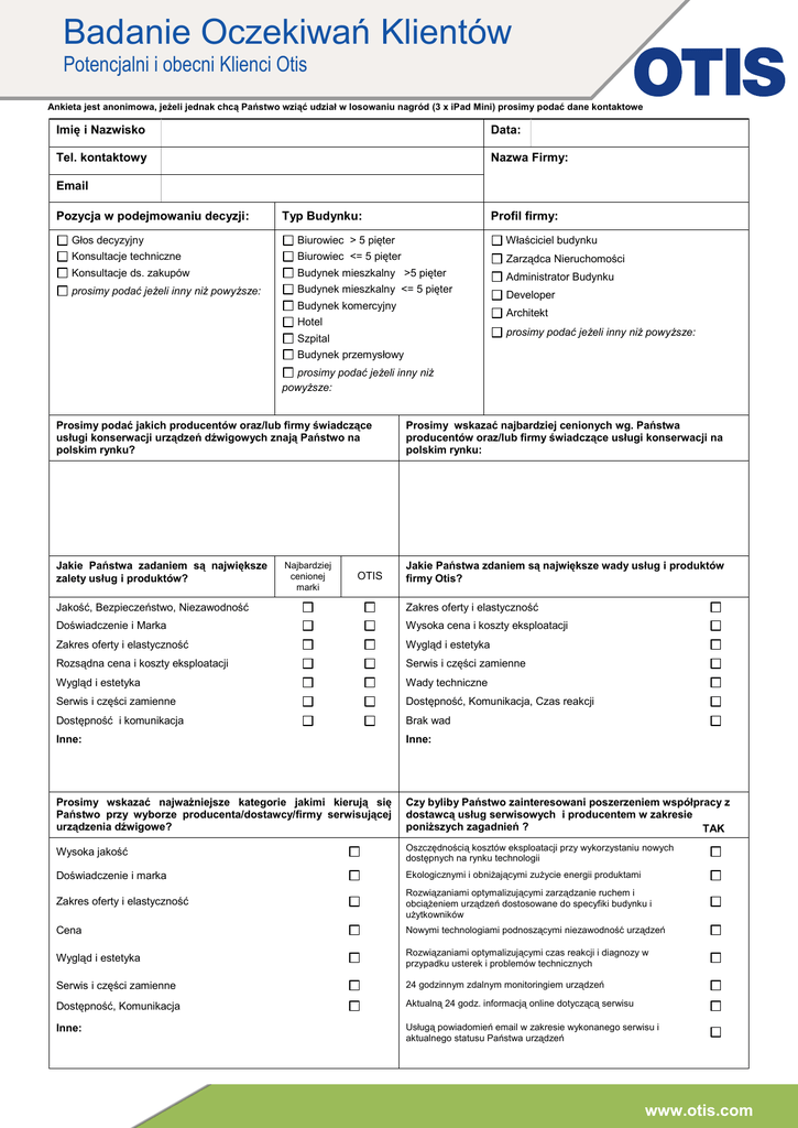 Badanie Oczekiwań Klientów Potencjalni i obecni Klienci Otis Ankieta jest anonimowa, jeżeli jednak chcą Państwo wziąć udział w losowaniu nagród (3 x iPad Mini) prosimy podać dane kontaktowe Imię i Nazwisko Data: Tel. kontaktowy Nazwa Firmy: Email Pozycja w podejmowaniu decyzji: Typ Budynku: Profil firmy: Głos decyzyjny Biurowiec > 5 pięter Właściciel budynku Konsultacje techniczne Biurowiec <= 5 pięter Zarządca Nieruchomości Konsultacje ds. zakupów Budynek mieszkalny >5 pięter Administrator Budynku prosimy podać jeżeli inny niż powyższe: Budynek mieszkalny <= 5 pięter Budynek komercyjny Developer Architekt Hotel prosimy podać jeżeli inny niż powyższe: Szpital Budynek przemysłowy prosimy podać jeżeli inny niż powyższe: Prosimy podać jakich producentów oraz/lub firmy świadczące usługi konserwacji urządzeń dźwigowych znają Państwo na polskim rynku? Prosimy wskazać najbardziej cenionych wg. Państwa producentów oraz/lub firmy świadczące usługi konserwacji na polskim rynku: Jakie Państwa zadaniem są największe zalety usług i produktów? Jakie Państwa zdaniem są największe wady usług i produktów firmy Otis? Najbardziej cenionej marki OTIS Jakość, Bezpieczeństwo, Niezawodność Zakres oferty i elastyczność Doświadczenie i Marka Wysoka cena i koszty eksploatacji Zakres oferty i elastyczność Wygląd i estetyka Rozsądna cena i koszty eksploatacji Serwis i części zamienne Wygląd i estetyka Wady techniczne Serwis i części zamienne Dostępność, Komunikacja, Czas reakcji Dostępność i komunikacja Brak wad Inne: Inne: Prosimy wskazać najważniejsze kategorie jakimi kierują się Państwo przy wyborze producenta/dostawcy/firmy serwisującej urządzenia dźwigowe? Czy byliby Państwo zainteresowani poszerzeniem współpracy z dostawcą usług serwisowych i producentem w zakresie poniższych zagadnień ? TAK Wysoka jakość Oszczędnością kosztów eksploatacji przy wykorzystaniu nowych dostępnych na rynku technologii Doświadczenie i marka Ekologicznymi i obniżającymi zużycie energii produktami Zakres oferty i elastyczność Rozwiązaniami optymalizującymi zarządzanie ruchem i obciążeniem urządzeń dostosowane do specyfiki budynku i użytkowników Cena Nowymi technologiami podnoszącymi niezawodność urządzeń Wygląd i estetyka Rozwiązaniami optymalizującymi czas reakcji i diagnozy w przypadku usterek i problemów technicznych Serwis i części zamienne 24 godzinnym zdalnym monitoringiem urządzeń Dostępność, Komunikacja Aktualną 24 godz. informacją online dotyczącą serwisu Inne: Usługą powiadomień email w zakresie wykonanego serwisu i aktualnego statusu Państwa urządzeń www.otis.com