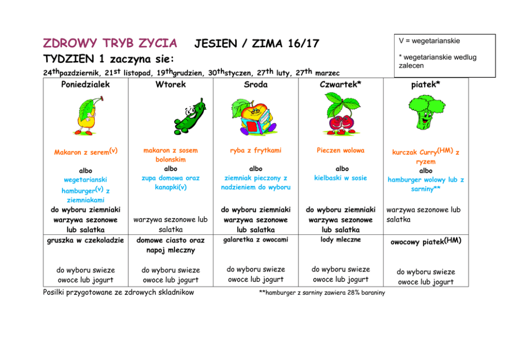 ZDROWY TRYB ZYCIA JESIEN / ZIMA 16/17 V = wegetarianskie TYDZIEN 1 zaczyna sie: 24thpazdziernik, 21st listopad, 19thgrudzien, 30thstyczen, 27th luty, 27th marzec * wegetarianskie wedlug zalecen Poniedzialek Wtorek Sroda Czwartek* piatek* Makaron z serem(v) makaron z sosem bolonskim albo zupa domowa oraz kanapki(v) ryba z frytkami Pieczen wolowa albo ziemniak pieczony z nadzieniem do wyboru albo kielbaski w sosie kurczak Curry(HM) z ryzem albo hamburger wolowy lub z sarniny** do wyboru ziemniaki warzywa sezonowe lub salatka do wyboru ziemniaki warzywa sezonowe lub salatka galaretka z owocami lody mleczne owocowy piatek(HM) do wyboru swieze owoce lub jogurt do wyboru swieze owoce lub jogurt do wyboru swieze owoce lub jogurt albo wegetarianski hamburger(v) z ziemniakami do wyboru ziemniaki warzywa sezonowe lub salatka gruszka w czekoladzie do wyboru swieze owoce lub jogurt warzywa sezonowe lub salatka domowe ciasto oraz napoj mleczny do wyboru swieze owoce lub jogurt Posilki przygotowane ze zdrowych skladnikow **hamburger z sarniny zawiera 28% baraniny warzywa sezonowe lub salatka ZDROWY TRYB ZYCIA JESIEN / ZIMA 16/17 TYDZIEN 2 zaczyna sie od: 31st pazdziernik, 28th listopad, 9th styczen, 6th luty, 6th marzec, 3rd kwiecien Poniedzialek Wtorek Sroda* czwartek piatek makaron w sosie pomidorowym(v) puree ziemniaczane z sosem miesnym kawalki dorsza(MSC) pieczen wieprzowa Pizza(v) albo filety z kurczaka albo bagietki i wrapy z nadzieniem albo serowy zawijas(v) ziemniaki gotowane ziemniaki pieczone ziemniaki gotowane albo kawalki lososia(MSC) z ziemniakami albo zupa domowa oraz kanapki(v) warzywa sezonowe lub salatka warzywa sezonowe lub salatka warzywa sezonowe lub salatka warzywa sezonowe lub salatka warzywa sezonowe lub salatka Budyn(HM) ciasto domowe oraz napoj mleczny pudding ryzowy z owocami lody oraz owoce owocowy piatek(HM) do wyboru swieze owoce lub jogurt do wyboru swieze owoce lub jogurt Posilki przygotowane ze zdrowych skladnikow do wyboru swieze owoce lub jogurt do wyboru swieze owoce lub jogurt do wyboru swieze owoce lub jogurt ZDROWY TRYB ZYCIA JESIEN / ZIMA 16/17 TYDZIEN 3 zaczyna sie od: 7th listopad, 5th grudzien, 16th styczen, 13th luty, 13th marzec Poniedzialek Makaron z serem(v) albo paluszki rybne(MSC) z gotowanymi ziemniakami Wtorek kurczak Curry(HM) z ryzem albo domowa zupa z kanapkami(v) Sroda ryba z frytkami albo Czwartek* domowy gulasz albo Ziemniak pieczony z nadzieniem do wyboru filety z lososia(MSC) warzywa sezonowe lub salatka warzywa sezonowe lub salatka warzywa sezonowe lub salatka ziemniaki pieczone warzywa sezonowe lub salatka owoce oraz budyn domowe ciasto i napoj mleczny muss budyniowy oraz owoce dzem, ciasto kokosowe oraz budyn do wyboru swieze owoce lub jogurt do wyboru swieze owoce lub jogurt do wyboru swieze owoce lub jogurt do wyboru swieze owoce lub jogurt Posilki przygotowane ze zdrowych skladnikow wszystkie posilki zostaly stworzone i zatwierdzone przez naszych dietetykow piatek* hamburger wolowy lub z sarniny ** albo makaron z sosem pomidorowym i pulpetami warzywa sezonowe lub salatka owocowy piatek(HM) do wyboru swieze owoce lub jogurt **hamburger z sarniny zawiera 28% baraniny ZDROWY TRYB ZYCIA JESIEN / ZIMA 16/17 TYDZIEN 4 zaczyna sie od: 14th listopad, 12th grudzien, 23rd styczen, 20th luty, 20th marzec Poniedzialek* Wtorek* Sroda* Czwartek Piatek Hot-dog paszteciki z ciasta francuskiego z miesem i ziemnakami paluszki rybne(MSC) oraz gotowane ziemniaki pieczen z kurczaka Pizza(v) albo kawalki lososia(MSC) albo domowa zupa oraz kanapki(v) or or sos miesny z ryzem bagietki i wrapy z nadzieniem ziemniaki pieczone warzywa sezonowe lub salatka ziemniaki gotowane warzywa sezonowe lub salatka warzywa sezonowe lub salatka warzywa sezonowe lub salatka Budyn(HM) domowe ciasto oraz napoj mleczny ciasto z kruszonka oraz budyn lody oraz owoce do wyboru swieze owoce lub jogurt do wyboru swieze owoce lub jogurt do wyboru swieze owoce lub jogurt do wyboru swieze owoce lub jogurt Posilki przygotowane ze zdrowych skladnikow or makaron w sosie pomidorowym(V) warzywa sezonowe lub salatka Owocowy piatek(HM) do wyboru swieze owoce lub jogurt