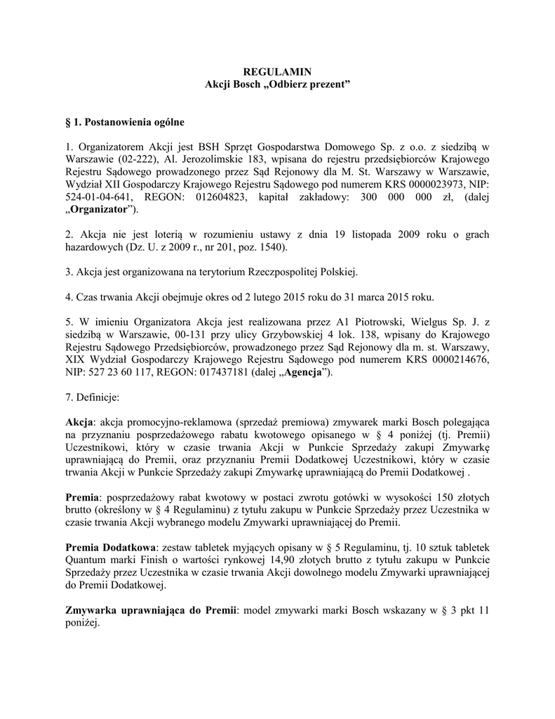 REGULAMIN Akcji Bosch „Odbierz prezent” § 1. Postanowienia ogólne 1. Organizatorem Akcji jest BSH Sprzęt Gospodarstwa Domowego Sp. z o.o. z siedzibą w Warszawie (02-222), Al. Jerozolimskie 183, wpisana do rejestru przedsiębiorców Krajowego Rejestru Sądowego prowadzonego przez Sąd Rejonowy dla M. St. Warszawy w Warszawie, Wydział XII Gospodarczy Krajowego Rejestru Sądowego pod numerem KRS 0000023973, NIP: 524-01-04-641, REGON: 012604823, kapitał zakładowy: 300 000 000 zł, (dalej „Organizator”). 2. Akcja nie jest loterią w rozumieniu ustawy z dnia 19 listopada 2009 roku o grach hazardowych (Dz. U. z 2009 r., nr 201, poz. 1540). 3. Akcja jest organizowana na terytorium Rzeczpospolitej Polskiej. 4. Czas trwania Akcji obejmuje okres od 2 lutego 2015 roku do 31 marca 2015 roku. 5. W imieniu Organizatora Akcja jest realizowana przez A1 Piotrowski, Wielgus Sp. J. z siedzibą w Warszawie, 00-131 przy ulicy Grzybowskiej 4 lok. 138, wpisany do Krajowego Rejestru Sądowego Przedsiębiorców, prowadzonego przez Sąd Rejonowy dla m. st. Warszawy, XIX Wydział Gospodarczy Krajowego Rejestru Sądowego pod numerem KRS 0000214676, NIP: 527 23 60 117, REGON: 017437181 (dalej „Agencja”). 7. Definicje: Akcja: akcja promocyjno-reklamowa (sprzedaż premiowa) zmywarek marki Bosch polegająca na przyznaniu posprzedażowego rabatu kwotowego opisanego w § 4 poniżej (tj. Premii) Uczestnikowi, który w czasie trwania Akcji w Punkcie Sprzedaży zakupi Zmywarkę uprawniającą do Premii, oraz przyznaniu Premii Dodatkowej Uczestnikowi, który w czasie trwania Akcji w Punkcie Sprzedaży zakupi Zmywarkę uprawniającą do Premii Dodatkowej . Premia: posprzedażowy rabat kwotowy w postaci zwrotu gotówki w wysokości 150 złotych brutto (określony w § 4 Regulaminu) z tytułu zakupu w Punkcie Sprzedaży przez Uczestnika w czasie trwania Akcji wybranego modelu Zmywarki uprawniającej do Premii. Premia Dodatkowa: zestaw tabletek myjących opisany w § 5 Regulaminu, tj. 10 sztuk tabletek Quantum marki Finish o wartości rynkowej 14,90 złotych brutto z tytułu zakupu w Punkcie Sprzedaży przez Uczestnika w czasie trwania Akcji dowolnego modelu Zmywarki uprawniającej do Premii Dodatkowej. Zmywarka uprawniająca do Premii: model zmywarki marki Bosch wskazany w § 3 pkt 11 poniżej. Zmywarka uprawniająca do Premii Dodatkowej: dowolny model zmywarki marki Bosch. Zmywarka objęta Akcją: Zmywarka uprawniająca do Premii oraz Zmywarka uprawniająca do Premii Dodatkowej Uczestnik Akcji: osoba fizyczna (konsument) spełniająca warunki określone w § 2 Regulaminu nabywająca Zmywarkę objętą Akcją do użytku własnego, niezwiązanego bezpośrednio z jej działalnością gospodarczą lub zawodową, w Punkcie Sprzedaży. Punkt Sprzedaży: punkt sprzedaży detalicznej znajdujący się na terenie Rzeczpospolitej Polskiej. § 2. Warunki uczestnictwa w Akcji 1. W Akcji może wziąć udział Uczestnik Akcji, który spełnia jednocześnie następujące warunki: a) ukończył 18 rok życia, b) posiada miejsce stałego zamieszkania na terytorium Rzeczpospolitej Polskiej, c) posiada pełną zdolność do czynności prawnych, d) zapoznał się z treścią Regulaminu i zaakceptował jego postanowienia, e) dokonał zakupu Zmywarki objętej Akcją w Punkcie Sprzedaży w czasie trwania Akcji, f) w przypadku Zmywarki uprawniającej do Premii – dokona zgłoszenia zakupu zgodnie z procedurą opisaną w § 3 Regulaminu. 2. W Akcji nie mogą uczestniczyć właściciele, udziałowcy, współwłaściciele lub osoby zatrudnione w jakiejkolwiek formie prawnej w punktach sprzedaży detalicznej, studiach mebli kuchennych oraz hurtowniach, prowadzących sprzedaż produktów Organizatora i członkowie rodzin w/w osób. Przez członków rodziny, o których mowa powyżej rozumie się: wstępnych, zstępnych, rodzeństwo, małżonków, małżonków rodzeństwa, rodziców małżonków, krewni w linii bocznej do II stopnia i osoby pozostające w stosunku przysposobienia. § 3. Zasady Akcji 1. W Akcji może wziąć udział Uczestnik Akcji, który w terminie od 02.02.2015 r. do 31.03.2015 r. zakupi w Punkcie Sprzedaży dowolny model Zmywarki objętej Akcją oraz spełni warunki uczestnictwa w Akcji określone w § 2 Regulaminu (dla otrzymania Premii lub Premii Dodatkowej). 2. Premię Dodatkową, określoną w § 5 Regulaminu, otrzyma Uczestnik Akcji, który kupi w czasie trwania Akcji w Punkcie Sprzedaży dowolną Zmywarkę uprawniającą do Premii Dodatkowej. Premię, określoną w § 4 Regulaminu, otrzyma Uczestnik Akcji, który kupi w czasie trwania Akcji w Punkcie Sprzedaży dowolną Zmywarkę uprawniającą do Premii oraz zgłosi udział w Akcji zgodnie z podanymi poniżej postanowieniami Regulaminu. 3. W celu wzięcia udziału w Akcji Uczestnika Akcji powinien przesłać następujące dokumenty (dalej „Zgłoszenie”): a) prawidłowo wypełniony i podpisany własnoręcznie i czytelnie kupon zamieszczony na ulotce lub wydrukowany ze strony internetowej www.bosch-home.pl, www.eksperci-od-zmywarek.pl; b) kopię faktury VAT lub kopię paragonu potwierdzającego zakup Zmywarki objętej Akcją. 4. Zgłoszenie powinno zostać wysłane na adres Agencji podany w § 1 pkt. 5 powyżej. Termin przesyłania Zgłoszeń upływa dnia 30.04.2015 roku. (decyduje data stempla pocztowego). 5. Prawidłowo wypełniony kupon powinien zawierać: (i) dane osobowe Uczestnika Akcji w postaci imienia i nazwiska Uczestnika; numer konta bankowego; adres zamieszkania Uczestnika wraz z kodem pocztowym; numer telefonu kontaktowego; adres e-mailowy kontaktowy (nieobowiązkowo); własnoręczny podpis; a także (ii) dane dotyczące modelu Zmywarki objętej Akcją. 6. Zgłoszenia niezgodne z Regulaminem, w tym Zgłoszenia urządzeń zakupionych przed 2 lutego 2015 roku lub po 31 marca 2014 roku, nie będą brały udziały w Akcji. 7. Premia będzie przesyłana do Uczestnika Akcji po otrzymaniu przez Agencję Zgłoszenia oraz po potwierdzeniu przez Agencję zgo