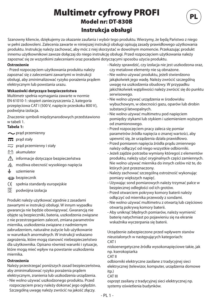 Multimetr cyfrowy PROFI Digitální multimetr PROFI Model nr: DT-830B PL CZ Model č.: DT-830B Instrukcja obsługi Návod k použití Szanowny kliencie, dziękujemy za okazanie zaufania i wybór tego produktu. Wierzymy, że będą Państwo z niego w pełni zadowoleni. Zalecenia zawarte w niniejszej instrukcji obsługi opisują zasady prawidłowego użytkowania Vážený zákazníku, děkujeme Vám za důvěru, kterou jste nám projevil nákupem tohoto výrobku. Věříme, že s ním produktu. Instrukcję należy zachować, aby móc z niej skorzystać w dowolnym momencie. Przekazując produkt budete plně spokojen. Tento návod slouží pro správné používání výrobku. Uchovejte jej pro jeho případné další innemu użytkownikowi zawsze dołączaj do niego instrukcję obsługi. Przed rozpoczęciem użytkowania należy použití. Pokud výrobek někomu předáte k užívání, předejte mu spolu s ním i tento návod k používání. Před použizapoznać się ze wszystkimi zaleceniami oraz poradami dotyczącymi sposobu użycia produktu. tím si, prosím, přečtěte všechny instrukce a rady týkající se používání tohoto výrobku. Ostrzeżenie - Należy sprawdzić, czy izolacja nie jest uszkodzona oraz, -Varování Przed rozpoczęciem użytkowania produktu należy metalowezda elementy nie są obnażone. • czy Zkontrolujte, není poškozená izolace a zda kovové zapoznać się z zaleceniami zawartymi w instrukcji - Nie wolno używać produktu, jeżeli stwierdzono části nejsou obnažené. • Před použitím si přečtete tyto pokyny, zabráníte tak obsługi, aby zminimalizować ryzyko porażenia prądem jakąkolwiek jego wadę. Należy zwrócić szczególną vzniku úrazu el. proudem nebo zranění. • Multimetr nepoužívejte, pokud vykazuje vadu. Mohlo uwagę na uszkodzenia obudowy. W przypadku elektrycznym lub powstania urazu. dojít k poškození krytu. Pokud máte pochybnosti, jakichkolwiek wątpliwości należy zwrócić się do punktu Wskazówki dotyczące bezpieczeństwa obraťte se na servisní středisko. serwisowego. Bezpečnostní pokyny Multimetr spełnia wymagania zawarte w normie •- Nie Multimetr neprovozujte v blízkosti výbušných plynů, wolno używać urządzenia w środowisku EN 61010-1: stopień zanieczyszczenia Tento multimetr odpovídá standardu 2, ENkategoria 61010-1: stuvýparů a prachu. wybuchowym, w obecności gazu, oparów lub drobin przepięciowa I (500 V, napięcie przeskoku 800 V), peň znečištěníCAT 2, přepěťová kategorie (CAT I 500V, substancji łatwopalnych. • Multimetr nepoužívejte při napětí vyšším než je podwójna izolacja. přechodné napětí 800V), dvojitá izolace - Nie wolno używać multimetru pod napięciem jmenovité napětí na multimetru, mezi svorkami nebo Znaczenie symboli międzynarodowych przedstawiono Použité mezinárodní symboly jsou uvedeny v tabulce 1. pomiędzy stykami lub stykiem i uziemieniem wyższym mezi svorkou a uzemněním. w tabeli 1. od znamionowego. • Před použitím si změřením známé hodnoty ověřte, Tabela 1:1: Tabulka - Przed rozpoczęciem zda přístroj funguje. pracy zaleca się pomiar prąd przemienny střídavý proud parametrów źródła napięcia o znanej wartości, aby • upewnić Při měření střídavého proudu nejprve vypněte el. się, że urządzenia działa prawidłowo. prąd stały stejnosměrný proud obvod. - Przed pomiarem napięcia źródła prądu zmiennego prąd przemienny i stały střídavý nebo stejnosměrný proud niego wszystkie • należy Pokud odłączyć provádíteod výměnu některýchodbiorniki. částí výrobku, akumulator baterie - Jeżeli zajdzie potrzeba wymiany któregoś z elementów používejte pouze stanovené součástky. Manometr produktu, należy użyć zamiennych. nepoužívejte jinak nežoryginalnych je uvedeno vczęści návodu. informacje dotyczące bezpieczeństwa bezpečnostní informace Nie wolno używać miernika do innych celów niż te, do • Při práci s vysokým napětím dbejte zvýšené opatrmożliwa obecność wysokiego napięcia možná přítomnost vysokého napětí których jest przeznaczony. nosti. uziemienie uzemnění - Należy zachować szczególną ostrożność wykonując • pomiary Při použití sond mějte prsty za chrániči měřících hrotů. bezpiecznik większych napięć. pojistka • Před otevřením krytu na baterie z multimetru odpojte Używając sond pomiarowych należy trzymać palce w spełniaodpovídá standardy europejskie evropským nařízením měřící kabely. bezpiecznej odległości od ich grotów. podwójna izolacja dvojitá izolace -• Przed pokrywy komorynebo baterii należy Pokudotwarciem je kryt na baterie otevřený částečně odłączyć od miernikanepoužívejte. przewody z sondami. otevřený, multimetr Produkt należy użytkować zgodnie z zasadami - Nie wolno używać multimetru z otwartą lub częściowo Výrobek používejte pouze v souladu s pokyny uvede• Abyste se vyhnuli nepřesnému měření, vyměňte batezawartymi w instrukcji obsługi. W innym wypadku otwartą pokrywą komory baterii. nými v návodu k použití. V opačném případě dojde rie, jakmile se na displeji zobrazí symbol (“”). gwarancja nie będzie obowiązywać. Gwarancją nie - Aby uniknąć błędnych pomiarów, należy wymienić k zániku záruky. Záruka se nevztahuje na pojistky, objęte są bezpieczniki, bateria, uszkodzenia związane baterię natychmiast po pojawieniu się na ekranie poškození, zanedbání pokynů, pozbaterie, nie przestrzeganiem zaleceń, uvedených zmiana parametrów wskaźnikajewyczerpania się baterii. Multimetr uzpůsoben pro prevenci přechodných změnění parametrů přístroje, jeho znečištění, zneužití miernika, uszkodzenia związane z nadmiernym jevů v těchto kategoriích: nebo používánínaturalne v abnormálních V tomto zabrudzeniem, zużyciepodmínkách. lub użytkowanie Urządzenie przednízkoenergetických wpły