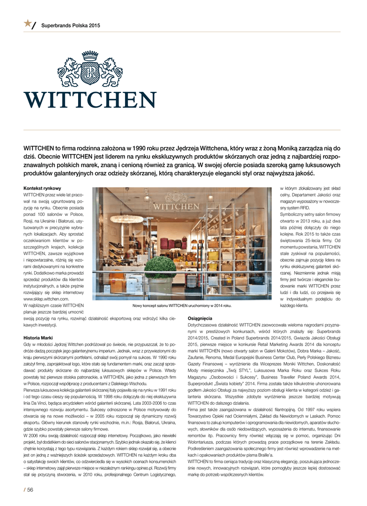 Superbrands Polska 2015 WITTCHEN to firma rodzinna założona w 1990 roku przez Jędrzeja Wittchena, który wraz z żoną Moniką zarządza nią do dziś. Obecnie WITTCHEN jest liderem na rynku ekskluzywnych produktów skórzanych oraz jedną z najbardziej rozpoznawalnych polskich marek, znaną i cenioną również za granicą. W swojej ofercie posiada szeroką gamę luksusowych produktów galanteryjnych oraz odzieży skórzanej, którą charakteryzuje elegancki styl oraz najwyższa jakość. Kontekst rynkowy w którym zlokalizowany jest skład WITTCHEN przez wiele lat pracocelny, Departament Jakości oraz wał na swoją ugruntowaną pomagazyn wyposażony w nowoczezycję na rynku. Obecnie posiada sny system RFID. ponad 100 salonów w Polsce, Symboliczny setny salon firmowy Rosji, na Ukrainie i Białorusi, usyotwarto w 2013 roku, a już dwa tuowanych w precyzyjnie wybralata później dołączyły do niego nych lokalizacjach. Aby sprostać kolejne. Rok 2015 to także czas oczekiwaniom klientów w poświętowania 25-lecia firmy. Od szczególnych krajach, kolekcje momentu powstania, WITTCHEN WITTCHEN, zawsze wyjątkowe stale zyskiwał na popularności, i niepowtarzalne, różnią się wzoobecnie zajmuje pozycję lidera na rami dedykowanymi na konkretne rynku ekskluzywnej galanterii skórynki. Dodatkowo marka prowadzi rzanej. Niezmiennie jednak misją sprzedaż produktów dla klientów firmy jest twórcze i eleganckie buinstytucjonalnych, a także prężnie dowanie marki WITTCHEN przez rozwijający się sklep internetowy ludzi i dla ludzi, co przejawia się www.sklep.wittchen.com. w indywidualnym podejściu do W najbliższym czasie WITTCHEN każdego klienta. Nowy koncept salonu WITTCHEN uruchomiony w 2014 roku. planuje jeszcze bardziej umocnić Osiągnięcia swoją pozycję na rynku, rozwinąć działalność eksportową oraz wdrożyć kilka cieDotychczasowa działalność WITTCHEN zaowocowała wieloma nagrodami przyznakawych inwestycji. nymi w prestiżowych konkursach, wśród których znalazły się: Superbrands Historia Marki 2014/2015, Created in Poland Superbrands 2014/2015, Gwiazda Jakości Obsługi Gdy w młodości Jędrzej Wittchen podróżował po świecie, nie przypuszczał, że to po2015, pierwsze miejsce w konkursie Retail Marketing Awards 2014 dla konceptu dróże dadzą początek jego galanteryjnemu imperium. Jednak, wraz z przywiezionymi do marki WITTCHEN (nowo otwarty salon w Galerii Mokotów), Dobra Marka – Jakość, kraju pierwszymi skórzanymi portfelami, odnalazł swój pomysł na sukces. W 1990 roku Zaufanie, Renoma, Medal Europejski Business Center Club, Perły Polskiego Biznesu założył firmę, zaprojektował logo, które stało się fundamentem marki, oraz zaczął sprzeGazety Finansowej – wyróżnienie dla Wiceprezes Moniki Wittchen, Doskonałość dawać produkty skórzane do najbardziej luksusowych sklepów w Polsce. Wtedy Mody miesięcznika „Twój STYL”, Luksusowa Marka Roku oraz Sukces Roku powstały też pierwsze stoiska patronackie, a WITTCHEN, jako jedna z pierwszych firm Magazynu „Osobowości i Sukcesy”, Business Traveller Poland Awards 2014, w Polsce, rozpoczął współpracę z producentami z Dalekiego Wschodu. Superprodukt „Świata kobiety” 2014. Firma została także kilkukrotnie uhonorowana Pierwsza luksusowa kolekcja galanterii skórzanej Italy pojawiła się na rynku w 1991 roku godłem Jakości Obsługi za najwyższy poziom obsługi klienta w kategorii odzież i gai od tego czasu cieszy się popularnością. W 1998 roku dołączyła do niej ekskluzywna lanteria skórzana. Wszystkie zdobyte wyróżnienia jeszcze bardziej motywują linia Da Vinci, będąca arcydziełem wśród galanterii skórzanej. Lata 2003-2006 to czas WITTCHEN do dalszego działania. intensywnego rozwoju asortymentu. Sukcesy odnoszone w Polsce motywowały do Firma jest także zaangażowana w działalność filantropijną. Od 1997 roku wspiera otwarcia się na nowe możliwości – w 2005 roku rozpoczął się dynamiczny rozwój Towarzystwo Opieki nad Ociemniałymi, Zakład dla Niewidomych w Laskach. Pomoc eksportu. Główny kierunek stanowiły rynki wschodnie, m.in.: Rosja, Białoruś, Ukraina, finansowa to zakup komputerów i oprogramowania dla niewidomych, aparatów słuchogdzie szybko powstały pierwsze salony firmowe. wych, słowników dla osób niedowidzących, wyposażenia do internatu, finansowanie W 2006 roku swoją działalność rozpoczął sklep internetowy. Początkowo, jako niewielki remontów itp. Pracownicy firmy również włączają się w pomoc, organizując Dni projekt, był dodatkiem do sieci salonów stacjonarnych. Szybko jednak okazało się, że klienci Wolontariusza, podczas których prowadzą prace porządkowe na terenie Zakładu. chętnie korzystają z tego typu rozwiązania. Z każdym rokiem sklep rozwijał się, a obecnie Podkreśleniem zaangażowania społecznego firmy jest również wprowadzenie na metjest on jedną z ważniejszych ścieżek sprzedażowych. WITTCHEN na każdym kroku dba kach i opakowaniach produktów pisma Braille’a. o satysfakcję swoich klientów, co odzwierciedla się w wysokich ocenach konsumenckich WITTCHEN to firma ceniąca tradycję oraz klasyczną elegancję, poszukująca jednocze– sklep internetowy zajął pierwsze miejsce w niezależnym rankingu opineo.pl. Rozwój firmy śnie nowych, innowacyjnych rozwiązań, które pomogłyby jeszcze lepiej dostosować stał się przyczyną stworzenia, w 2010 roku, profesjonalnego Centrum Logistycznego, markę do potrzeb współczesnych klientów. / 56 wittchen Oferta Poza aktywnością reklamową oraz marketingową, WITTCHEN prowadzi intensywne WITTCHEN jest prestiżową firmą z dwudziestopięcioletnią tradycją, a jej historia działania z zakresu PR, których celem jest promowanie produktów marki w mediach. rozpoczęła się od sprzedaży galanterii skórzanej. Na tego rodzaju produktach O skuteczności podjętych działań świadczy fakt, że w ciągu roku ukazuje