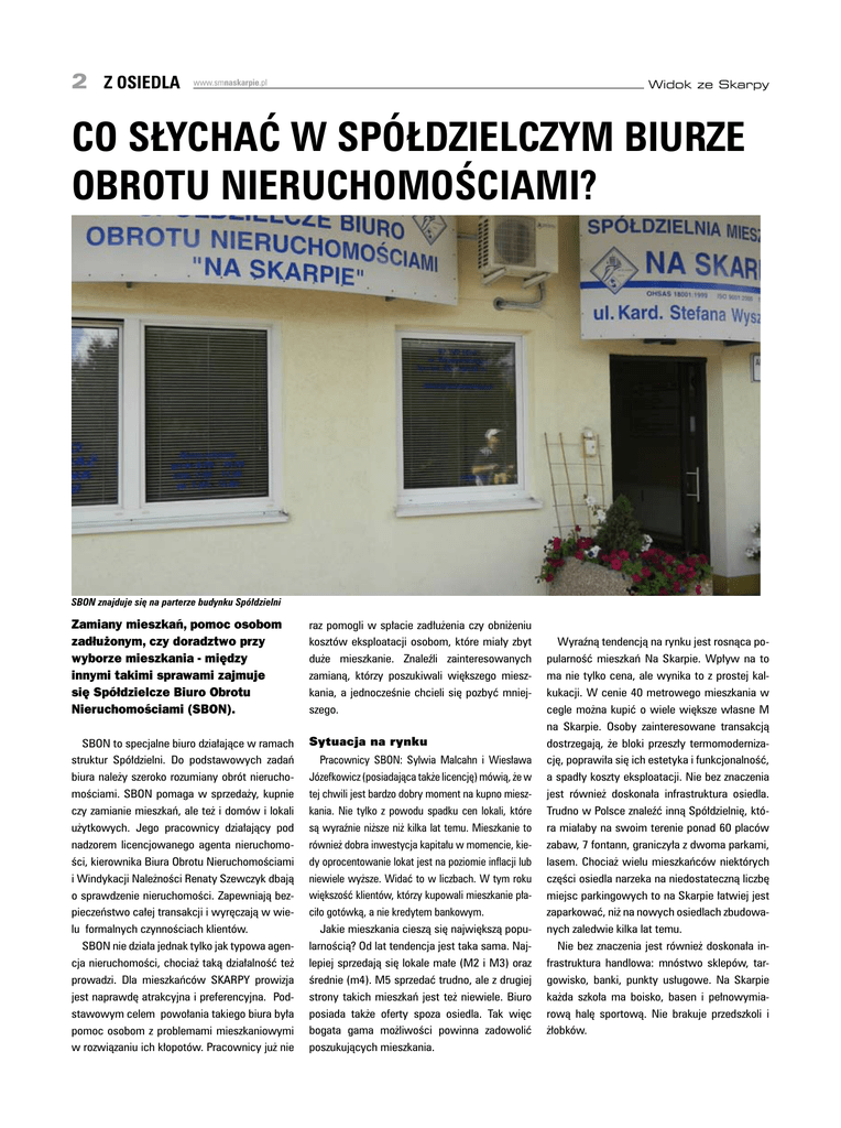 2 z osiedla www.smnaskarpie.pl Widok ze Skarpy Co słychać w Spółdzielczym Biurze Obrotu Nieruchomościami? SBON znajduje się na parterze budynku Spółdzielni Zamiany mieszkań, pomoc osobom zadłużonym, czy doradztwo przy wyborze mieszkania - między innymi takimi sprawami zajmuje się Spółdzielcze Biuro Obrotu Nieruchomościami (SBON). raz pomogli w spłacie zadłużenia czy obniżeniu kosztów eksploatacji osobom, które miały zbyt duże mieszkanie. Znaleźli zainteresowanych zamianą, którzy poszukiwali większego mieszkania, a jednocześnie chcieli się pozbyć mniejszego. SBON to specjalne biuro działające w ramach struktur Spółdzielni. Do podstawowych zadań biura należy szeroko rozumiany obrót nieruchomościami. SBON pomaga w sprzedaży, kupnie czy zamianie mieszkań, ale też i domów i lokali użytkowych. Jego pracownicy działający pod nadzorem licencjowanego agenta nieruchomości, kierownika Biura Obrotu Nieruchomościami i Windykacji Należności Renaty Szewczyk dbają o sprawdzenie nieruchomości. Zapewniają bezpieczeństwo całej transakcji i wyręczają w wielu formalnych czynnościach klientów. SBON nie działa jednak tylko jak typowa agencja nieruchomości, chociaż taką działalność też prowadzi. Dla mieszkańców SKARPY prowizja jest naprawdę atrakcyjna i preferencyjna. Podstawowym celem powołania takiego biura była pomoc osobom z problemami mieszkaniowymi w rozwiązaniu ich kłopotów. Pracownicy już nie Sytuacja na rynku Pracownicy SBON: Sylwia Malcahn i Wiesława Józefkowicz (posiadająca także licencję) mówią, że w tej chwili jest bardzo dobry moment na kupno mieszkania. Nie tylko z powodu spadku cen lokali, które są wyraźnie niższe niż kilka lat temu. Mieszkanie to również dobra inwestycja kapitału w momencie, kiedy oprocentowanie lokat jest na poziomie inflacji lub niewiele wyższe. Widać to w liczbach. W tym roku większość klientów, którzy kupowali mieszkanie płaciło gotówką, a nie kredytem bankowym. Jakie mieszkania cieszą się największą popularnością? Od lat tendencja jest taka sama. Najlepiej sprzedają się lokale małe (M2 i M3) oraz średnie (m4). M5 sprzedać trudno, ale z drugiej strony takich mieszkań jest też niewiele. Biuro posiada także oferty spoza osiedla. Tak więc bogata gama możliwości powinna zadowolić poszukujących mieszkania. Wyraźną tendencją na rynku jest rosnąca popularność mieszkań Na Skarpie. Wpływ na to ma nie tylko cena, ale wynika to z prostej kalkukacji. W cenie 40 metrowego mieszkania w cegle można kupić o wiele większe własne M na Skarpie. Osoby zainteresowane transakcją dostrzegają, że bloki przeszły termomodernizację, poprawiła się ich estetyka i funkcjonalność, a spadły koszty eksploatacji. Nie bez znaczenia jest również doskonała infrastruktura osiedla. Trudno w Polsce znaleźć inną Spółdzielnię, która miałaby na swoim terenie ponad 60 placów zabaw, 7 fontann, graniczyła z dwoma parkami, lasem. Chociaż wielu mieszkańców niektórych części osiedla narzeka na niedostateczną liczbę miejsc parkingowych to na Skarpie łatwiej jest zaparkować, niż na nowych osiedlach zbudowanych zaledwie kilka lat temu. Nie bez znaczenia jest również doskonała infrastruktura handlowa: mnóstwo sklepów, targowisko, banki, punkty usługowe. Na Skarpie każda szkoła ma boisko, basen i pełnowymiarową halę sportową. Nie brakuje przedszkoli i żłobków.