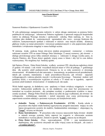 CHICAGO PUBLIC SCHOOLS 125 S. Clark Street, 5th Floor Chicago, Illinois 60603 Jean-Claude Brizard Chief Executive Officer Szanowni Rodzice i Opiekunowie Uczniów CPS: W celu pełniejszego zaangażowania rodziców w całym okręgu zamierzam za pomocą listów podobnych do niniejszego, informować Państwa regularnie o sprawach mających bezpośredni wpływ na edukację Waszego dziecka i społeczność szkolną. Mam nadzieję, że listy te, wysyłane jako dodatek do comiesięcznych zgromadzeń teIe- town , nowego biuletynu dla rodziców, kontynuowanych spotkań z rodzicami w mieście oraz innych działań, dostarczą głębszej wiedzy na temat priorytetów i inwestycji podejmowanych w celu poprawienia jakości instruktażu i zwiększenia osiągnięć w nauce każdego ucznia. W minioną środę podczas forum tele-town miałem przyjemność rozmawiać z wieloma rodzicami uczniów CPS na temat Pełnego Dnia Szkolnego. Z naszej rozmowy, jak również z dialogu prowdzonego przez kilka ostatnich miesięcy z rodzicami w okręgu wynika jasno, że chcecie Państwo, aby Wasze dzieci spędzały więcej czasu w klasie i aby był to czas dobrze wykorzystany. Nie mogliśmy być bardziej zgodni. Jak Państwo Wiecie, Pełen Dzień Szkolny wydłuży uczniom CPS dotychczas najkrótszy dzień (5 godzin i 45 minut) i rok wśród wszystkich dużych miast w USA do pełnego, 7- godzinnego dnia dla uczniów szkół podstawowych. Oznacza to, że co roku uczniowie ci otrzymają równowartość 40 dodatkowych dni nauczania z koncentracją na podstawowych przedmiotach, takich jak czytanie, matematyka i nauki przyrodniczo-fizyczne, jak również zajęciach wzbogacających z zakresu plastyki, muzyki i wychowania fizycznego . Natomiast siedem i pół godzinny dzień, z wcześniejszym wyjściem ze szkoły o 75 minut raz w tygodniu, zapewni uczniom szkół średnich równowartość 21 dodatkowych dni nauki. Wiele badań sugeruje, że dodatkowy czas spędzony w klasie zwiększy osiągnięcia w nauce uczniów. Jednocześnie podkreśla się, że ten dodatkowy czas musi być przeznaczony na instruktaż na wysokim poziomie , aby pożądane rezultaty w podniesieniu wyników w nauce zostały uzyskane. Dlatego Pełen Dzień nie odnosi się tylko do jego wydłużenia, ale również do wzbogacenia wykładanego materiału i metod nauczania oraz czasu poświęconego na zapewnienie uczniom edukacji o poziomie wyższym, niż kiedykolwiek mieli. Jednolite Normy z Podstawowych Przedmiotów (CCSS) – Każda szkoła w przyszłym roku będzie miała bardziej rygorystyczny program nauczania mający na celu lepsze przygotownie uczniów do studiów, fundamentalnie zmieniający i ulepszający to, ”czego” uczymy na lekcjach. Ramy Instruktażowe – W przyszłym roku wszyscy nauczyciele będą również działali w ramach nowego systemu, który zapewni im wsparcie w oferowaniu uczniom instruktażu o wyższej jakości. Zmieni to sposób, “w jaki” naucza się na lekcjach. Pełen Dzień Szkolny –Poza wprowadzeniem CCSS i ram instruktażowych dopilnujemy, aby uczniowie otrzymali nie tylko więcej czasu na lekcjach , ale czasu o „wysokiej jakości”. Educate, Inspire, Transform W celu dalszego zapewnienia jakości kształcenia we wszystkich szkołach okręg ustalił minimalne wytyczne co do liczby minut instruktażu ucznia w zakresie podstawowych przedmiotów takich jak czytanie, matematyka, nauk przyrodniczo-fizycznych oraz jak również zajęć wzbogacających z plastyki, muzyki i wychowania fizycznego w każdej klasie. Ponadto Pełen Dzień Szkolny w przyszłym roku zapewni wszystkim uczniom szkół podstawowych dodatkowy czas na posiłek i przerwę każdego dnia, aby mieli możliwość zrelaksowania się, zebrania sił i powrócenia do klasy w gotowości do nauki. Mamy również zamiar dać dyrektorom dużo więcej swobody i kontroli na szczeblu lokalnym w ustaleniu rozkładu dnia zajęć szkolnych. Ponieważ każda szkoła jest inna i ma unikalne potrzeby uczniów , staramy się ograniczyć rolę Kuratorium Oświaty w nadzorowaniu szkół i rozszerzyć ją dla dyrektorów, którzy wiedzą, jak najlepiej spełnić potrzeby uczniów, aby ci poprawili wyniki w nauce. Funkcja Kuratorium Oświaty polega coraz bardziej na wyposażaniu liderów szkół w środki i udzielanie wsparcia potrzebnego do zorganizowania dnia, który najlepiej spełni potrzeby ich uczniów. Dziękuję za oddanie i głębokie zaangażowanie we wspieraniu Twojego dziecka i naszych szkół. Z poważaniem, Jean-Claude Brizard Kurator Naczelny Chicagowskich Szkół Publicznych Educate, Inspire, Transform