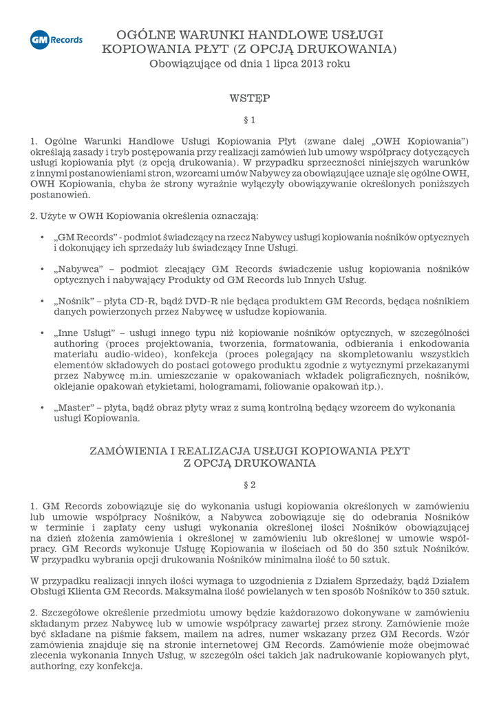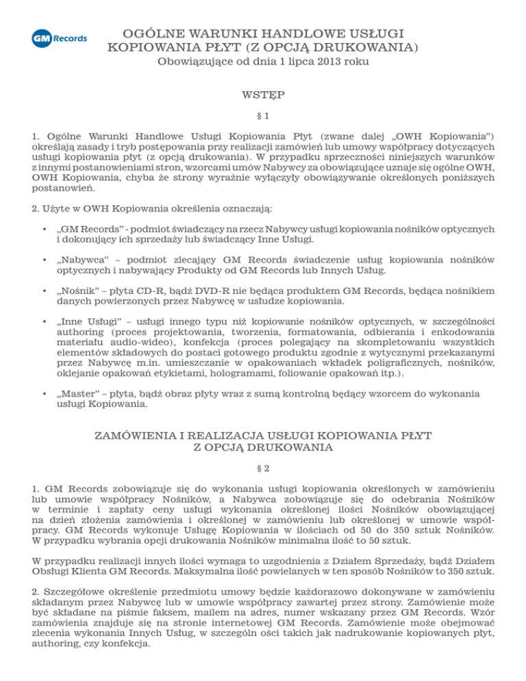 OGÓLNE WARUNKI HANDLOWE USŁUGI KOPIOWANIA PŁYT (Z OPCJĄ DRUKOWANIA) Obowiązujące od dnia 1 lipca 2013 roku WSTĘP §1 1. Ogólne Warunki Handlowe Usługi Kopiowania Płyt (zwane dalej „OWH Kopiowania”) określają zasady i tryb postępowania przy realizacji zamówień lub umowy współpracy dotyczących usługi kopiowania płyt (z opcją drukowania). W przypadku sprzeczności niniejszych warunków z innymi postanowieniami stron, wzorcami umów Nabywcy za obowiązujące uznaje się ogólne OWH, OWH Kopiowania, chyba że strony wyraźnie wyłączyły obowiązywanie określonych poniższych postanowień. 2. Użyte w OWH Kopiowania określenia oznaczają: • „GM Records” - podmiot świadczący na rzecz Nabywcy usługi kopiowania nośników optycznych i dokonujący ich sprzedaży lub świadczący Inne Usługi. • „Nabywca” – podmiot zlecający GM Records świadczenie usług kopiowania nośników optycznych i nabywający Produkty od GM Records lub Innych Usług. • „Nośnik” – płyta CD-R, bądź DVD-R nie będąca produktem GM Records, będąca nośnikiem danych powierzonych przez Nabywcę w usłudze kopiowania. • „Inne Usługi” – usługi innego typu niż kopiowanie nośników optycznych, w szczególności authoring (proces projektowania, tworzenia, formatowania, odbierania i enkodowania materiału audio-wideo), konfekcja (proces polegający na skompletowaniu wszystkich elementów składowych do postaci gotowego produktu zgodnie z wytycznymi przekazanymi przez Nabywcę m.in. umieszczanie w opakowaniach wkładek poligraficznych, nośników, oklejanie opakowań etykietami, hologramami, foliowanie opakowań itp.). • „Master” – płyta, bądź obraz płyty wraz z sumą kontrolną będący wzorcem do wykonania usługi Kopiowania. ZAMÓWIENIA I REALIZACJA USŁUGI KOPIOWANIA PŁYT Z OPCJĄ DRUKOWANIA §2 1. GM Records zobowiązuje się do wykonania usługi kopiowania określonych w zamówieniu lub umowie współpracy Nośników, a Nabywca zobowiązuje się do odebrania Nośników w terminie i zapłaty ceny usługi wykonania określonej ilości Nośników obowiązującej na dzień złożenia zamówienia i określonej w zamówieniu lub określonej w umowie współpracy. GM Records wykonuje Usługę Kopiowania w ilościach od 50 do 350 sztuk Nośników. W przypadku wybrania opcji drukowania Nośników minimalna ilość to 50 sztuk. W przypadku realizacji innych ilości wymaga to uzgodnienia z Działem Sprzedaży, bądź Działem Obsługi Klienta GM Records. Maksymalna ilość powielanych w ten sposób Nośników to 350 sztuk. 2. Szczegółowe określenie przedmiotu umowy będzie każdorazowo dokonywane w zamówieniu składanym przez Nabywcę lub w umowie współpracy zawartej przez strony. Zamówienie może być składane na piśmie faksem, mailem na adres, numer wskazany przez GM Records. Wzór zamówienia znajduje się na stronie internetowej GM Records. Zamówienie może obejmować zlecenia wykonania Innych Usług, w szczególn ości takich jak nadrukowanie kopiowanych płyt, authoring, czy konfekcja. 3. Realizacja Usługi Kopiowania wykonana jest na podstawie zamówienia składanego przez Nabywcę w ciągu max 10 dni roboczych po uprzednim sprawdzeniu materiału. Usługa Kopiowania polega na wykonaniu określonej liczy kopii płyt CD-R lub DVD-R opcjonalnie nadrukowanych. Umowa współpracy może regulować terminy realizacji zamówień w sposób odmienny. W przypadku wykonywania opakowań, bądź innych usług nie związanych z kopiowaniem i malowaniem płyt ustalany jest indywidualny termin realizacji zamówienia. Szczegóły realizacjiinnych usług określają Ogólne Warunki Handlowe. 4. W procesie realizacji Usługi kopiowania płyt uwzględnione jest tolerancja braków powstałych w trakcie realizacji zamówienia kopiowania/drukowania płyt. Tolerancja wynosi 10% wielkości zamówionego nakładu. Tzn. Klient zamawiając 100 sztuk może otrzymać sztuk 90. Związane jest to z błędami Nośników występującymi w procesach kopiowania i drukowania. Niezgodności ilościowe mieszczące się w granicach tolerancji nie będą podstawą do Reklamacji Usługi Kopiowania z opcjonalnym drukowaniem płyt. W przypadku nieakceptowania powyższego zalecamy zwielokrotnianie powierzonego materiału poprzez proceswytłoczenia płyt, będący pewnym i sprawdzonym sposobem realizacji zamówienia Nabywcy. 5. Opcjonalny proces drukowania płyt dotyczy powielenia dostarczonego przez Nabywcę, bądź wykonanego na jego zlecenie przez GM Records (dodatkowa usługa) wzoru umieszczanego na Nośnikach CD-R wyłącznie metodą Sitodruku, na nośnikach DVD-R metodami Sitodruku bądź Offsetu. W przypadku opcji drukowania płyt metodą sitodruku ilość kolorów wynosi 5 (pięć). W przypadku drukowania metodą offsetu (tylko DVD-R) dostępne są: - appla (biały podkład); - cmyk; Dodatkowo opcjonalnie (wymagające dopłaty) oferujemy: - kolor panton; - uszlachetnienie lakierem (błyszczący lub matowy). 6. Zduplikowane poprzez proces kopiowania nośniki są sprawdzane poprzez opcje Duplikatora (Weryfikacja i porównanie) w wartości 5% nakładu. Na życzenie Nabywcy, opcjonalnie, po uzgodnieniu między stronami istnieje możliwość weryfikowania/porównania większej liczby Nośników. W przypadku realizacji Usługi Kopiowania Płyt z opcją drukowania zalecamy test dostarczonego mastera przez Dział Kontroli Jakości GM Records. Usługa ta jest dodatkową, odpłatną metodą kontroli wymagającą ustalenia między stronami. W terminie 14 dni po realizacji zamówienia Usługi Kopiowania Płyt, dostarczone i przechowywane materiały niezbędne do procesów Duplikacji poprzez kopiowanie będą usuwane. 7. W przypadku duplikacji metodą kopiowania płyt CD-Audio brak możliwości umieszczania CD-Tekstu i kodów ISRC. MATERIAŁY DO PRODUKCJI §3 1. Nabywca jest zobowiązany do dostarczenia do siedziby GM Records Mastera i innych materiałów niezbędnych do wykonania Produktów
