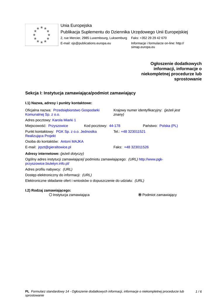 Unia Europejska Publikacja Suplementu do Dziennika Urzędowego Unii Europejskiej 2, rue Mercier, 2985 Luxembourg, Luksemburg Faks: +352 29 29 42 670 E-mail: [email protected] Informacje i formularze on-line: http:// simap.europa.eu Ogłoszenie dodatkowych informacji, informacje o niekompletnej procedurze lub sprostowanie Sekcja I: Instytucja zamawiająca/podmiot zamawiający I.1) Nazwa, adresy i punkty kontaktowe: Oficjalna nazwa: Przedsiębiorstwo Gospodarki Komunalnej Sp. z o.o. Krajowy numer identyfikacyjny: (jeżeli jest znany) _____ Adres pocztowy: Karola Miarki 1 Miejscowość: Przyszowice Kod pocztowy: 44-178 Punkt kontaktowy: PGK Sp. z o.o. Jednostka Realizująca Projekt Państwo: Polska (PL) Tel.: +48 323011521 Osoba do kontaktów: Antoni MAJKA E-mail: [email protected] Faks: +48 323011526 Adresy internetowe: (jeżeli dotyczy) Ogólny adres instytucji zamawiającej/ podmiotu zamawiającego: (URL) http://www.pgkprzyszowice.biuletyn.info.pl/ Adres profilu nabywcy: (URL) _____ Dostęp elektroniczny do informacji: (URL) _____ Elektroniczne składanie ofert i wniosków o dopuszczenie do udziału: (URL) _____ I.2) Rodzaj zamawiającego: Instytucja zamawiająca Podmiot zamawiający PL Formularz standardowy 14 - Ogłoszenie dodatkowych informacji, informacje o niekompletnej procedurze lub sprostowanie 1/6 Sekcja II: Przedmiot zamówienia II.1.1) Nazwa nadana zamówieniu: Dostawy urządzeń i sprzętu dla zabezpieczenia eksploatacji oczyszczalni ścieków oraz sieci kanalizacyjnej w ramach realizacji projektu nr POIS.01.01.00-00-56/08-00 pt.: Kanalizacja sanitarna wraz z oczyszczalnią ścieków w Gminie Gierałtowice II.1.2) Krótki opis zamówienia lub zakupu: (podano w pierwotnym ogłoszeniu) Przedmiotem zamówienia jest dostawa urządzeń i sprzętu dla zabezpieczenia eksploatacji oczyszczalni ścieków oraz sieci kanalizacyjnej w ramach realizacji projektu pt.: Kanalizacja sanitarna wraz z oczyszczalnią ścieków w Gminie Gierałtowice współfinansowanego przez Unię Europejską ze środków Funduszu Spójności w ramach Programu Operacyjnego Infrastruktura i Środowisko. Zamówienie obejmuje następujące części w formie dostaw: Część 1 Samochód typu WUKO ssąco tłoczący Część 2 Samochód dostawczy Część 3 Ciągnik rolniczy wraz z pługiem odśnieżającym Część 4 Agregat prądotwórczy trójfazowy z stabilizatorem 64 kW Agregat prądotwórczy trójfazowy z stabilizatorem 32 kW Część 5 Detektor gazów palnych, Wentylator nadmuchowy, Mechaniczne korki kanalizacyjne, pakery, Generator dymu, Pompa szlamowa z osprzętem Część 6 Laboratorium oczyszczalni ścieków Część 7 Stanowiska komputerowe z siecią teletechniczną biura oczyszczalni ścieków Część 8 Meble biurowe pomieszczeń obsługi oczyszczalni ścieków, Wyposażenie socjalne pomieszczeń obsługi oczyszczalni ścieków, Stół warsztatowy 2-2,5m Część 9 System dozoru wizyjnego oczyszczalni ścieków Przedmiot zamówienia objęty musi być gwarancją jakości i rękojmią o długości nie mniej niż ilość miesięcy przypisana zgodnie z poniższym zestawieniem. Wykonawca może zadeklarować dodatkowy okres gwarancji – co będzie dodatkowo punktowane, jednak zamawiający zastrzega, że punktacji poddana zostanie jedynie za dodatkowy okres od wymaganego okresu gwarancji maksymalnie do 4lat. Część 1 Samochód typu WUKO ssąco tłoczący-Nie mniej niż 24 m-ce Część 2 Samochód dostawczy- Nie mniej niż min 36 m-cy na lakier, min 24 m-ce gwarancja mechaniczna Część 3 Ciągnik rolniczy wraz z pługiem odśnieżającym-Nie mniej niż 24 m-ce Część 4 Agregat prądotwórczy trójfazowy z stabilizatorem 64k W, Agregat prądotwórczy trójfazowy z stabilizatorem 32 kW-Nie mniej niż 24 m-ce Część 5 Detektor gazów palnych, Wentylator nadmuchowy, Mechaniczne korki kanalizacyjne, pakery, Generator dymu, Pompa szlamowa z osprzętem-Nie mniej niż 12 m-cy Część 6 Laboratorium oczyszczalni ścieków-Nie mniej niż 24 m-ce Część 7 Stanowiska komputerowe z siecią teletechniczną biura oczyszczalni ścieków-Nie mniej niż 24 m-ce Część 8 Meble biurowe pomieszczeń obsługi oczyszczalni ścieków, Wyposażenie socjalne pomieszczeń obsługi oczyszczalni ścieków, Stół warsztatowy 2-2,5m-Nie mniej niż 24 m-ce Cześć 9 System dozoru wizyjnego oczyszczalni ścieków-Nie mniej niż 24m-ce II.1.3) Wspólny Słownik Zamówień (CPV) Główny przedmiot Dodatkowe przedmioty Słownik główny 34144500 34130000 16700000 43313000 Słownik uzupełniający (jeżeli dotyczy) PL Formularz standardowy 14 - Ogłoszenie dodatkowych informacji, informacje o niekompletnej procedurze lub sprostowanie 2/6 Słownik główny 31122000 35100000 42520000 42900000 39150000 42122000 38000000 30200000 32400000 35120000 39130000 39100000 30232100 48820000 Słownik uzupełniający (jeżeli dotyczy) PL Formularz standardowy 14 - Ogłoszenie dodatkowych informacji, informacje o niekompletnej procedurze lub sprostowanie 3/6 Sekcja IV: Procedura IV.1)Rodzaj procedury (podano w pierwotnym ogłoszeniu) Otwarta Ograniczona Ograniczona przyspieszona Negocjacyjna Negocjacyjna przyspieszona Dialog konkurencyjny Negocjacyjna z uprzednim ogłoszeniem Negocjacyjna bez uprzedniego ogłoszenia Negocjacyjna z publikacją ogłoszenia o zamówieniu Negocjacyjna bez publikacji ogłoszenia o zamówieniu Udzielenie zamówienia bez uprzedniej publikacji ogłoszenia o zamówieniu w Dzienniku Urzędowym Unii Europejskiej IV.2)Informacje administracyjne IV.2.1)Numer referencyjny: (podano w pierwotnym ogłoszeniu) JRP/ZP-PNP/D/1/2015 IV.2.2)Dane referencyjne ogłoszenia w przypadku ogłoszeń przesłanych drogą elektroniczną: Pierwotne ogłoszenie przesłane przez eNotices TED eSender Login: ENOTICES_PGK_Przyszowice Dane referencyjne ogłoszenia: 2015-033741 rok i numer dokumentu IV.2.3)Ogłoszenie, którego dotyczy niniejsza publikacja: Numer ogłoszenia w Dz.U.: 2015/S 052-091535 z dnia: 14/03/2015 (dd/mm/rrrr) IV.2.4)Data wysłan