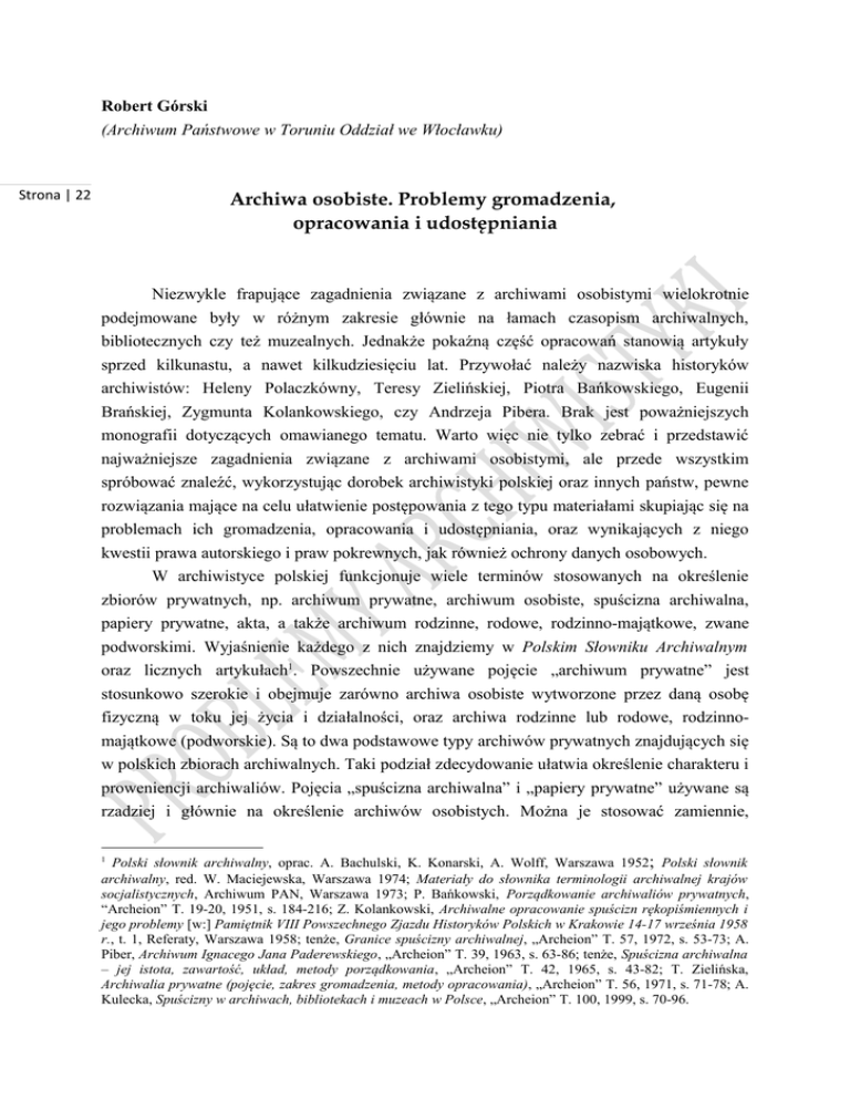 Robert Górski (Archiwum Państwowe w Toruniu Oddział we Włocławku) Strona Strona | 22 | Archiwa osobiste. Problemy gromadzenia, opracowania i udostępniania Niezwykle frapujące zagadnienia związane z archiwami osobistymi wielokrotnie podejmowane były w różnym zakresie głównie na łamach czasopism archiwalnych, bibliotecznych czy też muzealnych. Jednakże pokaźną część opracowań stanowią artykuły sprzed kilkunastu, a nawet kilkudziesięciu lat. Przywołać należy nazwiska historyków archiwistów: Heleny Polaczkówny, Teresy Zielińskiej, Piotra Bańkowskiego, Eugenii Brańskiej, Zygmunta Kolankowskiego, czy Andrzeja Pibera. Brak jest poważniejszych monografii dotyczących omawianego tematu. Warto więc nie tylko zebrać i przedstawić najważniejsze zagadnienia związane z archiwami osobistymi, ale przede wszystkim spróbować znaleźć, wykorzystując dorobek archiwistyki polskiej oraz innych państw, pewne rozwiązania mające na celu ułatwienie postępowania z tego typu materiałami skupiając się na problemach ich gromadzenia, opracowania i udostępniania, oraz wynikających z niego kwestii prawa autorskiego i praw pokrewnych, jak również ochrony danych osobowych. W archiwistyce polskiej funkcjonuje wiele terminów stosowanych na określenie zbiorów prywatnych, np. archiwum prywatne, archiwum osobiste, spuścizna archiwalna, papiery prywatne, akta, a także archiwum rodzinne, rodowe, rodzinno-majątkowe, zwane podworskimi. Wyjaśnienie każdego z nich znajdziemy w Polskim Słowniku Archiwalnym oraz licznych artykułach1. Powszechnie używane pojęcie „archiwum prywatne” jest stosunkowo szerokie i obejmuje zarówno archiwa osobiste wytworzone przez daną osobę fizyczną w toku jej życia i działalności, oraz archiwa rodzinne lub rodowe, rodzinnomajątkowe (podworskie). Są to dwa podstawowe typy archiwów prywatnych znajdujących się w polskich zbiorach archiwalnych. Taki podział zdecydowanie ułatwia określenie charakteru i proweniencji archiwaliów. Pojęcia „spuścizna archiwalna” i „papiery prywatne” używane są rzadziej i głównie na określenie archiwów osobistych. Można je stosować zamiennie, Polski słownik archiwalny, oprac. A. Bachulski, K. Konarski, A. Wolff, Warszawa 1952; Polski słownik archiwalny, red. W. Maciejewska, Warszawa 1974; Materiały do słownika terminologii archiwalnej krajów socjalistycznych, Archiwum PAN, Warszawa 1973; P. Bańkowski, Porządkowanie archiwaliów prywatnych, “Archeion” T. 19-20, 1951, s. 184-216; Z. Kolankowski, Archiwalne opracowanie spuścizn rękopiśmiennych i jego problemy [w:] Pamiętnik VIII Powszechnego Zjazdu Historyków Polskich w Krakowie 14-17 września 1958 r., t. 1, Referaty, Warszawa 1958; tenże, Granice spuścizny archiwalnej, „Archeion” T. 57, 1972, s. 53-73; A. Piber, Archiwum Ignacego Jana Paderewskiego, „Archeion” T. 39, 1963, s. 63-86; tenże, Spuścizna archiwalna – jej istota, zawartość, układ, metody porządkowania, „Archeion” T. 42, 1965, s. 43-82; T. Zielińska, Archiwalia prywatne (pojęcie, zakres gromadzenia, metody opracowania), „Archeion” T. 56, 1971, s. 71-78; A. Kulecka, Spuścizny w archiwach, bibliotekach i muzeach w Polsce, „Archeion” T. 100, 1999, s. 70-96. 1 aczkolwiek termin „archiwum osobiste” jest najbardziej trafne. W praktyce kwestia stosowania powyższych określeń przedstawia się podobnie. W nazwach zespołów archiwalnych proweniencji prywatnej najczęściej spotykamy konstrukcje „archiwum danej osoby, rodziny, rodu” lub „akta”, zdecydowanie rzadziej „papiery” i „materiały”. Przy okazji Strona Strona | 23 | warto zadać sobie pytanie czy suma spuścizn osób ze sobą spokrewnionych daje nam archiwum rodzinne? Takie zespoły można znaleźć w zbiorach archiwów państwowych, wyłączając z tej grupy archiwa podworskie (rodzinno-majątkowe), gdzie czynnikiem aktotwórczym był w dużej mierze majątek. Pierwszym problemem, który warto poruszyć, jest kwestia gromadzenia archiwów osobistych oraz ich status prawny. Jest to o tyle istotne, gdyż mamy do czynienia z pełną swobodą w podejmowaniu decyzji dotyczących miejsca archiwizacji, zmiennością lub brakiem jakichkolwiek uregulowań w zakresie gromadzenia, przechowywania i zabezpieczania tego typu materiałów. Spuścizny, stanowiące specyficzną formę zespołu archiwalnego, nie podlegają zasadzie pertynencji terytorialnej mówiącej o związku zespołów archiwalnych z terytorium, na którym zostały wytworzone. Stanowią własność prywatną twórców, którzy kierując się różnymi przesłankami mogą swobodnie przekazywać swoje papiery jakimkolwiek instytucjom czy osobom w formie daru, depozytu, w drodze zapisu testamentowego, lub sprzedaży. W takim przypadku pojawia się często problem niekonsekwencji, bądź też braku zainteresowania i opieki ze strony potencjalnych spadkobierców. W wyniku tego archiwa osobiste mogą ulegać rozproszeniu znajdując swoje miejsce nie tylko w archiwach (państwowych, uniwersyteckich), ale także różnych instytucjach kulturalno-naukowych, charytatywnych, bibliotekach, muzeach w Polsce i zagranicą. Zdarzają się również sytuacje, gdy pewne instytucje pozyskują archiwalia od rodziny wiedząc, że część materiałów przechowywana jest już gdzie indziej. W takim przypadku warto podjąć próbę scalenia rozproszonych części spuścizn. Nawet, jeśli nie fizycznego, co zwykle możliwe nie jest, to poprzez sporządzenie odpowiedniego opisu informacyjnego, najpierw na poziomie zespołu, później na niższych. Należałoby jednak zwrócić uwagę na ewentualną możliwość zastosowania wspomnianej zasady pertynencji terytorialnej w stosunku do archiwów osobistych. Raczej nie w formie nakazu, ale perswazji, archiwów przy tym pertraktacji zmierzających do scalenia rozproszonych części spuścizn. Pomocna powinna być również popularyzacja zbiorów prywatnych stanowiących część