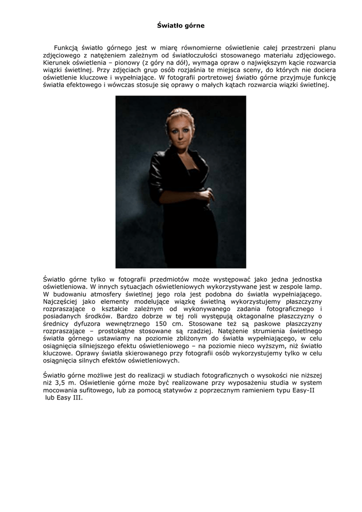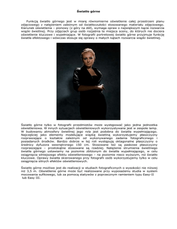 Światło górne Funkcją światło górnego jest w miarę równomierne oświetlenie całej przestrzeni planu zdjęciowego z natężeniem zależnym od światłoczułości stosowanego materiału zdjęciowego. Kierunek oświetlenia – pionowy (z góry na dół), wymaga opraw o największym kącie rozwarcia wiązki świetlnej. Przy zdjęciach grup osób rozjaśnia te miejsca sceny, do których nie dociera oświetlenie kluczowe i wypełniające. W fotografii portretowej światło górne przyjmuje funkcję światła efektowego i wówczas stosuje się oprawy o małych kątach rozwarcia wiązki świetlnej. Światło górne tylko w fotografii przedmiotów może występować jako jedna jednostka oświetleniowa. W innych sytuacjach oświetleniowych wykorzystywane jest w zespole lamp. W budowaniu atmosfery świetlnej jego rola jest podobna do światła wypełniającego. Najczęściej jako elementy modelujące wiązkę świetlną wykorzystujemy płaszczyzny rozpraszające o kształcie zależnym od wykonywanego zadania fotograficznego i posiadanych środków. Bardzo dobrze w tej roli występują oktagonalne płaszczyzny o średnicy dyfuzora wewnętrznego 150 cm. Stosowane też są paskowe płaszczyzny rozpraszające – prostokątne stosowane są rzadziej. Natężenie strumienia świetlnego światła górnego ustawiamy na poziomie zbliżonym do światła wypełniającego, w celu osiągnięcia silniejszego efektu oświetleniowego – na poziomie nieco wyższym, niż światło kluczowe. Oprawy światła skierowanego przy fotografii osób wykorzystujemy tylko w celu osiągnięcia silnych efektów oświetleniowych. Światło górne możliwe jest do realizacji w studiach fotograficznych o wysokości nie niższej niż 3,5 m. Oświetlenie górne może być realizowane przy wyposażeniu studia w system mocowania sufitowego, lub za pomocą statywów z poprzecznym ramieniem typu Easy-II lub Easy III. W systemie oświetleniowym Fomei jako światło górne zalecana jest lampa Boomlight o energii błysku 600 lub 1200 Ws. Rozdzielenie w tym typie części oświetleniowej i zasilającej powoduje poprawę szybkości, pewności i komfortu pracy. Część oświetleniowa mocowana u góry, ma za zadanie równomiernie oświetlanie planu zdjęciowego; a sterowanie poziomem energii błysku, lub innymi funkcjami odbywa się z pulpitu sterującego, znajdującego się na obudowie części zasilającej. Mocowana jest ona na kolumnie statywu, na którym umieszczona jest część oświetlająca. W dzisiejszych przykładach zdjęciowych rozpatrzymy zmianę sytuacji oświetleniowej, oraz efekty, jakie daje światło górne w zespole trzech lamp. Jako światło kluczowe wykorzystaliśmy lampę Digital 1200 plus z odbłyśnikiem 21 cm z plastrem miodu 10º, ustawioną w pozycji 40º/30º, z takim natężeniem strumienia świetlnego, aby uzyskać naświetlenie odpowiadające przysłonie f-11,5. Jako światło wypełniające została wykorzystana lampa Digitalis 400 z paskową płaszczyzną rozpraszającą Stripbox 40z120 cm w pozycji 240º/0º z poziomem naświetlenia odpowiadającym przysłonie 8,6. Zdjęcia wykonano w kilku seriach, bez zmiany elementów formujących i modelujących wiązkę świetlną w oprawach światła kluczowego i wypełniającego. W oprawie światła górnego kolejno wykorzystane zostały: płaszczyzna rozpraszająca Stripbox 40x120 cm z dyfuzorem wewnętrznym (naświetlenie na poziomie światła wypełniającego, odpowiadające przysłonie f-8,6), następnie płaszczyzna rozpraszająca Octabox 150 cm (f8,4), oraz tubus (f-8,7) oraz trochę niezgodnie z jego właściwym przeznaczeniem, ale ze względu na sprawność świetlną i charakter oświetlenia, odbłyśnik do oświetlenia tła, Backgronud (f-8,7). Układ oświetlenia. Oznaczenia: 1. Światło kluczowe: lampa Digital 1200 plus z odbłyśnikiem 21 cm z plastrem miodu 10º, (f-11,5), 2. Światło wypełniające: lampa Digitalis 400 z paskową płaszczyzną rozpraszającą Stripbox 40x120 cm (f-8,6). 3. Światło górne: lampa Digital 600 plus z paskową płaszczyzną rozpraszającą Stripbox 40x120 cm (f-8,6). 60 Zdjęcie wykonano zespołem trzech świateł. Jako światło górne została wykorzystana paskowa płaszczyzna rozpraszająca Stripbox 40x120 cm z dyfuzorem wewnętrznym. a65 b66 Kontrast obrazu zależy od poziomu oświetlenia planu zdjęciowego światłem wypełniającym. Zdjęcie „a” wykonano przy wyłączonym świetle wypełniającym, „b” – przy jego obecności z poziomem oświetlenia dwa razy niższym, niż poziom światła kluczowego. Obecność światła wypełniającego, poza zmianą kontrastu powoduje, że otrzymujemy także jaśniejszy walor włosów, dzięki sumowaniu strumieni świetlnych wszystkich trzech świateł. 69 68 Zmiana charakteru oświetleniu. a. Plan zdjęciowy oświetlony tylko wąską wiązką skierowanego światła kluczowego, formowanego przez odbłyśnik z plastrem miodu. Bardzo wyraźny światłocień oświetlanej postaci, oraz głęboki cień, rzutowany przez postać na tło, zmiana jasności tła, w zależności od ilości docierającego światła kluczowego, ton tła zmienia się od jego naturalnego, w miejscach oświetlonych światłem kluczowym, niemal do głębokiej czerni, w miejscu, gdzie pada cień postaci. b. Plan zdjęciowy oświetlony światłem kluczowym i górnym. powoduje zmniejszenie kontrastu na twarzy Marty, tło uzyskuje bardziej równomierny walor, głębokość cienia, rzutowanego na tło jest dużo mniejsza. C. Plan zdjęciowy oświetlony zespołem lamp, uzyskujemy zmianę kontrastu fotografowanej sceny oraz dalsze rozjaśnienie tła i zmniejszenie głębokości cieni. Dramatyczny charakter zdjęcia „a” stopniowo łagodnieje (zdjęcie „b”), aby przybrać bardzo spokojny charakter w zdjęciu „c”. 6 71 74 Ta seria zdjęć została wykorzystana z różnymi elementami formującymi wiązkę świetlną światła górnego. Zdjęcie „a”, lampa Fomei Digital 600 Plus z paskową