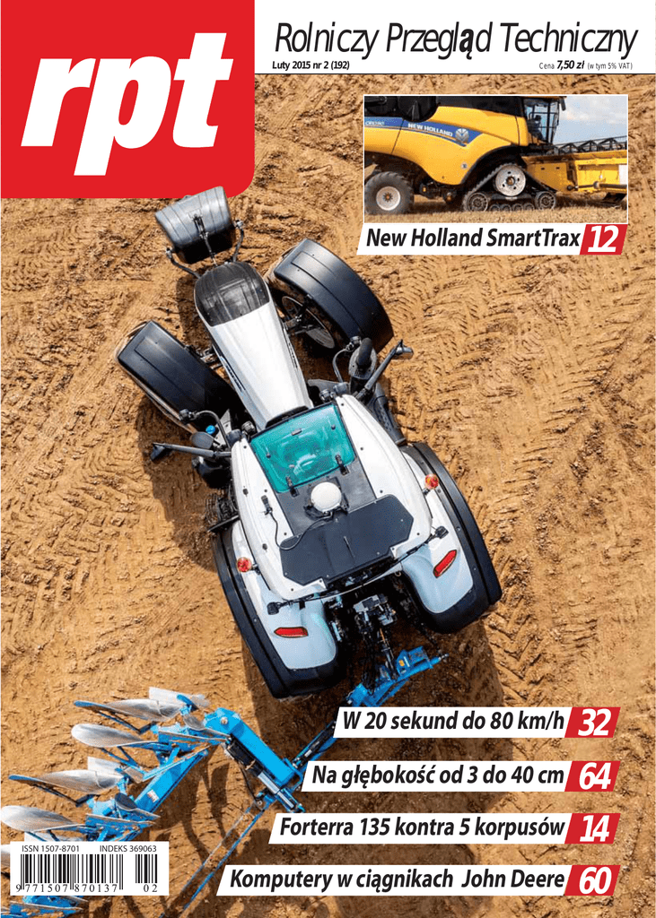 Rolniczy Przeglðd Techniczny Luty 2015 nr 2 (192) Cena 7,50 zã (w tym 5% VAT) New Holland SmartTrax 12 W 20 sekund do 80 km/h Na głębokość od 3 do 40 cm Forterra 135 kontra 5 korpusów ISSN 1507-8701 INDEKS 369063 Komputery w ciągnikach John Deere 32 64 14 601 Rolniczy Przegl¹d Techniczny luty 2015 nr 2 (192) Landini 6L zastępuje Landpowera www.landini.info.pl Na naszym rynku jest już dostępna nowa gama ciągników marki Landini. Traktory serii 6L mają zastąpić popularną rodzinę Landpower. W ofercie znajdują się trzy modele. Napędzane są czterocylindrowymi silnikami o pojemności skokowej 4,5 l i mocach: 143, 163, 176 KM. Jednostki dzięki systemowi redukcji tlenków azotu SCR spełniają normę czystości spalin Euro IIIB. Zbiornik paliwa dla wszystkich modeli ma pojemność 270 l, zaś zbiornik na płyn AdBlue 38 l. Seria 6L jest wyposażona w zsynchronizowaną mechaniczną przekładnię 18/18 z rewersorem sterowanym mechanicznie. W opcji możliwe jest zastosowanie skrzyni z biegami pełzającymi z prędkością jazdy wynoszącą od 410 m/h. Układ hydrauliczny o całkowitym wydatku 125 l/min można wyposażyć w maksymalnie pięć par szybkozłączy. Ramiona sterowanego przez układ EHR tylnego podnośnika mają udźwig do 8,4 t. W opcji dostępne są przednie WOM i TUZ o udźwigu do 3,5 t. Väderstad Swift 640 www.vaderstad.com/pl Szwedzki producent wprowadza nowe kultywatory ścierniskowe Swift o szerokości roboczej 6,4 m. Swift 640 będzie lepiej wpasowywał się w systemy uprawowe 6- i 12-metrowe. Agregat ten jest przeznaczony do pracy na ściernisku do głębokości 20 cm. Sprężyste zęby tego narzędzia podczas pracy bardzo silnie wibrują, dochodząc do częstotliwości 100 drgań na sekundę. Ta cecha pozwala na pracę także w trudnych warunkach, na glebach ciężkich. Regulacja głębokości kultywatora zależna jest od dwóch zestawów podwójnych kół skrętnych, umieszczonych z przodu po bokach ramy. Są one ustawiane hydraulicznie. Z kolei do transportu używane są umieszczone w centralnej części agregatu koła nośne. W standardowym wyposażeniu Swifta znajduje się dyszel z zaczepem oczkowym. W razie potrzeby ponownej konsolidacji gleby kultywator można doposażyć w wał EasyRunner. Nowa redlica TurboDisc www.horsch2.com/pl Horsch wprowadza do swoich siewników zbożowych nowe redlice typu TurboDisc. Ich praca ma spowodować efekt bardziej równomiernego kiełkowania i wyrównanych wschodów. TurboDisc to podwójna redlica talerzowa wykorzystywana w siewnikach marki Horsch takich jak: Pronto, Express i Focus. Teraz będzie montowana w nich jej nowa wersja. Sednem rozwiązania zawartego w nowej redlicy jest nowa, specjalnie zakrzywiona rura, którą wędrują nasiona kierowane do gleby. Ma ona tak dobrany kąt, aby zredukować prędkość opadania nasion. Ponadto jej kształt pozwala rozłożyć równomiernie siły działające na redlicę podczas pracy, co zwiększa jej odporność na uderzenia oraz zmniejsza jej zużycie. Producent zmienił również kółka dociskowe pracujące za redlicami. Są one teraz gładsze, delikatniejsze oraz mają większą średnicę, co ma zapobiegać przyleganiu gleby. Ponadto zamontowano przy nich nowe skrobaki mające prostszy układ regulacyjny niż w wersji poprzedniej. W SKRÓCIE Pronar wygrał w niemieckim sądzie Podlaski producent maszyn i urządzeń rolniczych Pronar Narew wygrał proces przed niemieckim sądem z tamtejszą firmą Doppstadt. Pronar został oskarżony na początku 2014 r. o wyprodukowanie kopii maszyn niemieckiej firmy, służących m.in. do przesiewania odpadów. Doppstadt na początku maja 2014 r. złożył w sądzie w Monachium wniosek o wydanie zakazu dla polskiego producenta dotyczącego sprzedaży tych mobilnych urządzeń oraz ich reklamy na terenie Niemiec. Tamtejszy sąd bez wysłuchania drugiej strony (czyli Pronaru) od razu wydał postanowienie zakazujące Pronarowi wprowadzania do obrotu maszyn MPB 18.47 i MPB 20.55 na terenie Niemiec. Obecne w tym kraju maszyny miały niebawem wziąć udział w prestiżowych targach. Skończyło się tym, że przedstawiciele niemieckiej firmy podczas targów pojawili się na stoisku polskiego producenta z sądowym pismem i zgodnie z orzeczeniem sądu maszyny zostały zasłonięte. Sergiusz Martyniuk, prezes Rady Właścicieli Pronaru, nie zamierzał tak tej sprawy pozostawić. Przez pochopną decyzję sądu Pronar nie mógł przecież zaprezentować swoich maszyn na targach. Polska firma wynajęła niemiecką kancelarię, która przygotowała skargę na orzeczenie monachijskiego sądu. W efekcie postępowania prawnicy stwierdzili, iż Pronar nie dopuścił się żad- nego naśladownictwa, a co więcej, zastosował rozwiązania innowacyjne oraz bardziej funkcjonalne, co zupełnie wyklucza argument kopiowania rozwiązań innej firmy. Pod koniec listopada 2014 r. sąd w Monachium wydał postanowienie w całości oddalające zarzuty niemieckiego producenta przesiewaczy. W wyniku tego Pronarowi przywrócono wcześniejsze prawo do obrotu swoimi maszynami na terenie Niemiec, a Doppstadt został w całości obciążony kosztami postępowania. tb Z gwarancją 4000 motogodzin Od 2015 r. ciągniki Kubota serii M o mocach od 64 do 140 KM będą otrzymywały gwarancję wynoszącą trzy lata lub 4000 mth. Dotychczas obejmowała ona traktory, które nie przepracowały 3000 mth. Przedłużona do 4000 mth gwarancja dotyczy ciągników rolniczych Kubota: M6060, M7060, M7040N, M8540N, M8560, M9960, M110GX, M135GX i M135GXS. Warunkiem jej uzyskania jest zakup traktora po 1 stycznia 2015 r. Jak informuje Kubota, uzyskanie przedłużonej gwarancji nie wiąże się z żadnymi dodatkowymi opłatami. Jedynym obowiązkiem, jaki spoczywa na użytkowniku, jest regularne serwisowanie ciągnika według zaleceń producenta i stosowanie oryginalnych środków smarnych, dostępnych u autoryzowanych dilerów marki Kubota. – Jesteśmy przekonani, że nasze maszyny są ta