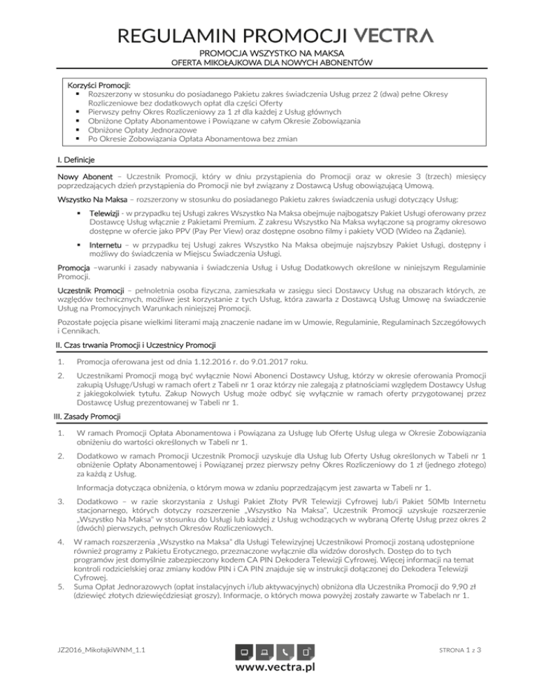 PROMOCJA WSZYSTKO NA MAKSA OFERTA MIKOŁAJKOWA DLA NOWYCH ABONENTÓW Korzyści Promocji: Rozszerzony w stosunku do posiadanego Pakietu zakres świadczenia Usług przez 2 (dwa) pełne Okresy Rozliczeniowe bez dodatkowych opłat dla części Oferty Pierwszy pełny Okres Rozliczeniowy za 1 zł dla każdej z Usług głównych Obniżone Opłaty Abonamentowe i Powiązane w całym Okresie Zobowiązania Obniżone Opłaty Jednorazowe Po Okresie Zobowiązania Opłata Abonamentowa bez zmian I. Definicje Nowy Abonent – Uczestnik Promocji, który w dniu przystąpienia do Promocji oraz w okresie 3 (trzech) miesięcy poprzedzających dzień przystąpienia do Promocji nie był związany z Dostawcą Usług obowiązującą Umową. Wszystko Na Maksa – rozszerzony w stosunku do posiadanego Pakietu zakres świadczenia usługi dotyczący Usług: Telewizji - w przypadku tej Usługi zakres Wszystko Na Maksa obejmuje najbogatszy Pakiet Usługi oferowany przez Dostawcę Usług włącznie z Pakietami Premium. Z zakresu Wszystko Na Maksa wyłączone są programy okresowo dostępne w ofercie jako PPV (Pay Per View) oraz dostępne osobno filmy i pakiety VOD (Wideo na Żądanie). Internetu – w przypadku tej Usługi zakres Wszystko Na Maksa obejmuje najszybszy Pakiet Usługi, dostępny i możliwy do świadczenia w Miejscu Świadczenia Usługi. Promocja –warunki i zasady nabywania i świadczenia Usług i Usług Dodatkowych określone w niniejszym Regulaminie Promocji. Uczestnik Promocji – pełnoletnia osoba fizyczna, zamieszkała w zasięgu sieci Dostawcy Usług na obszarach których, ze względów technicznych, możliwe jest korzystanie z tych Usług, która zawarła z Dostawcą Usług Umowę na świadczenie Usług na Promocyjnych Warunkach niniejszej Promocji. Pozostałe pojęcia pisane wielkimi literami mają znaczenie nadane im w Umowie, Regulaminie, Regulaminach Szczegółowych i Cennikach. II. Czas trwania Promocji i Uczestnicy Promocji 1. Promocja oferowana jest od dnia 1.12.2016 r. do 9.01.2017 roku. 2. Uczestnikami Promocji mogą być wyłącznie Nowi Abonenci Dostawcy Usług, którzy w okresie oferowania Promocji zakupią Usługę/Usługi w ramach ofert z Tabeli nr 1 oraz którzy nie zalegają z płatnościami względem Dostawcy Usług z jakiegokolwiek tytułu. Zakup Nowych Usług może odbyć się wyłącznie w ramach oferty przygotowanej przez Dostawcę Usług prezentowanej w Tabeli nr 1. III. Zasady Promocji 1. W ramach Promocji Opłata Abonamentowa i Powiązana za Usługę lub Ofertę Usług ulega w Okresie Zobowiązania obniżeniu do wartości określonych w Tabeli nr 1. 2. Dodatkowo w ramach Promocji Uczestnik Promocji uzyskuje dla Usług lub Oferty Usług określonych w Tabeli nr 1 obniżenie Opłaty Abonamentowej i Powiązanej przez pierwszy pełny Okres Rozliczeniowy do 1 zł (jednego złotego) za każdą z Usług. Informacja dotycząca obniżenia, o którym mowa w zdaniu poprzedzającym jest zawarta w Tabeli nr 1. 3. 4. 5. Dodatkowo – w razie skorzystania z Usługi Pakiet Złoty PVR Telewizji Cyfrowej lub/i Pakiet 50Mb Internetu stacjonarnego, których dotyczy rozszerzenie „Wszystko Na Maksa”, Uczestnik Promocji uzyskuje rozszerzenie „Wszystko Na Maksa” w stosunku do Usługi lub każdej z Usług wchodzących w wybraną Ofertę Usług przez okres 2 (dwóch) pierwszych, pełnych Okresów Rozliczeniowych. W ramach rozszerzenia „Wszystko na Maksa” dla Usługi Telewizyjnej Uczestnikowi Promocji zostaną udostępnione również programy z Pakietu Erotycznego, przeznaczone wyłącznie dla widzów dorosłych. Dostęp do to tych programów jest domyślnie zabezpieczony kodem CA PIN Dekodera Telewizji Cyfrowej. Więcej informacji na temat kontroli rodzicielskiej oraz zmiany kodów PIN i CA PIN znajduje się w instrukcji dołączonej do Dekodera Telewizji Cyfrowej. Suma Opłat Jednorazowych (opłat instalacyjnych i/lub aktywacyjnych) obniżona dla Uczestnika Promocji do 9,90 zł (dziewięć złotych dziewięćdziesiąt groszy). Informacje, o których mowa powyżej zostały zawarte w Tabelach nr 1. JZ2016_MikołajkiWNM_1.1 STRONA 1 z 3 PROMOCJA WSZYSTKO NA MAKSA OFERTA MIKOŁAJKOWA DLA NOWYCH ABONENTÓW 6. Wysokość Opłat Abonamentowych i Powiązanych (w przypadku Usługi Telewizji), wysokość Opłat Jednorazowych (opłat instalacyjnych i/lub aktywacyjnych), wartość udzielonej Ulgi, Okres Zobowiązania, wysokość Opłat po Okresie Zobowiązania - zostały przedstawione w Warunkach Umowy lub w Potwierdzeniu Zmiany Warunków Umowy, w przypadku dokonania zmiany Warunków Umowy za pomocą środków porozumiewania się na odległość. 7. Ceny podane w Regulaminie Promocji są cenami brutto. 8. Warunkiem przyznania ulg określonych w Promocji i w Promocyjnych Warunkach Umowy jest zobowiązanie się Uczestnika Promocji do pozostania Abonentem Dostawcy Usług w zakresie wszystkich Usług wybranych w Promocji przez 24 miesiące (Okres Zobowiązania). W przypadku wypowiedzenia przez Abonenta lub przez Dostawcę Usług z winy Abonenta Umowy zawartej na Promocyjnych Warunkach Umowy w trakcie Okresu Zobowiązania Dostawcy Usług będzie przysługiwało w stosunku do Abonenta roszczenie o zwrot ulgi udzielonej w ramach Promocji. Roszczenie nie będzie mogło przekroczyć wartości ulgi przyznanej Abonentowi pomniejszonej o proporcjonalną jej wartość za okres od dnia zawarcia Umowy do dnia jej rozwiązania. 9. Wysokość roszczenia z tytułu jednostronnego rozwiązania umowy przez Abonenta lub przez Dostawcę Usług z winy Abonenta przed upływem terminu, na jaki Umowa została zawarta jest równa równowartości całej ulgi, pomnożonej przez liczbę pełnych miesięcy pozostałych do końca Okresu Zobowiązania, a następnie podzielonej przez liczbę miesięcy Okresu Zobowiązania 10. Z Promocji Nowy Abonent może skorzystać tylko raz na danym adresie instalacji, w trakcie trwania Promocji. 11. Z benefitu Wszystko na Maksa opisanego w pkt. I Abonent może skorzystać tylko raz. 12. Promocja