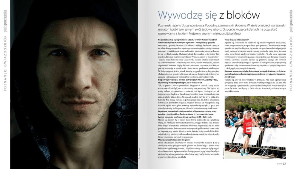 Wywodzę się z bloków Na początku chcę ci pogratulować udziału w Orlen Warsaw Marathon i ukończenia go ze znakomitym wynikiem – mniej niż trzy godziny. Teraz biegasz relaksacyjnie? Zgadza się. Zwłaszcza, że udało mi się zarazić bieganiem moją żonę, która swego czasu nie przepadała za tym sportem. Obecnie mamy swoje sposoby na wspólne bieganie, by ona się nie przeforsowała i żebym ja też mógł trenować w swoim tempie. Muszę pochwalić moją żonę, że radzi sobie coraz lepiej, zdobywa kolejne życiówki. To dla mnie ogromna przyjemność w ten sposób spędzać z nią wspólny czas. Bieganie polecam zresztą każdemu. Czasem trudno się przemóc, zacząć, ale korzyści płynące z wysiłku fizycznego są ogromne. Każdy powinien przynajmniej spróbować, żeby samemu zasmakować tej satysfakcji z kolejnych życiówek i z kolejnych pokonanych dystansów. Dokładnie 2 godziny 58 minut i 20 sekund. Dziękuję. Bardzo się cieszę, że się udało. Przygotowywałem się do tego maratonu siedem miesięcy i muszę przyznać, że oddałem się temu całkowicie, odstawiając nieco na boczny tor na przykład muzykę. Chciałem jednak doprowadzić to do końca. Taki maraton, bieg daje mnóstwo satysfakcji. Wiesz, na sukces w świecie show-biznesu musi złożyć się wiele składowych, czasami totalnie niezależnych od ciebie elementów. Gusty muzyczne, moda, czasem znajomości, czasem odpowiedni moment. Nigdy do końca nie wiem, czy utwór, nad którym pracuję, wkładając w to całe serce i dużo starań, spodoba się słuchaczom. W dużym stopniu jest to jednak kwestią przypadku i szczęśliwego splotu okoliczności. A w sporcie, w bieganiu tak nie ma. Tutaj jest tak, że ile wyćwiczysz, ile wytrenujesz, ile potu z siebie wyciśniesz, taki będzie wynik. Bieganie wyczynowe chyba determinuje szczególnie zdrowy tryb życia: specjalna dieta, unikanie niezdrowego jedzenia czy używek. Starasz się żyć zdrowo? Biegi wyczynowe nie są chyba u ciebie niczym nowym. Źródła podają, że pierwszy maraton przebiegłeś już w wieku 19 lat. Staram się, ale też nie popadam w przesadę. Nie mam opracowanej specjalnej diety, może tylko zwracam większą uwagę na to, co jem. Ale nie rezygnuję z przyjemności czy wypicia drinka przed koncertem tylko po to, by mieć czas lepszy o dwie minuty. Staram się zachować w tym wszystkim umiar. Tak, to prawda. Można powiedzieć, biegałem w czasach, kiedy udział w maratonach nie był jeszcze tak modny czy popularny. Nie byłem też wtedy dobrze przygotowany – zarówno pod kątem treningowym, jak i sprzętowym. Biegłem w bawełnianej koszulce, która poocierała mi całe ciało, z sutków lała się krew. Na stopach miałem buty do gry w piłkę, tzw. halówki. Nie muszę mówić, że potem przez trzy dni ledwo chodziłem. Potem jakoś porzuciłem bieganie, na jakieś dziesięć lat. Nastąpił taki etap w moim życiu, że na plan pierwszy wysunęła się muzyka, a poza tym uważałem wtedy, że bieganie jest dla osób znacznie starszych ode mnie. W połowie marca ukończyłeś poznański półmaraton z czasem, który zgodnie z przelicznikiem Danielsa, dawał ci – przynajmniej teoretycznie szansę, że ukończysz bieg z wynikiem 2:59. I dałeś radę. Staram się zawsze, by w moim życiu teoria pokrywała się z praktyką. Myślę, że wtedy jest łatwiej funkcjonować, osiągać kolejne cele. Bardzo lubię biegać w Poznaniu. Pomijam doskonałą organizację, ale dla mnie przede wszystkim duże znaczenie ma wsparcie publiczności, która czeka na biegaczy przy mecie. Wyobraź sobie dziesięć tysięcy osób, które kibicują i tuż przy mecie żywiołowo okazują swoją radość. Aż chce się dalej biegać i zapomina się wtedy o zmęczeniu. 22 3/2015 Moim absolutnym szczytem był właśnie warszawski maraton. I na tę chwilę nie mam sprecyzowanych planów na dalsze biegi – zrobię sobie kilkunastotygodniową przerwę. Najbliższe cztery miesiące będą wypełnione koncertami, a potem siadam do nagrywania płyty, którą chciałbym skończyć na wiosnę przyszłego roku. Lubię nagrywać jesienią, w związku z tym wszystko dobrze się składa. Fot. Antos Sobucki Fot. Andrzej Jenek Masz już jakieś kolejne cele biegowe? 3/2015 23 POZNAŃSKI GWIAZDOZBIÓR POZNAŃSKI GWIAZDOZBIÓR Poznański raper o duszy sportowca. Pogodny, szarmancki i skromny. Właśnie przebiegł warszawski maraton i pobił tym samym swój życiowy rekord. O sporcie, muzyce i planach na przyszłość rozmawiamy z Jackiem Mejerem, znanym większości jako Mezo. Oczywiście! Suchy Las jest tak niedaleko Poznania, że nie mam wrażenia odległości. Kiedy ktoś mnie pyta, skąd jestem, odpowiadam, że z Poznania. Wychowałem się na Osiedlu Przyjaźni na Winogradach, gdzie mieszkałem przez 21 lat. Całe dzieciństwo, cała edukacja począwszy od żłobka, a skończywszy na Liceum Ogólnokształcącym nr 9 – wszystko wiąże się z blokowiskiem na Osiedlu Przyjaźni. Potem mieszkałem przez rok na Jeżycach, na Staszica, a potem na Osiedlu Kopernika – trochę więc przemieszczałem się po Poznaniu i mogłem poznać miasto z różnych stron. Do Suchego Lasu przeprowadziłem się, kiedy miałem 25 lat. Wybudowałem tam dom, znalazłem swoje miejsce. Bardzo lubię nazwę mojej miejscowości – Suchy Las. Brzmi trochę bajkowo. To prawda. Pamiętam, że kiedyś w pewnym hotelu w Warszawie, pani recepcjonistka spisując moje dane, spojrzała na adres i westchnęła: „Jak ja bym chciała mieszkać w Suchym Lesie”. Rzeczywiście, nazwa jest urokliwa. Kiedy przyjeżdżają do ciebie goście spoza Poznania, gdzie najpierw ich prowadzisz? Pewnie zabrzmię mało oryginalnie, ale zacząłbym od płyty Starego Rynku. Pewnie też pokazałbym Maltę i Nowe Zoo, które jest niezwykłym miejscem do spacerowania. 24 3/2015 Teledysk do utworu „Kryzys” nagrywaliście na szczycie jakiegoś wieżowca. Nie może to być budynek Uniwersytetu Ekonomicznego, bo 