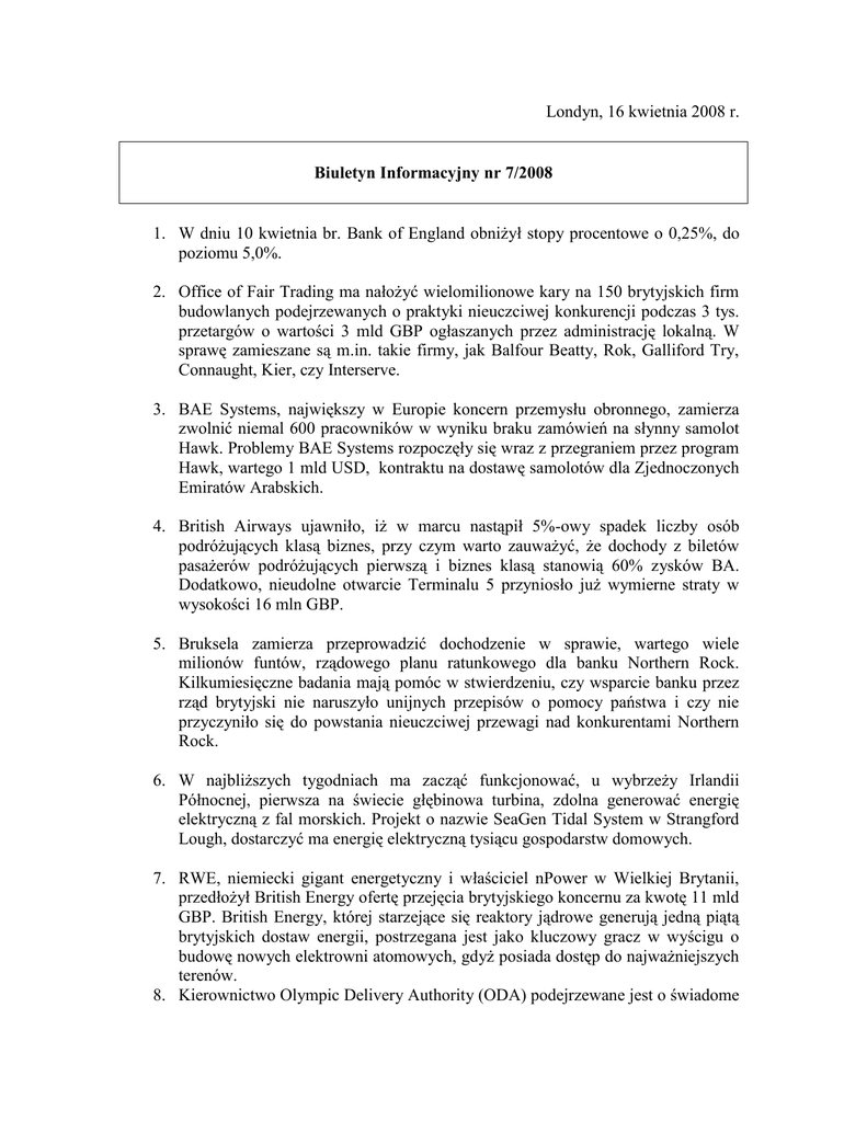 Londyn, 16 kwietnia 2008 r. Biuletyn Informacyjny nr 7/2008 1. W dniu 10 kwietnia br. Bank of England obniżył stopy procentowe o 0,25%, do poziomu 5,0%. 2. Office of Fair Trading ma nałożyć wielomilionowe kary na 150 brytyjskich firm budowlanych podejrzewanych o praktyki nieuczciwej konkurencji podczas 3 tys. przetargów o wartości 3 mld GBP ogłaszanych przez administrację lokalną. W sprawę zamieszane są m.in. takie firmy, jak Balfour Beatty, Rok, Galliford Try, Connaught, Kier, czy Interserve. 3. BAE Systems, największy w Europie koncern przemysłu obronnego, zamierza zwolnić niemal 600 pracowników w wyniku braku zamówień na słynny samolot Hawk. Problemy BAE Systems rozpoczęły się wraz z przegraniem przez program Hawk, wartego 1 mld USD, kontraktu na dostawę samolotów dla Zjednoczonych Emiratów Arabskich. 4. British Airways ujawniło, iż w marcu nastąpił 5%-owy spadek liczby osób podróżujących klasą biznes, przy czym warto zauważyć, że dochody z biletów pasażerów podróżujących pierwszą i biznes klasą stanowią 60% zysków BA. Dodatkowo, nieudolne otwarcie Terminalu 5 przyniosło już wymierne straty w wysokości 16 mln GBP. 5. Bruksela zamierza przeprowadzić dochodzenie w sprawie, wartego wiele milionów funtów, rządowego planu ratunkowego dla banku Northern Rock. Kilkumiesięczne badania mają pomóc w stwierdzeniu, czy wsparcie banku przez rząd brytyjski nie naruszyło unijnych przepisów o pomocy państwa i czy nie przyczyniło się do powstania nieuczciwej przewagi nad konkurentami Northern Rock. 6. W najbliższych tygodniach ma zacząć funkcjonować, u wybrzeży Irlandii Północnej, pierwsza na świecie głębinowa turbina, zdolna generować energię elektryczną z fal morskich. Projekt o nazwie SeaGen Tidal System w Strangford Lough, dostarczyć ma energię elektryczną tysiącu gospodarstw domowych. 7. RWE, niemiecki gigant energetyczny i właściciel nPower w Wielkiej Brytanii, przedłożył British Energy ofertę przejęcia brytyjskiego koncernu za kwotę 11 mld GBP. British Energy, której starzejące się reaktory jądrowe generują jedną piątą brytyjskich dostaw energii, postrzegana jest jako kluczowy gracz w wyścigu o budowę nowych elektrowni atomowych, gdyż posiada dostęp do najważniejszych terenów. 8. Kierownictwo Olympic Delivery Authority (ODA) podejrzewane jest o świadome ukrywanie rzeczywistych kosztów olimpiady w Londynie w 2012 roku. W ostatnim czasie wyszło na jaw, że prawdziwe koszty centrum pływackiego wzrosły już czterokrotnie w stosunku do tych, jakie określone zostały w pierwotnym przetargu, koszty budowy stadionu głównego wzrosły z 280 mln GBP do 496 mln GBD, a welodromu z 28 mln GBP do 80 mln GBP. Rosnące koszty również innych miejsc budowanych z przeznaczeniem na igrzyska wzbudzają obawy, iż zakładany budżet w wysokości 9,3 mld GBP nie zostanie dotrzymany. Były szef ODA twierdzi, że rzeczywiste koszty kształtują się obecnie na poziomie 20 mld GBP. 9. Association of Train Operating Companies opublikowało dokument, w którym przedstawiło wizję rozwoju kolejnictwa w Wielkiej Brytanii do roku 2057. Zgodnie z nią, o ile obecny trend się utrzyma, należy liczyć się z ponad trzykrotnym zwiększeniem liczby pasażerów w tym okresie. Oznaczałoby to potrzebę wybudowania tysięcy mil nowych szybkobieżnych (200 mil/godzinę) linii kolejowych. Autorzy dokumentu sugerują powstanie trzech linii kolejowych wychodzących z Londynu (dwie łączące stolicę z Edynburgiem i Glasgow, trzecia ze stolicą Walii, Cardiff) oraz czwartej, łączącej Manchester z Sheffield i Leeds. Niezbędne byłoby również powstanie tuneli kolejowych pod Morzem Irlandzkim oraz pod Kanałem LaManche. 10. W ramach jednego z największych planów budowlanych obecnej generacji w Wielkiej Brytanii, zapowiedzianego przez premiera Browna, na brytyjskich wsiach powstaną tysiące tanich domów dla lokalnych społeczności. Umożliwić ma to osobom pracującym na wsi (rolnicy, nauczyciele, rzemieślnicy) dostęp do pierwszego w ich życiu domu, na który będzie ich stać. 11. Osoby, pragnące wziąć po raz pierwszy kredyt na zakup mieszkania, nie będą mogły tego uczynić bez odpowiedniego depozytu. Bank Abbey, trzeci pod względem udzielanych kredytów mieszkaniowych kredytodawca w Wielkiej Brytanii, jako ostatni zaniechał udzielania kredytów, pokrywających w 100%-ach cenę kupowanej nieruchomości. Obecnie, w celu uzyskania kredytu mieszkaniowego, przeciętny kredytobiorca, ubiegający się o kredyt po raz pierwszy, musi zaoszczędzić średnio 7,5 tys. GBP na 5%-owy depozyt, przy średniej wartości pierwszego mieszkania w wysokości 148 tys. GBP. 12. Co trzecia transakcja sprzedaży nieruchomości mieszkaniowych na brytyjskim rynku nie jest realizowana, z powodu trudności kupujących w otrzymaniu kredytów hipotecznych. Stale też zwiększa się liczba pożyczkodawców, którzy ograniczają swoją działalność w tym zakresie. Bank HBOS, największy brytyjski pożyczkodawca hipoteczny, poinformował, że osoby które posiadają mniej niż 25% kwoty transakcji otrzymają gorsze warunki kredytu. 13. Badanie, przeprowadzone przez brytyjską policję (Association of Chief Police Officers), wykazało, iż napływ imigrantów z Europy Środkowo-Wschodniej nie spowodował zwiększenia zjawisk kryminalnych w Wielkiej Brytanii. 14. Na 24 kwietnia br. w Wielkiej Brytanii zapowiadany jest największy od ponad 20 lat strajk o podłożu płacowym. Na ulice wyjść ma ponad 100 tys. urzędników państwowych i nauczycieli, co spowoduje zamknięcie wielu szkół, urzędów pracy, domów pomocy społecznej, biur straży nadbrzeżnej oraz wielu innych instytucji państwowych. 15. Zawirowania na międzynarodowych rynkach finansowych mogą doprowadzić do likwidacji około 40 tys. miejsc pracy w londyńskim City, co oznaczałoby redukcję o ok. 5% ogółu zatrudnionych w sektorze usług finansowych w Londynie i było